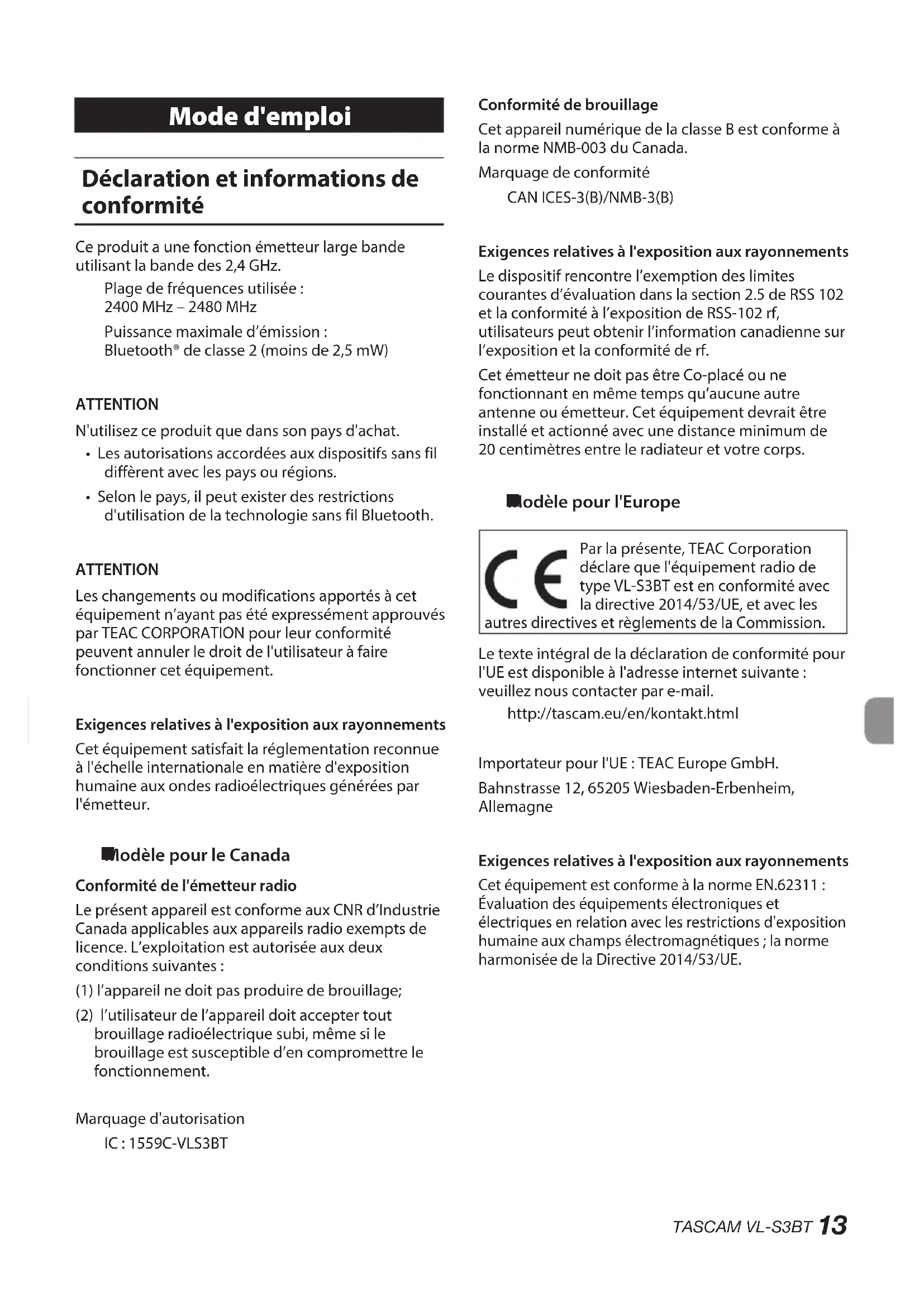 Modèle pour l'Europe Par la présente, TEAC Corporation déclare que l'équipement radio de type VL-S3BT est en conformité avec la directive 2014/53/UE, et avec les autres directives et règlements de la Commission.Le texte intégral de la déclaration de conformité pour l'UE est disponible à l'adresse internet suivante : veuillez nous contacter par e-mail.http://tascam.eu/en/kontakt.htmlImportateur pour l'UE : TEAC Europe GmbH.Bahnstrasse 12, 65205 Wiesbaden-Erbenheim, AllemagneExigences relatives à l'exposition aux rayonnementsCet équipement est conforme à la norme EN.62311 : Évaluation des équipements électroniques et électriques en relation avec les restrictions d'exposition humaine aux champs électromagnétiques ; la norme harmonisée de la Directive 2014/53/UE.14