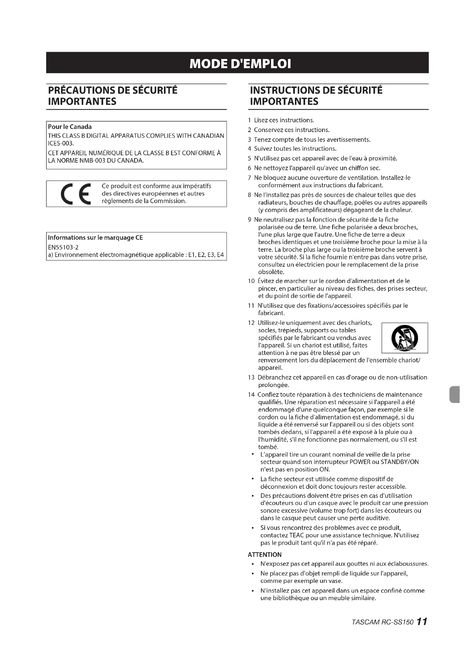 IMPORTANTES 1 Lisez ces instructions. 2 Conservez ces instructions. 3 Tenez compte de tous les avertissements. 4 Suivez toutes les instructions. 5 N'utilisez pas cet appareil avec de l'eau à proximité. 6 Ne nettoyez l'appareil qu'avec un chiffon sec. 7 Ne bloquez aucune ouverture de ventilation. Installez-le conformément aux instructions du fabricant. 8 Ne l'installez pas près de sources de chaleur telles que des radiateurs, bouches de chauffage, poêles ou autres appareils (y compris des amplificateurs) dégageant de la chaleur. 9 Ne neutralisez pas la fonction de sécurité de la fiche polarisée ou de terre. Une fiche polarisée a deux broches, l'une plus large que l'autre. Une fiche de terre a deux broches identiques et une troisième broche pour la mise à la terre. La broche plus large ou la troisième broche servent à votre sécurité. Si la fiche fournie n'entre pas dans votre prise, consultez un électricien pour le remplacement de la prise obsolète. 10 Évitez de marcher sur le cordon d'alimentation et de le pincer, en particulier au niveau des fiches, des prises secteur, et du point de sortie de l'appareil. 11 N'utilisez que des fixations/accessoires spécifiés par le fabricant. 12 Utilisez-le uniquement avec des chariots, socles, trépieds, supports ou tables spécifiés par le fabricant ou vendus avec l'appareil. Si un chariot est utilisé, faites attention à ne pas être blessé par un renversement lors du déplacement de l'ensemble chariot/ appareil. 13 Débranchez cet appareil en cas d'orage ou de non-utilisation prolongée. 14 Confiez toute réparation à des techniciens de maintenance qualifiés. Une réparation est nécessaire si l'appareil a été endommagé d'une quelconque façon, par exemple si le cordon ou la fiche d'alimentation est endommagé, si du liquide a été renversé sur l'appareil ou si des objets sont tombés dedans, si l'appareil a été exposé à la pluie ou à l'humidité, s'il ne fonctionne pas normalement, ou s'il est tombé.