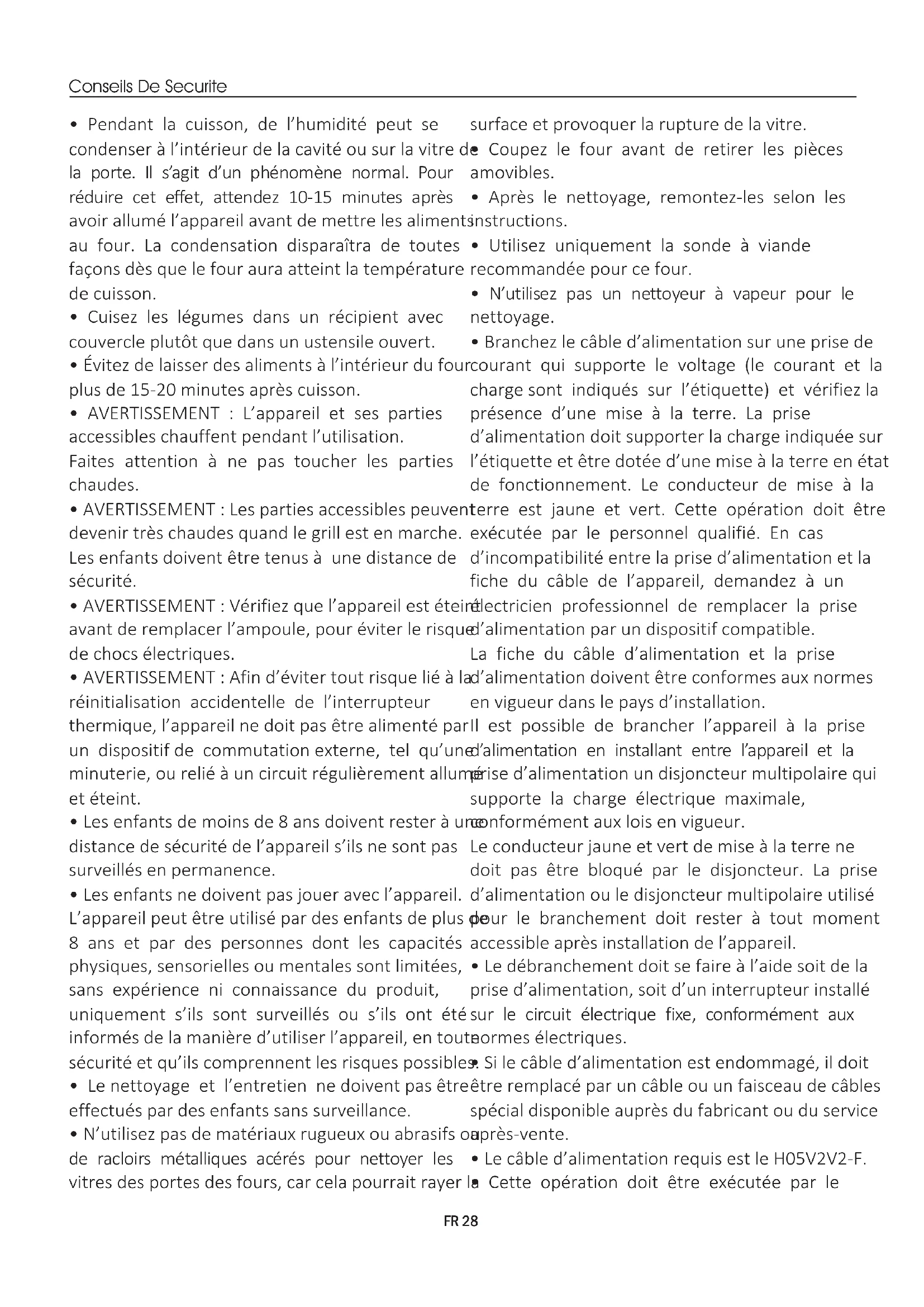 - Cette opération doit être exécutée par le Conseils De Securite FR 28personnel qualifié. Le conducteur de mise à la terre (jaune et vert) doit être environ 10 mm plus long que les autres conducteurs. Pour toutes réparations, contactez le service après-vente en insistant sur l’utilisation de pièces de rechange d’origine.