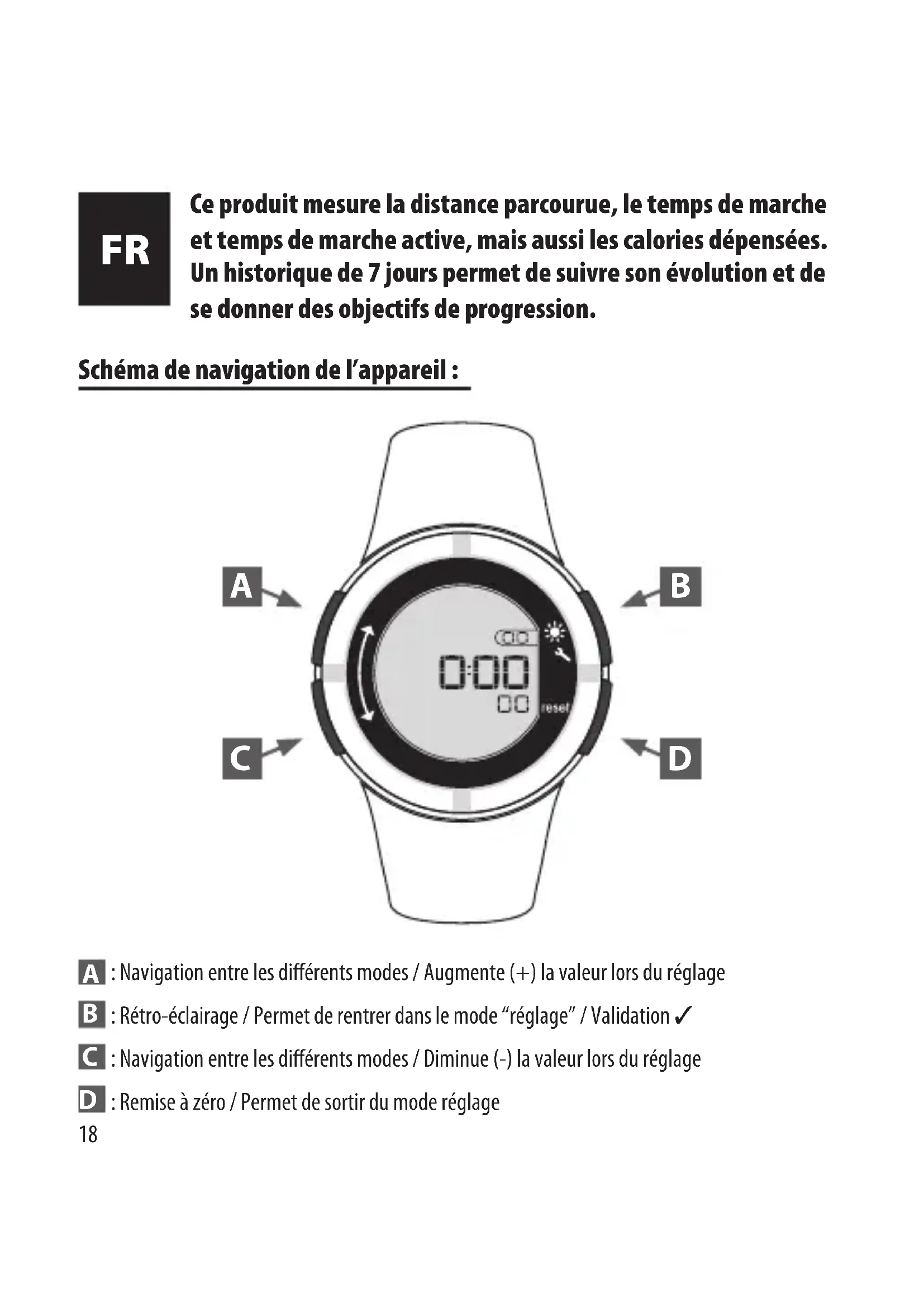 Ce produit mesure la distance parcourue, le temps de marche et temps de marche active, mais aussi les calories dépensées. Un historique de 7 jours permet de suivre son évolution et de se donner des objectifs de progression. A B C D