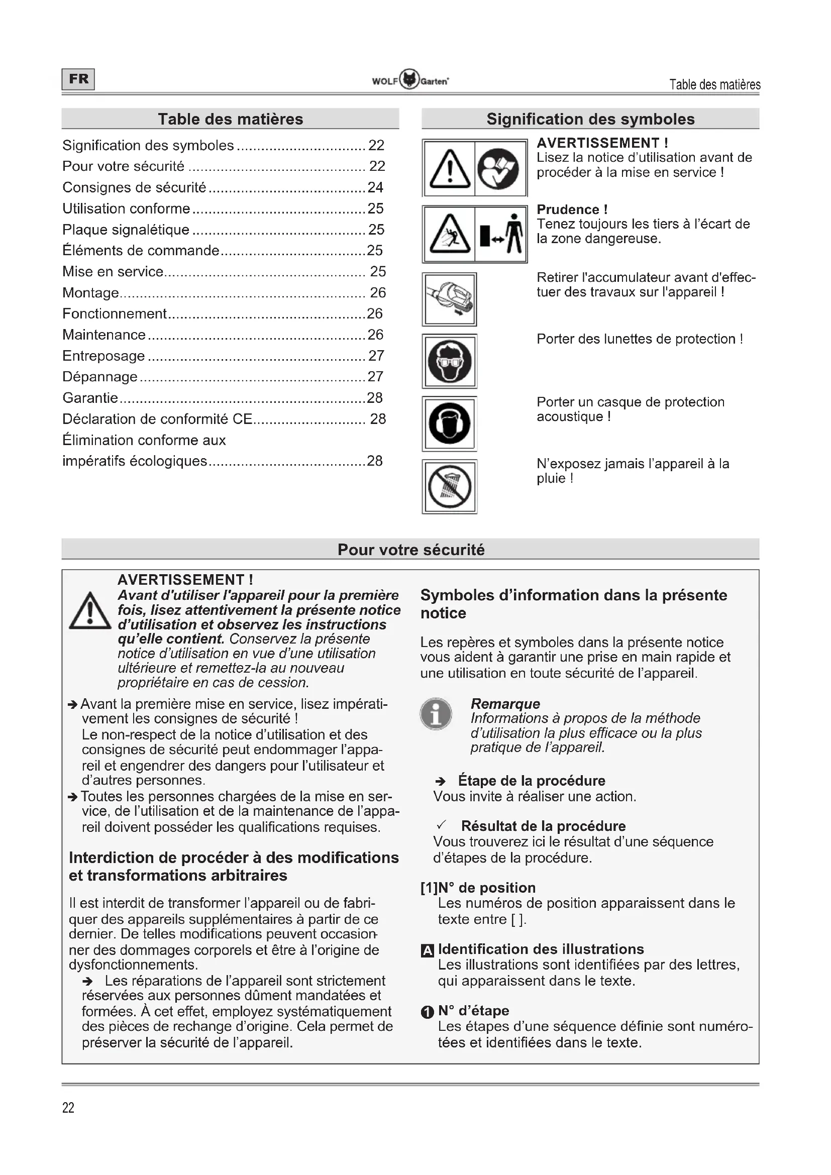 - Élimination conforme aux impératifs écologiques Pour votre sécurité Signication des symboles AVERTISSEMENT ! Lisez la notice d’utilisation avant de procéder à la mise en service ! Prudence ! Tenez toujours les tiers à l’écart de la zone dangereuse. Retirer l'accumulateur avant d'eec- tuer des travaux sur l'appareil ! Porter des lunettes de protection ! Porter un casque de protection acoustique ! N’exposez jamais l’appareil à la pluie !Consignes de sécurité p. 28