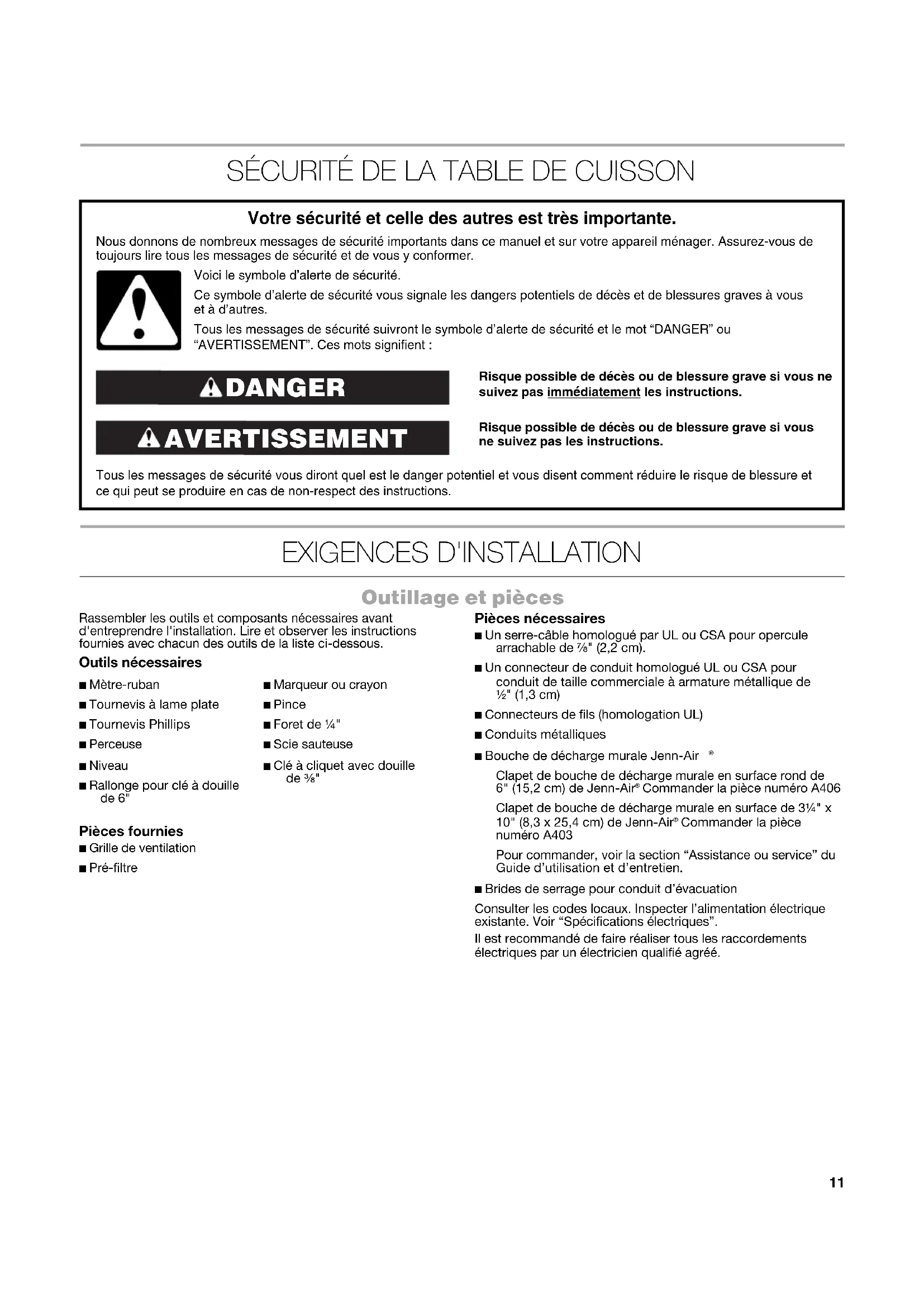 I11 SÉCURITÉ DE LA TABLE DE CUISSON EXIGENCES D'INSTALLATION Outillage et pièces Rassembler les outils et composants nécessaires avant d'entreprendre l'installation. Lire et observer les instructions fournies avec chacun des outils de la liste ci-dessous. Outils nécessaires Pièces fournies ■ Grille de ventilation■ Pré-filtre Pièces nécessaires ■ Un serre-câble homologué par UL ou CSA pour opercule arrachable de ⁷⁄₈" (2,2 cm).■ Un connecteur de conduit homologué UL ou CSA pour conduit de taille commerciale à armature métallique de ¹⁄₂" (1,3 cm) ■ Connecteurs de fils (homologation UL)■ Conduits métalliques■ Bouche de décharge murale Jenn-Air Clapet de bouche de décharge murale en surface rond de 6" (15,2 cm) de Jenn-Air Commander la pièce numéro A406Clapet de bouche de décharge murale en surface de 3¼" x 10" (8,3 x 25,4 cm) de Jenn-Air Commander la pièce numéro A403Pour commander, voir la section “Assistance ou service” du Guide d’utilisation et d’entretien.■ Brides de serrage pour conduit d’évacuationConsulter les codes locaux. Inspecter l’alimentation électrique existante. Voir “Spécifications électriques”.Il est recommandé de faire réaliser tous les raccordements électriques par un électricien qualifié agréé. Risque possible de décès ou de blessure grave si vous ne suivez pas immédiatement les instructions. Risque possible de décès ou de blessure grave si vous ne suivez pas les instructions. Tous les messages de sécurité vous diront quel est le danger potentiel et vous disent comment réduire le risque de blessure et ce qui peut se produire en cas de non-respect des instructions. Votre sécurité et celle des autres est très importante. Nous donnons de nombreux messages de sécurité importants dans ce manuel et sur votre appareil ménager. Assurez-vous de toujours lire tous les messages de sécurité et de vous y conformer. AVERTISSEMENT DANGER Voici le symbole d’alerte de sécurité.Ce symbole d’alerte de sécurité vous signale les dangers potentiels de décès et de blessures graves à vous et à d’autres.Tous les messages de sécurité suivront le symbole d’alerte de sécurité et le mot “DANGER” ou “AVERTISSEMENT”. Ces mots signifient : ■ Mètre-ruban■ Tournevis à lame plate■ Tournevis Phillips■ Perceuse■ Niveau■ Rallonge pour clé à douille de 6" ■ Marqueur ou crayon■ Pince■ Foret de ¼"■ Scie sauteuse■ Clé à cliquet avec douille de ³⁄₈"12 Exigences d'emplacement IMPORTANT : Observer les dispositions de tous les codes et règlements en vigueur. Lors de l’installation de la table de cuisson, utiliser les dimensions minimums indiquées. ■ Afin de supprimer le risque de brûlures ou d'incendie en se penchant au-dessus des unités de surface chauffées, le rangement dans des placards au-dessus des unités de surface doit être évité. Si un rangement dans des placards est envisagé, le risque peut être réduit par l'installation d'une hotte de cuisine opérant horizontalement sur un minimum de 5" (12,7 cm) au-delà du bas des placards. ■ Utiliser les dimensions d’ouverture du plan de travail qui sont indiquées dans ces Instructions d’installation. Les dimensions données sont les espacements minimums et fournissent un dégagement de 0" (0 cm). ■ Une source d'électricité avec liaison à la terre est nécessaire. Voir la section “Spécifications électriques”. ■ Si le placard comporte des tiroirs, ces tiroirs doivent être retirés et l'avant des tiroirs installé sur l'avant du placard. IMPORTANT : Il n'est pas possible d'installer un four encastré sous plan de travail sous ce produit. Dimensions du produit Table de cuisson de 30" (76,2 cm) - Pour les modèles standard et électriques Table de cuisson de 36" (91,4 cm) - Pour les modèles standard et électriques A. Emplacement de la plaque signalétiqueB. 20 " (52,3 cm)C. 22" (55,9 cm)A. 29 " (75,6 cm)B. 12 " (31,8 cm) axe central du produit jusqu'au bord du logement des brûleursC. 12 " (31,8 cm)D. 28 " (72,1 cm)E. 12 " (31,8 cm)F. Dégagement minimal de 2" (5,1 cm) recommandé entre la caisse et le moteur G. 18" (45,7 cm) H. 4