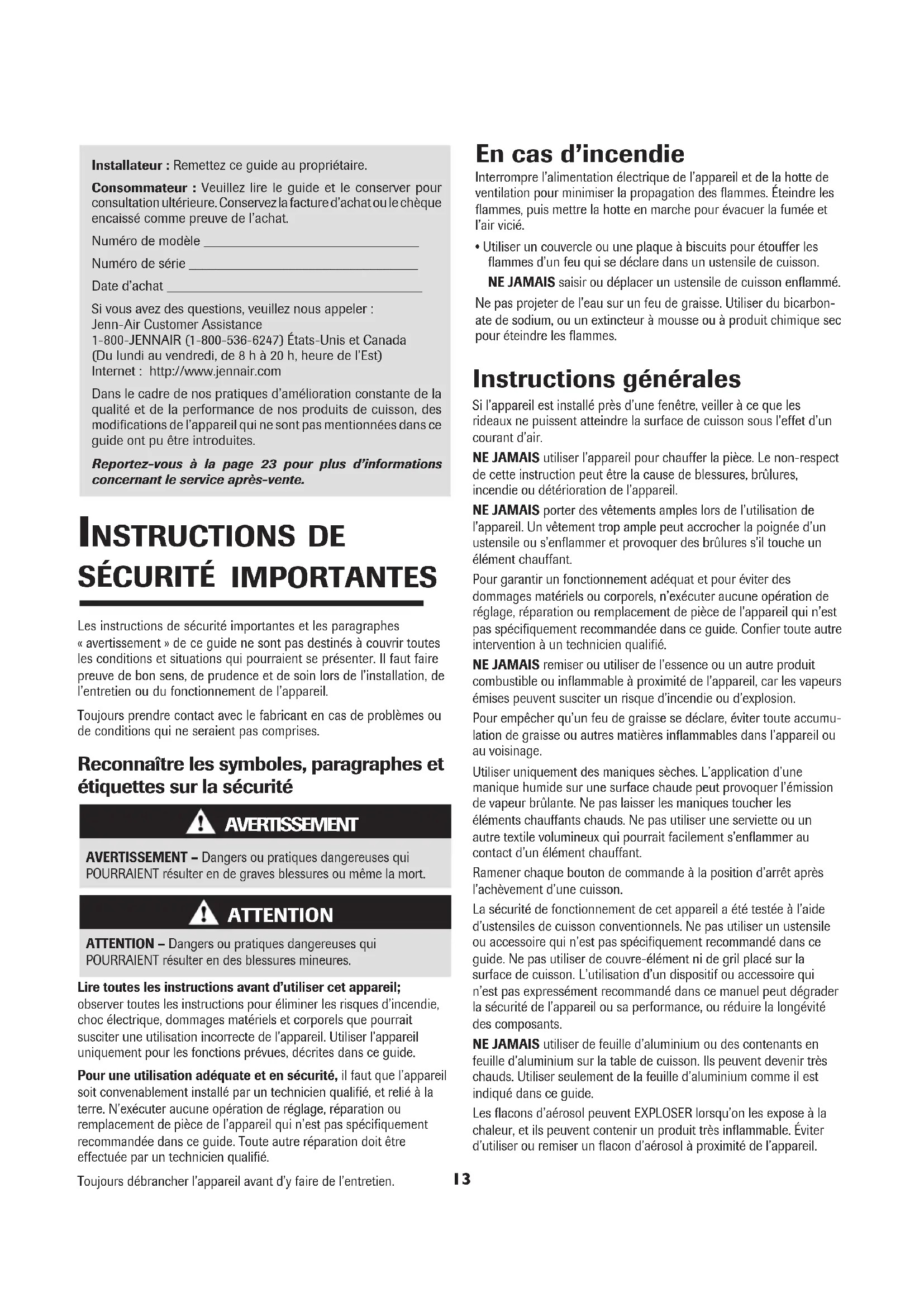 d’une quelconque violation des garanties. Certains États ou certaines provinces interdisent l’exclusion ou la limitation des dommages indirects ou accessoires. Il est donc possible que l’exclusion ci-dessus ne s’applique pas à vous. Si vous avez besoin d’aide Consultez d’abord la section sur le dépannage du guide d’utilisation et d’entretien ou appelez Maytag Services, SARL, Service à la clientèle de Jenn-Air au 1 800 JENNAIR (1 800 536-6247) aux États-Unis et au Canada. Pour obtenir un service en vertu de la garantie Pour localiser une entreprise de réparation autorisée dans votre région, prenez contact avec le détaillant auprès duquel vous avez acheté l’appareil ou appelez Maytag Services, SARL, Service à la clientèle de Jenn-Air. Si le service obtenu en vertu de la garantie ne vous satisfait pas, veuillez écrire ou téléphoner à : Maytag Services, SARL À l’attention du CAIR