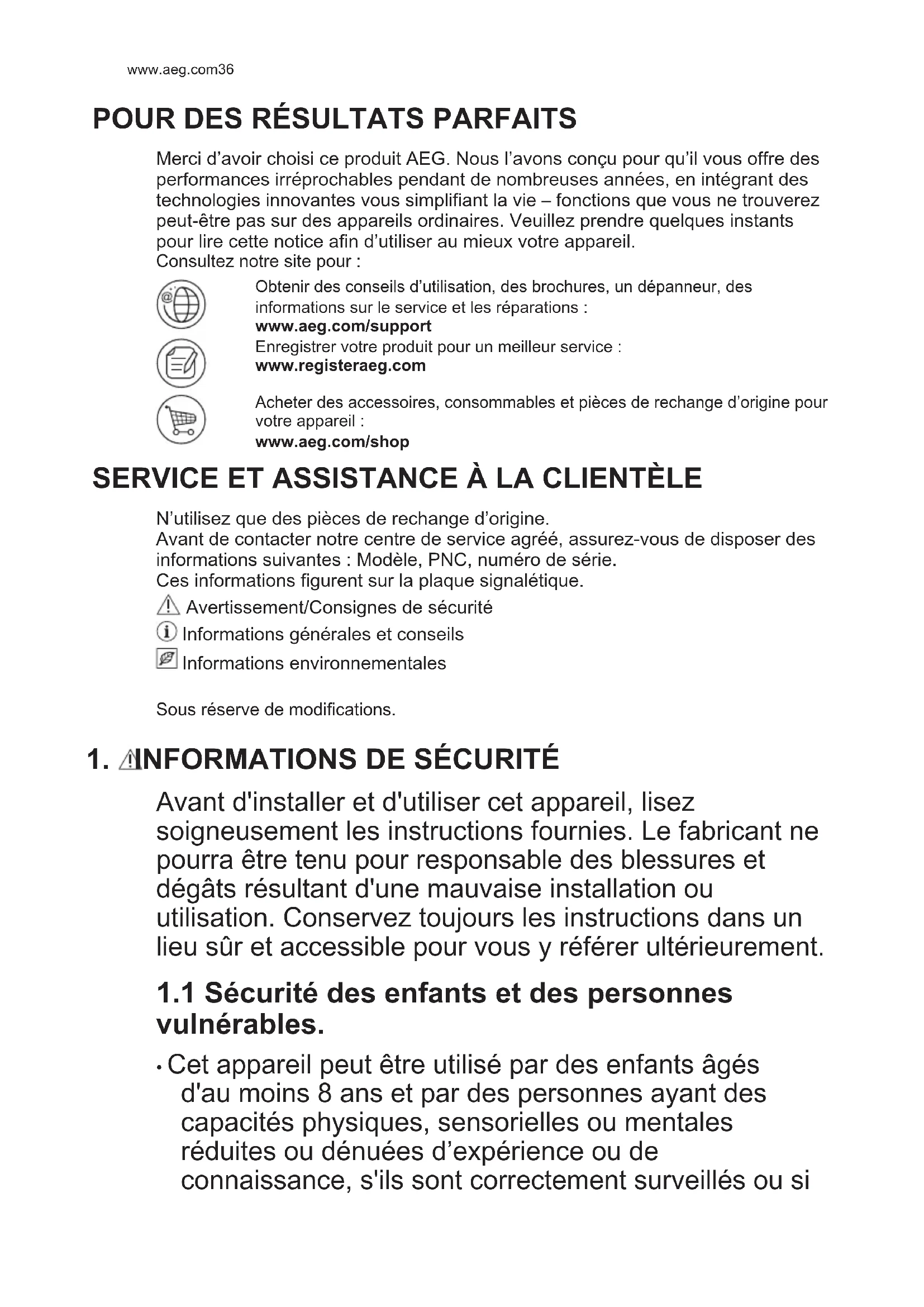 - Cet appareil peut être utilisé par des enfants âgés d'au moins 8 ans et par des personnes ayant des capacités physiques, sensorielles ou mentales réduites ou dénuées d’expérience ou de connaissance, s'ils sont correctement surveillés ou si www.aeg.com36des instructions relatives à l'utilisation de l'appareil en toute sécurité leur ont été données et s’ils comprennent les risques encourus.