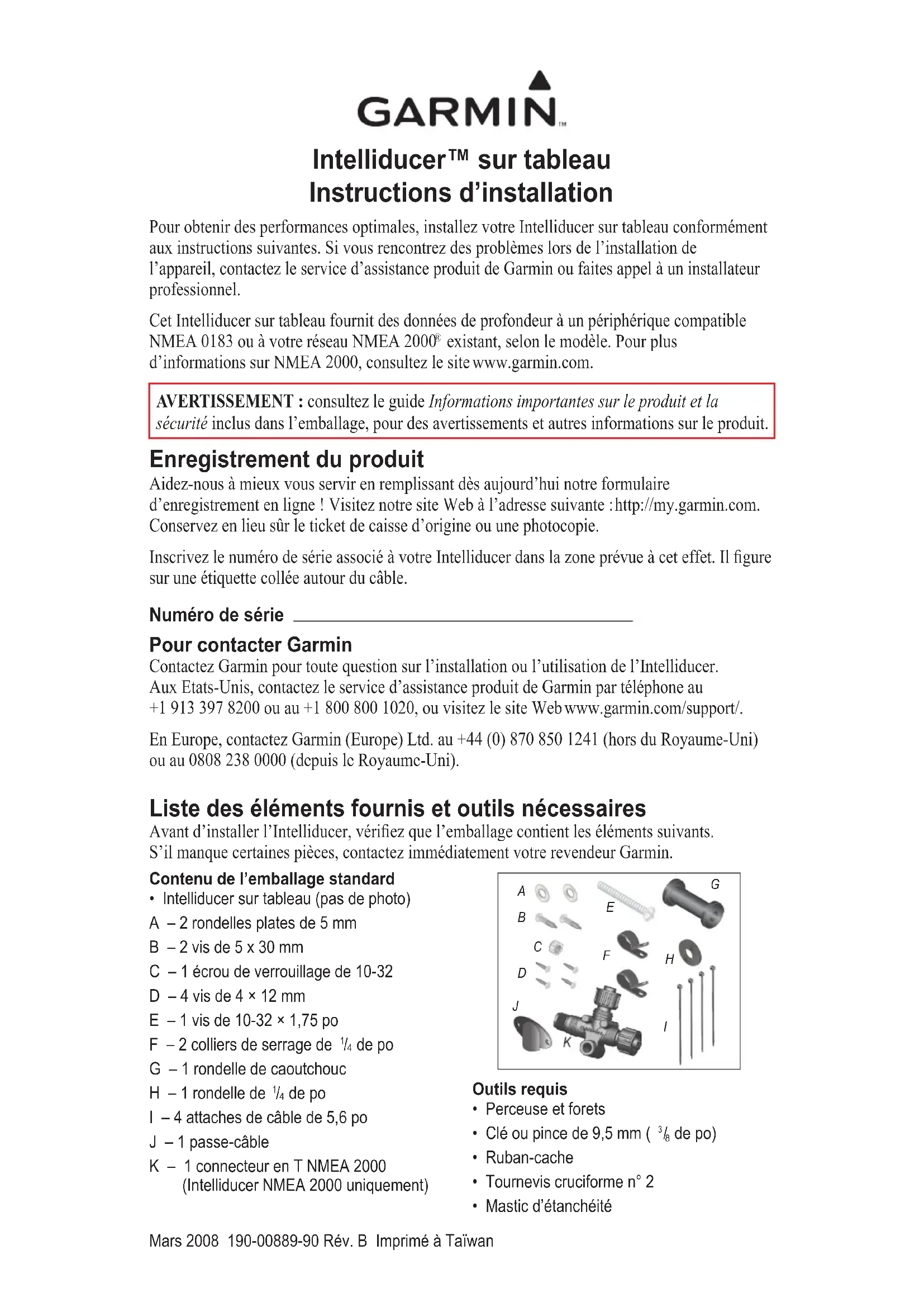 sécurité inclus dans l’emballage, pour des avertissements et autres informations sur le produit. Enregistrement du produit Aidez-nous à mieux vous servir en remplissant dès aujourd’hui notre formulaire d’enregistrement en ligne ! Visitez notre site Web à l’adresse suivante : http://my.garmin.com. Conservez en lieu sûr le ticket de caisse d’origine ou une photocopie. Inscrivez le numéro de série associé à votre Intelliducer dans la zone prévue à cet effet. Il gure sur une étiquette collée autour du câble. Numéro de série Pour contacter Garmin Contactez Garmin pour toute question sur l’installation ou l’utilisation de l’Intelliducer. Aux Etats-Unis, contactez le service d’assistance produit de Garmin par téléphone au +1 913 397 8200 ou au +1 800 800 1020, ou visitez le site Web www.garmin.com/support/. En Europe, contactez Garmin (Europe) Ltd. au +44 (0) 870 850 1241 (hors du Royaume-Uni) ou au 0808 238 0000 (depuis le Royaume-Uni). Liste des éléments fournis et outils nécessaires Avant d’installer l’Intelliducer, vériez que l’emballage contient les éléments suivants. S’il manque certaines pièces, contactez immédiatement votre revendeur Garmin. Contenu de l’emballage standard