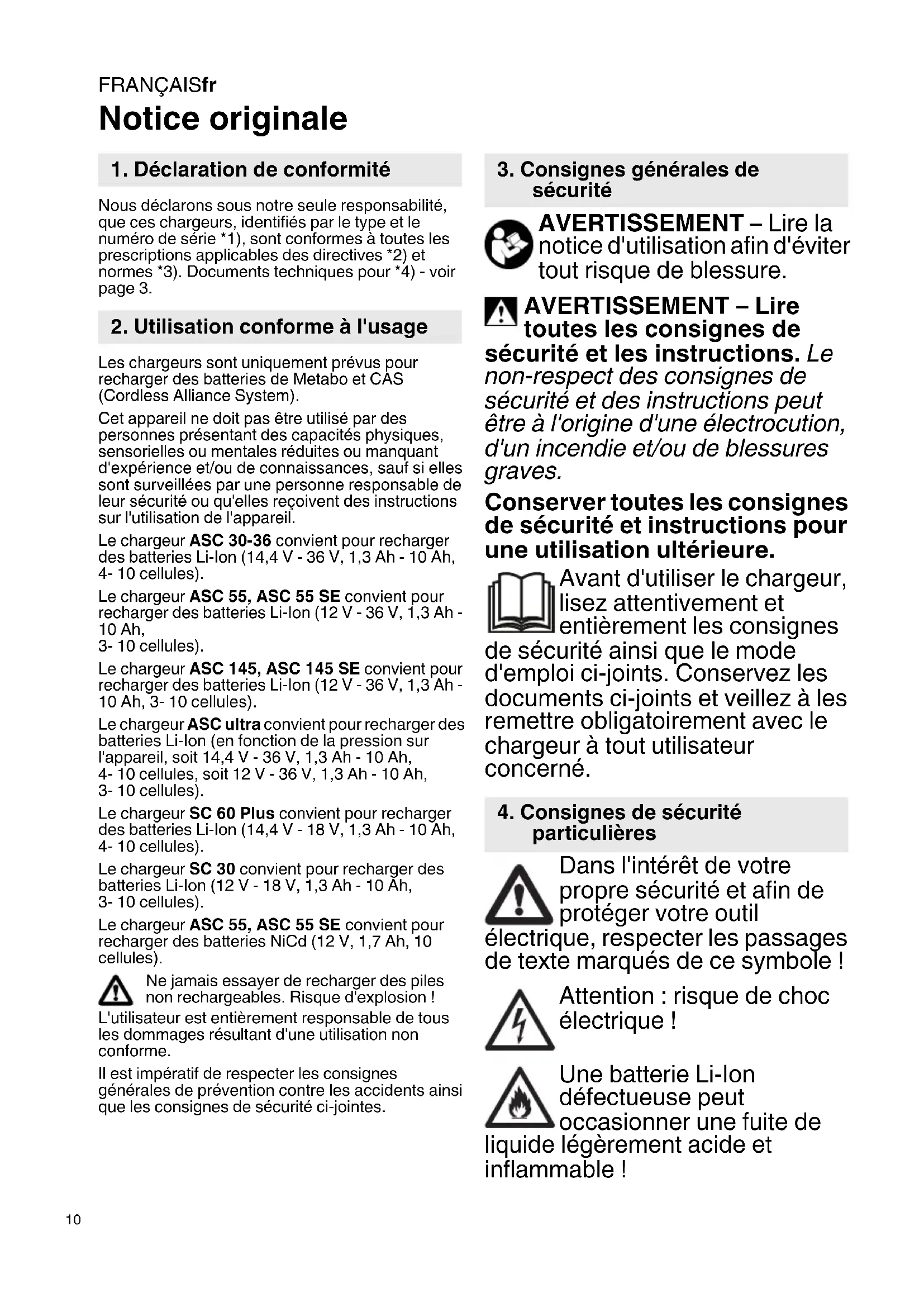 Notice originale Nous déclarons sous notre seule responsabilité, que ces chargeurs, identifiés par le type et le numéro de série *1), sont conformes à toutes les prescriptions applicables des directives *2) et normes *3). Documents techniques pour *4) - voir page 3. Les chargeurs sont uniquement prévus pour recharger des batteries de Metabo et CAS (Cordless Alliance System). Cet appareil ne doit pas être utilisé par des personnes présentant des capacités physiques, sensorielles ou mentales réduites ou manquant d'expérience et/ou de connaissances, sauf si elles sont surveillées par une personne responsable de leur sécurité ou qu'elles reçoivent des instructions sur l'utilisation de l'appareil. Le chargeur ASC 30-36 convient pour recharger des batteries Li-Ion (14,4 V - 36 V, 1,3 Ah - 10 Ah,