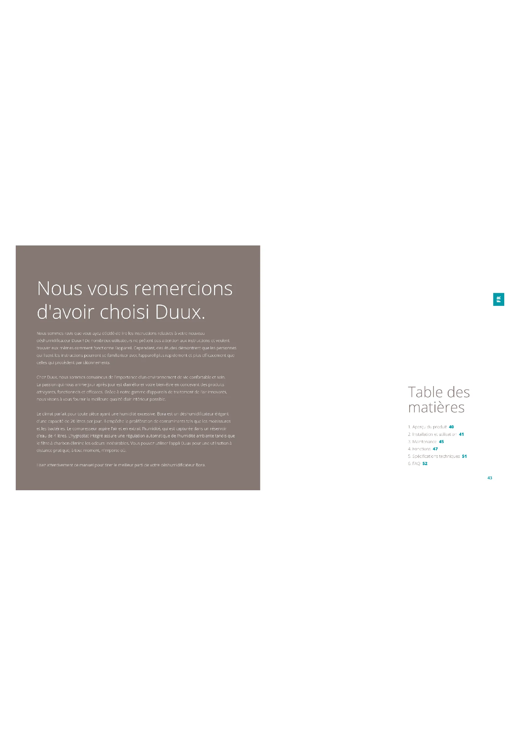 Nous vous remercions d'avoir choisi Duux. Nous sommes ravis que vous ayez décidé de lire les instructions relatives à votre nouveau déshumidicateur Duux! De nombreux utilisateurs ne prêtent pas attention aux instructions et veulent trouver eux-mêmes comment fonctionne l’appareil. Cependant, des études démontrent que les personnes qui lisent les instructions pourront se familiariser avec l’appareil plus rapidement et plus ecacement que celles qui procèdent par tâtonnements. Chez Duux, nous sommes convaincus de l’importance d’un environnement de vie confortable et sain. La passion qui nous anime jour après jour est d’améliorer votre bien-être en concevant des produits attrayants, fonctionnels et ecaces. Grâce à notre gamme d’appareils de traitement de l’air innovants, nous visons à vous fournir la meilleure qualité d’air intérieur possible. Le climat parfait pour toute pièce ayant une humidité excessive. Bora est un déshumidicateur élégant d’une capacité de 20 litres par jour. Il empêche la prolifération de contaminants tels que les moisissures et les bactéries. Le compresseur aspire l’air et en extrait l’humidité, qui est capturée dans un réservoir d’eau de 4 litres. L’hygrostat intégré assure une régulation automatique de l’humidité ambiante tandis que le ltre à charbon élimine les odeurs indésirables. Vous pouvez utiliser l’appli Duux pour une utilisation à distance pratique, à tout moment, n’importe où. Lisez attentivement ce manuel pour tirer le meilleur parti de votre déshumidicateur Bora.