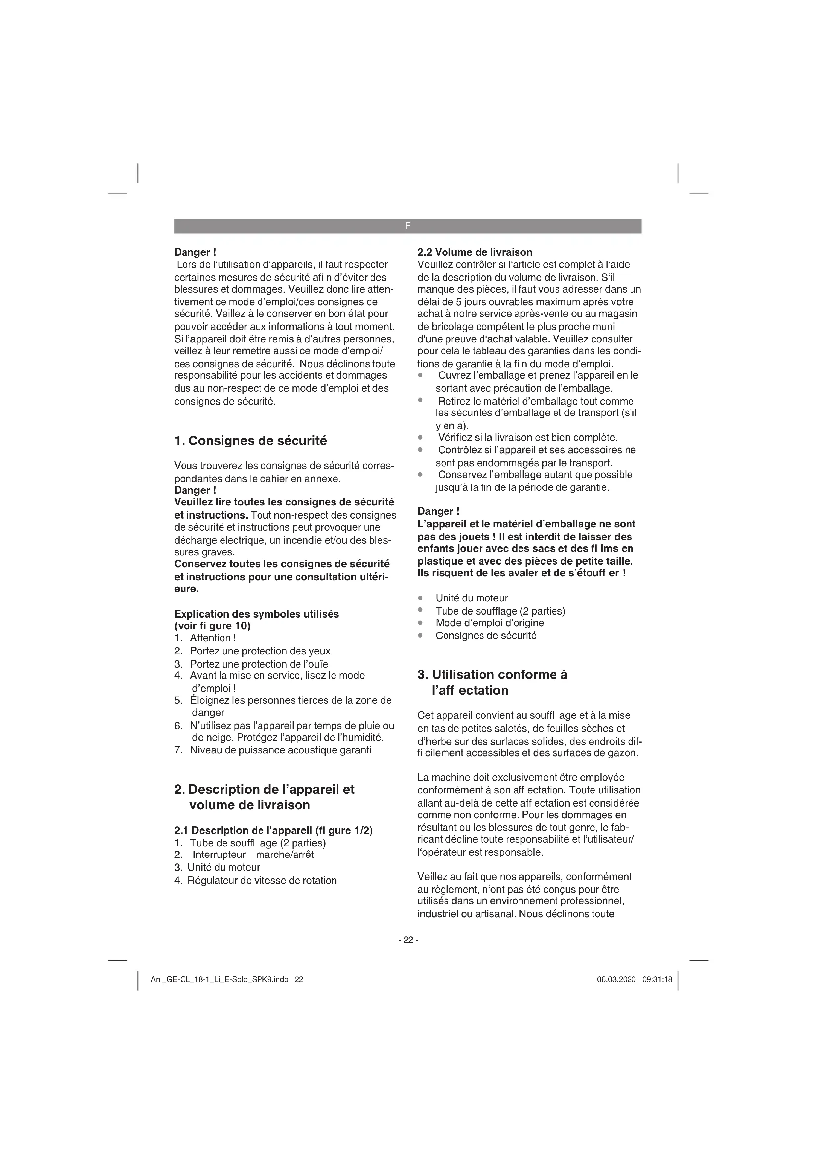 l’aff ectation Cet appareil convient au souffl age et à la mise en tas de petites saletés, de feuilles sèches et d’herbe sur des surfaces solides, des endroits dif- fi cilement accessibles et des surfaces de gazon. La machine doit exclusivement être employée conformément à son aff ectation. Toute utilisation allant au-delà de cette aff ectation est considérée comme non conforme. Pour les dommages en résultant ou les blessures de tout genre, le fab- ricant décline toute responsabilité et l‘utilisateur/ l‘opérateur est responsable. Veillez au fait que nos appareils, conformément au règlement, n‘ont pas été conçus pour être utilisés dans un environnement professionnel, industriel ou artisanal. Nous déclinons toute Anl_GE-CL_18-1_Li_E-Solo_SPK9.indb 22Anl_GE-CL_18-1_Li_E-Solo_SPK9.indb 22 06.03.2020 09:31:1806.03.2020 09:31:18F