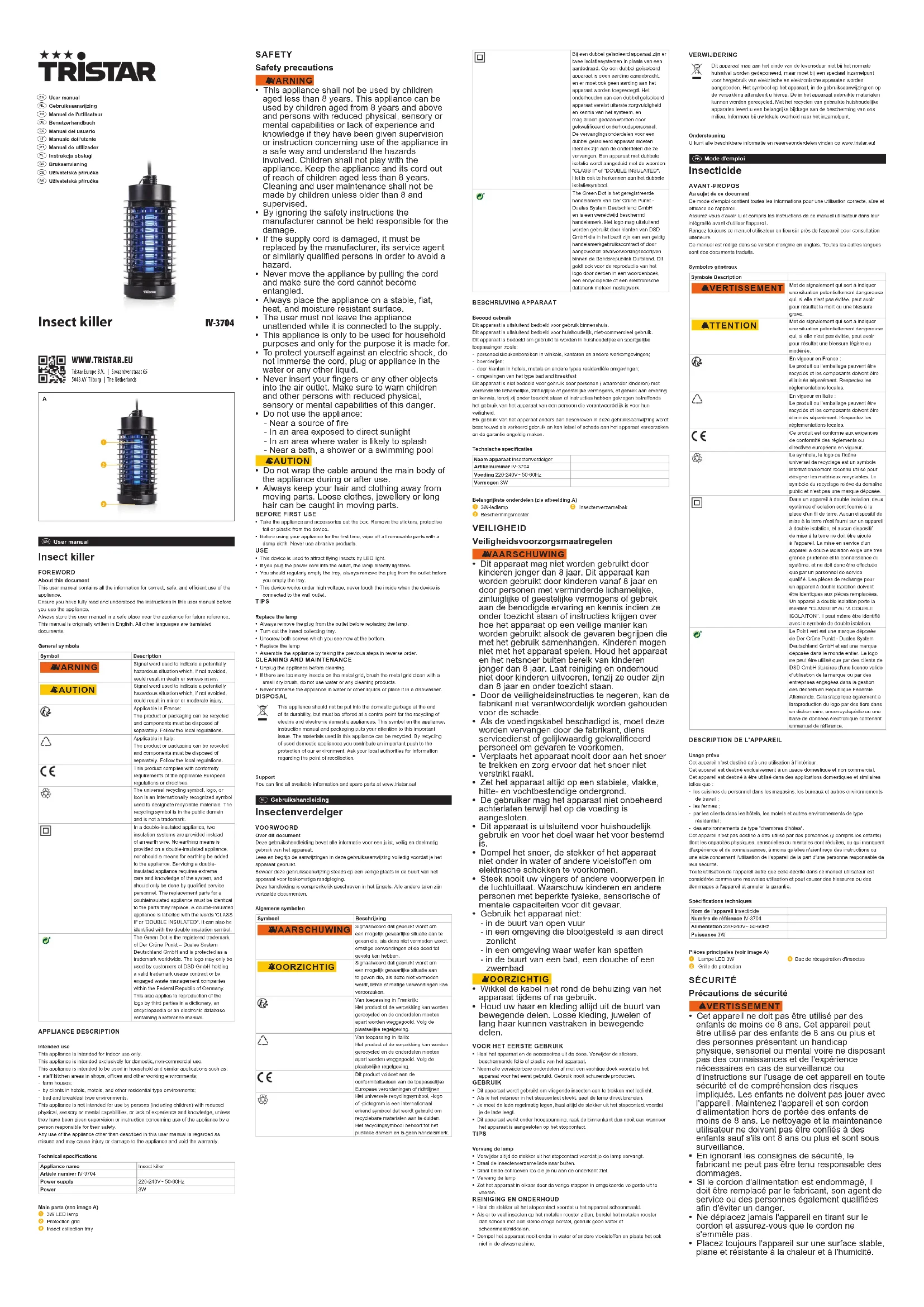 VERWIJDERINGDit apparaat mag aan het einde van de levensduur niet bij het normale huisafval worden gedeponeerd, maar moet bij een speciaal inzamelpunt voor hergebruik van elektrische en elektronische apparaten worden aangeboden. Het symbool op het apparaat, in de gebruiksaanwijzing en op de verpakking attendeert u hierop. De in het apparaat gebruikte materialen kunnen worden gerecycled. Met het recyclen van gebruikte huishoudelijke apparaten levert u een belangrijke bijdrage aan de bescherming van ons milieu. Informeer bij uw lokale overheid naar het inzamelpunt.OndersteuningU kunt alle beschikbare informatie en reserveonderdelen vinden op www.tristar.eu! Mode d'emploi Insecticide AVANT-PROPOSAu sujet de ce documentCe mode d'emploi contient toutes les informations pour une utilisation correcte, sûre et efficace de l'appareil.Assurez-vous d'avoir lu et compris les instructions de ce manuel utilisateur dans leur intégralité avant d'utiliser l'appareil.Rangez toujours ce manuel utilisateur en lieu sûr près de l'appareil pour consultation ultérieure.Ce manuel est rédigé dans sa version d'origine en anglais. Toutes les autres langues sont des documents traduits.Symboles générauxSymbole Description 6 AVERTISSEMENT Mot de signalement qui sert à indiquer une situation potentiellement dangereuse qui, si elle n'est pas évitée, peut avoir pour résultat la mort ou une blessure grave. 6 ATTENTION Mot de signalement qui sert à indiquer une situation potentiellement dangereuse qui, si elle n'est pas évitée, peut avoir pour résultat une blessure légère ou modérée.En vigueur en France :Le produit ou l'emballage peuvent être recyclés et les composants doivent être éliminés séparément. Respectez les réglementations locales.En vigueur en Italie :Le produit ou l'emballage peuvent être recyclés et les composants doivent être éliminés séparément. Respectez les réglementations locales.Ce produit est conforme aux exigences de conformité des règlements ou directives européens en vigueur.Le symbole, le logo ou l'icône universel de recyclage est un symbole internationalement reconnu utilisé pour désigner les matériaux recyclables. Le symbole du recyclage relève du domaine public et n'est pas une marque déposée.Dans un appareil à double isolation, deux systèmes d'isolation sont fournis à la place d'un l de terre. Aucun dispositif de mise à la terre n'est fourni sur un appareil à double isolation, et aucun dispositif de mise à la terre ne doit être ajouté à l'appareil. La mise en service d'un appareil à double isolation exige une très grande prudence et la connaissance du système, et ne doit donc être eectuée que par un personnel de service qualié. Les pièces de rechange pour un appareil à double isolation doivent être identiques aux pièces remplacées. Un appareil à double isolation porte la mention "CLASSE II" ou "À DOUBLE ISOLAITON". Il peut même être identié avec le symbole de double isolation.Le Point vert est une marque déposée de Der Grüne Punkt - Duales System Deutschland GmbH et est une marque déposée dans le monde entier. Le logo ne peut être utilisé que par des clients de DSD GmbH titulaires d'une licence valide d'utilisation de la marque ou par des entreprises engagées dans la gestion des déchets en République Fédérale Allemande. Cela s'applique également à lareproduction du logo par des tiers dans un dictionnaire, uneencyclopédie ou une base de données électronique contenant unmanuel de référence.DESCRIPTION DE L'APPAREILUsage prévuCet appareil n'est destiné qu'à une utilisation à l'intérieur.Cet appareil est destiné exclusivement à un usage domestique et non commercial.Cet appareil est destiné à être utilisé dans des applications domestiques et similaires telles que :- les cuisines du personnel dans les magasins, les bureaux et autres environnements de travail ;- les fermes ;- par les clients dans les hôtels, les motels et autres environnements de type résidentiel ;- des environnements de type "chambres d'hôtes".Cet appareil n'est pas destiné à être utilisé par des personnes (y compris les enfants) dont les capacités physiques, sensorielles ou mentales sont réduites, ou qui manquent d'expérience et de connaissances, à moins qu'elles n'aient reçu des instructions ou une aide concernant l'utilisation de l'appareil de la part d'une personne responsable de leur sécurité.Toute utilisation de l'appareil autre que celle décrite dans ce manuel utilisateur est considérée comme une mauvaise utilisation et peut causer des blessures ou des dommages à l'appareil et annuler la garantie.Spécications techniquesNom de l'appareil InsecticideNuméro de référence IV-3704Alimentation 220-240V~ 50-60HzPuissance 3WPièces principales (voir image A) Lampe LED 3W Grille de protection Bac de récupération d'insectes SÉCURITÉ Précautions de sécurité AVERTISSEMENT