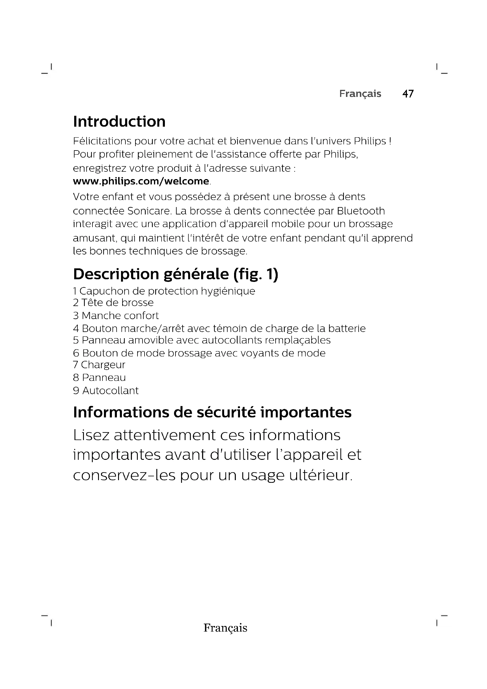 EspañolFrançais Introduction Félicitations pour votre achat et bienvenue dans l'univers Philips ! Pour profiter pleinement de l'assistance offerte par Philips, enregistrez votre produit à l'adresse suivante : www.philips.com/welcome. Votre enfant et vous possédez à présent une brosse à dents connectée Sonicare. La brosse à dents connectée par Bluetooth interagit avec une application d'appareil mobile pour un brossage amusant, qui maintient l'intérêt de votre enfant pendant qu'il apprend les bonnes techniques de brossage. Description générale (fig. 1) 1 Capuchon de protection hygiénique 2 Tête de brosse 3 Manche confort 4 Bouton marche/arrêt avec témoin de charge de la batterie 5 Panneau amovible avec autocollants remplaçables 6 Bouton de mode brossage avec voyants de mode 7 Chargeur 8 Panneau 9 Autocollant Informations de sécurité importantes Lisez attentivement ces informations importantes avant d'utiliser l’appareil et conservez-les pour un usage ultérieur.