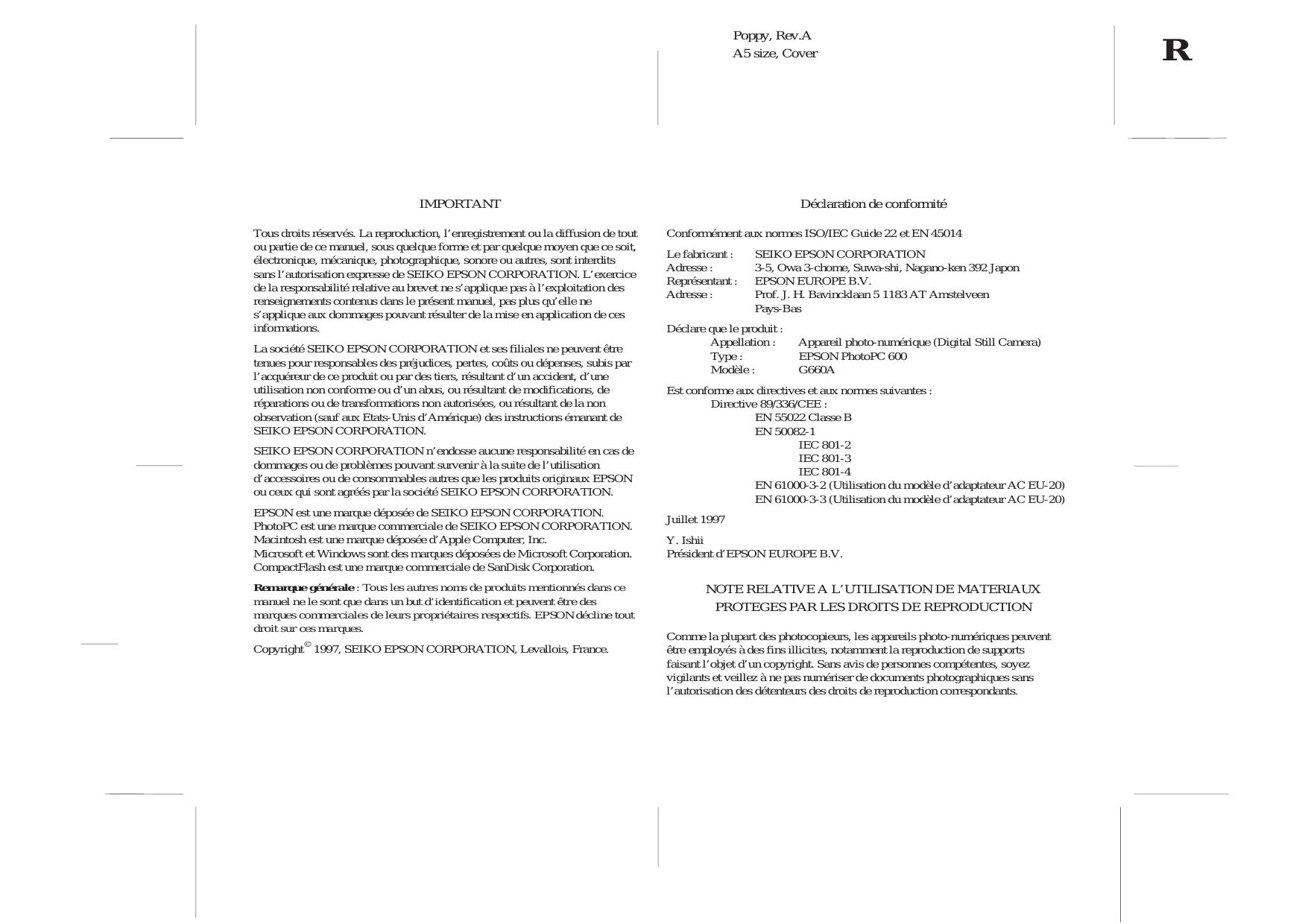 Poppy, Rev.A A5 size, Cover IMPORTANT Tous droits réservés. La reproduction, l’enregistrement ou la diffusion de tout ou partie de ce manuel, sous quelque forme et par quelque moyen que ce soit, électronique, mécanique, photographique, sonore ou autres, sont interdits sans l’autorisation expresse de SEIKO EPSON CORPORATION. L’exercice de la responsabilité relative au brevet ne s’applique pas à l’exploitation des renseignements contenus dans le présent manuel, pas plus qu’elle ne s’applique aux dommages pouvant résulter de la mise en application de ces informations. La société SEIKO EPSON CORPORATION et ses filiales ne peuvent être tenues pour responsables des préjudices, pertes, coûts ou dépenses, subis par l’acquéreur de ce produit ou par des tiers, résultant d’un accident, d’une utilisation non conforme ou d’un abus, ou résultant de modifications, de réparations ou de transformations non autorisées, ou résultant de la non observation (sauf aux Etats-Unis d’Amérique) des instructions émanant de SEIKO EPSON CORPORATION. SEIKO EPSON CORPORATION n’endosse aucune responsabilité en cas de dommages ou de problèmes pouvant survenir à la suite de l’utilisation d’accessoires ou de consommables autres que les produits originaux EPSON ou ceux qui sont agréés par la société SEIKO EPSON CORPORATION. EPSON est une marque déposée de SEIKO EPSON CORPORATION. PhotoPC est une marque commerciale de SEIKO EPSON CORPORATION. Macintosh est une marque déposée d’Apple Computer, Inc. Microsoft et Windows sont des marques déposées de Microsoft Corporation. CompactFlash est une marque commerciale de SanDisk Corporation. Remarque générale : Tous les autres noms de produits mentionnés dans ce manuel ne le sont que dans un but d’identification et peuvent être des marques commerciales de leurs propriétaires respectifs. EPSON décline tout droit sur ces marques. Copyright© 1997, SEIKO EPSON CORPORATION, Levallois, France. Déclaration de conformité Conformément aux normes ISO/IEC Guide 22 et EN 45014 Le fabricant : Adresse : Représentant : Adresse :