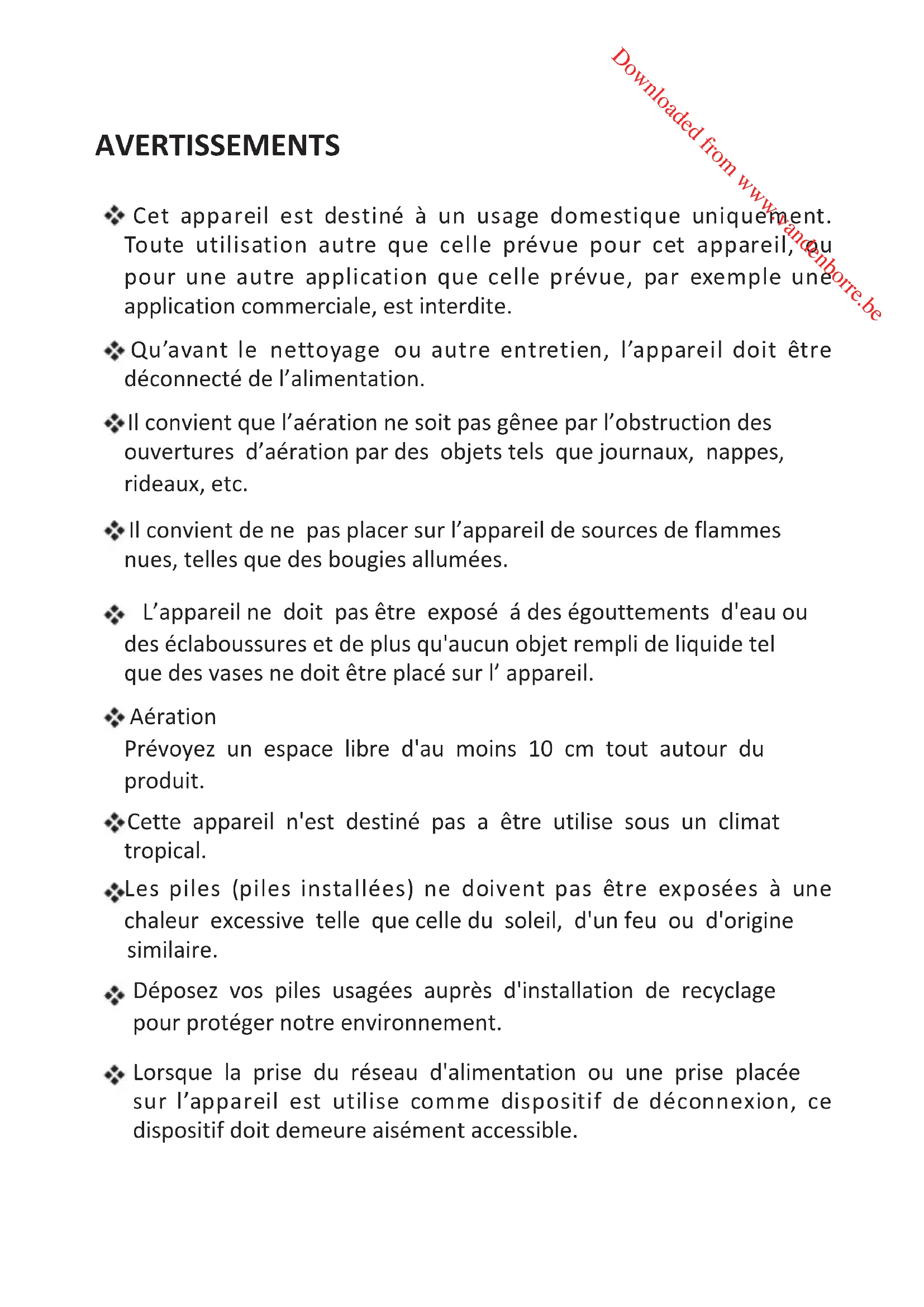 Downloaded from www.vandenborre.beAVERTISSEMENTS Cet appareil est destiné à un usage domestique uniquement. Toute utilisation autre que celle prévue pour cet appareil, ou pour une autre application que celle prévue, par exemple une application commerciale, est interdite. Qu’avant le nettoyage ou autre entretien, l’appareil doit être déconnecté de l’alimentation. Il convient que l’aération ne soit pas gênee par l’obstruction des ouvertures d’aération par des objets tels que journaux, nappes, rideaux, etc. Il convient de ne pas placer sur l’appareil de sources de flammes nues, telles que des bougies allumées. L’appareil ne doit pas être exposé á des égouttements d'eau ou des éclaboussures et de plus qu'aucun objet rempli de liquide tel que des vases ne doit être placé sur l’ appareil. Aération Prévoyez un espace libre d'au moins 10 cm tout autour du produit. Cette appareil n'est destiné pas a être utilise sous un climat tropical. Les piles (piles installées) ne doivent pas être exposées à une chaleur excessive telle que celle du soleil, d'un feu ou d'origine similaire. Déposez vos piles usagées auprès d'installation de recyclage pour protéger notre environnement. Lorsque la prise du réseau d'alimentation ou une prise placée sur l’appareil est utilise comme dispositif de déconnexion, ce dispositif doit demeure aisément accessible.