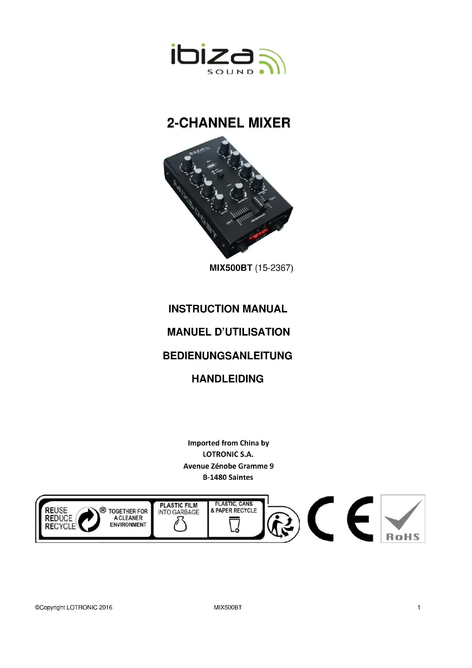 Nous, LOTRONIC SA Avenue Zénobe Gramme, 9 1480 SAINTES Belgique +32.2.390.91.91 Certifions et déclarons sous notre seule responsabilité que les produits suivants: Marque: IBIZA Désignation commerciale: TABLE DE MIXAGE 2 CANAUX AVEC USB-BT Type ou modèle: MIX500BT Auxquels se réfère cette déclaration sont conformes aux exigences essentielles et aux autres dispositions pertinentes de : Directive LVD 2014/35/EU, Directive RED 2014/53/EU et directive EMC 2014/30/EU Les produits sont en conformité avec les normes et/ou autres documents normatifs suivants : Sécurité électrique : IEC60065:2014 Exposition humaine: EN62479 : 2010