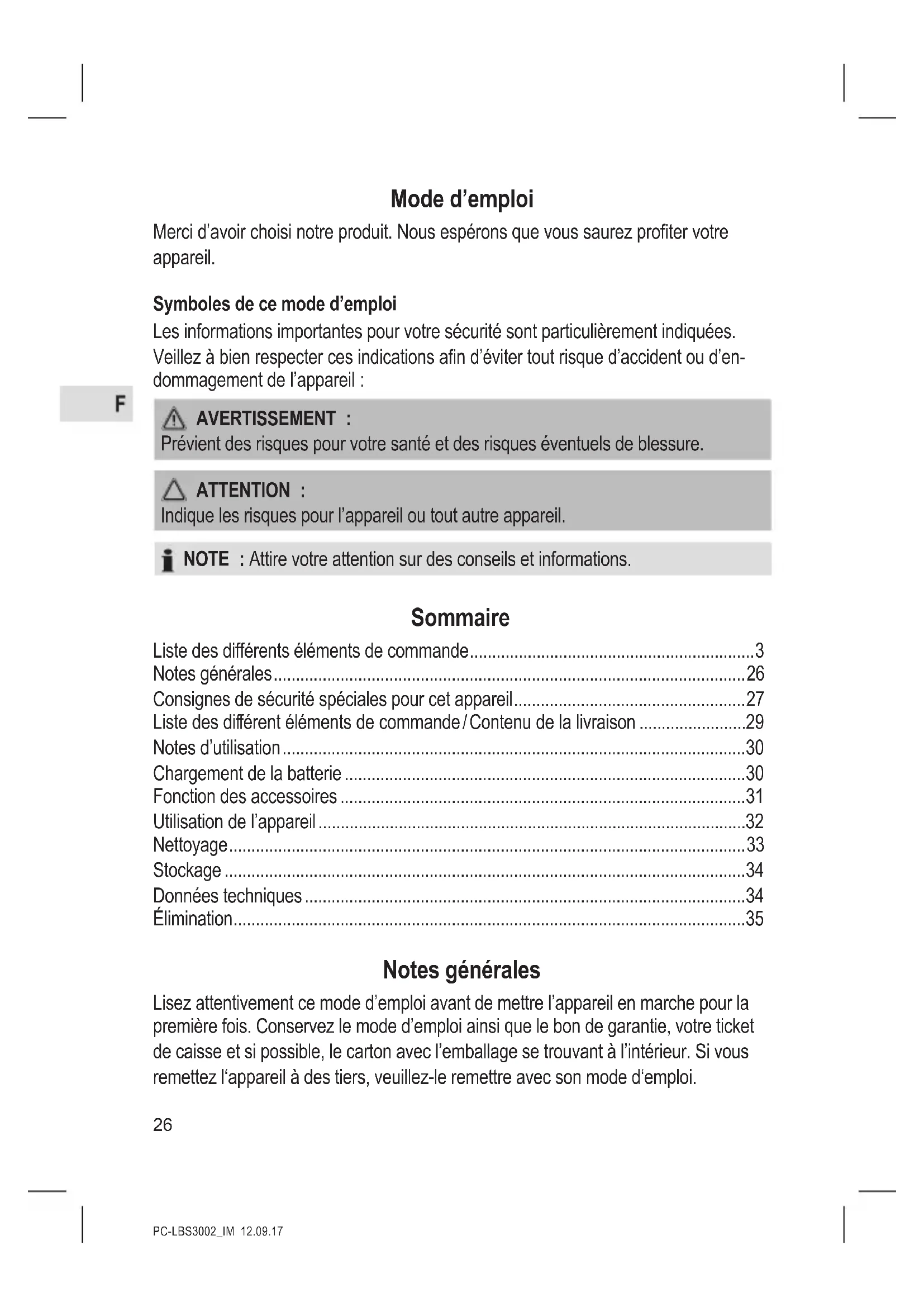 - Élimination Notes générales Lisez attentivement ce mode d’emploi avant de mettre l’appareil en marche pour la première fois. Conservez le mode d’emploi ainsi que le bon de garantie, votre ticket de caisse et si possible, le carton avec l’emballage se trouvant à l’intérieur. Si vous remettez l‘appareil à des tiers, veuillez-le remettre avec son mode d‘emploi.PC-LBS3002_IM 12.09.17 p. 35