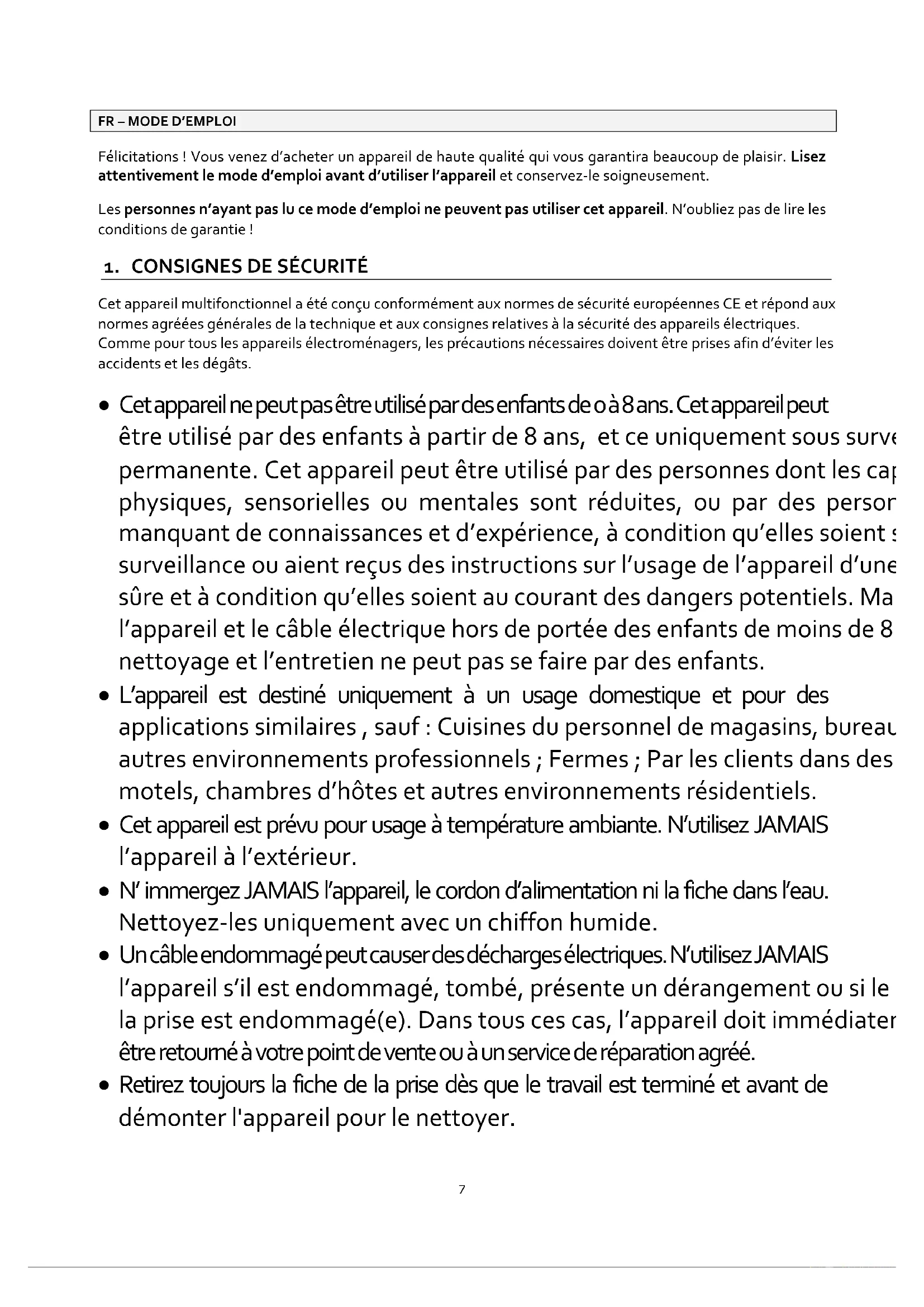 Cet appareil multifonctionnel a été conçu conformément aux normes de sécurité européennes CE et répond aux normes agréées générales de la technique et aux consignes relatives à la sécurité des appareils électriques. Comme pour tous les appareils électroménagers, les précautions nécessaires doivent être prises afin d’éviter les accidents et les dégâts.