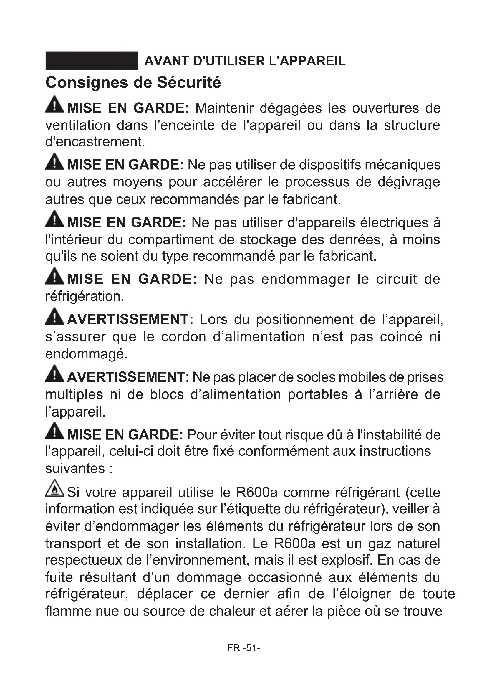 AVANT D'UTILISER L'APPAREIL SECTION - 1. Consignes de Sécurité MISE EN GARDE: Maintenir dégagées les ouvertures de ventilation dans l'enceinte de l'appareil ou dans la structure d'encastrement. MISE EN GARDE: Ne pas utiliser de dispositifs mécaniques ou autres moyens pour accélérer le processus de dégivrage autres que ceux recommandés par le fabricant. MISE EN GARDE: Ne pas utiliser d'appareils électriques à l'intérieur du compartiment de stockage des denrées, à moins qu'ils ne soient du type recommandé par le fabricant. MISE EN GARDE: Ne pas endommager le circuit de réfrigération.