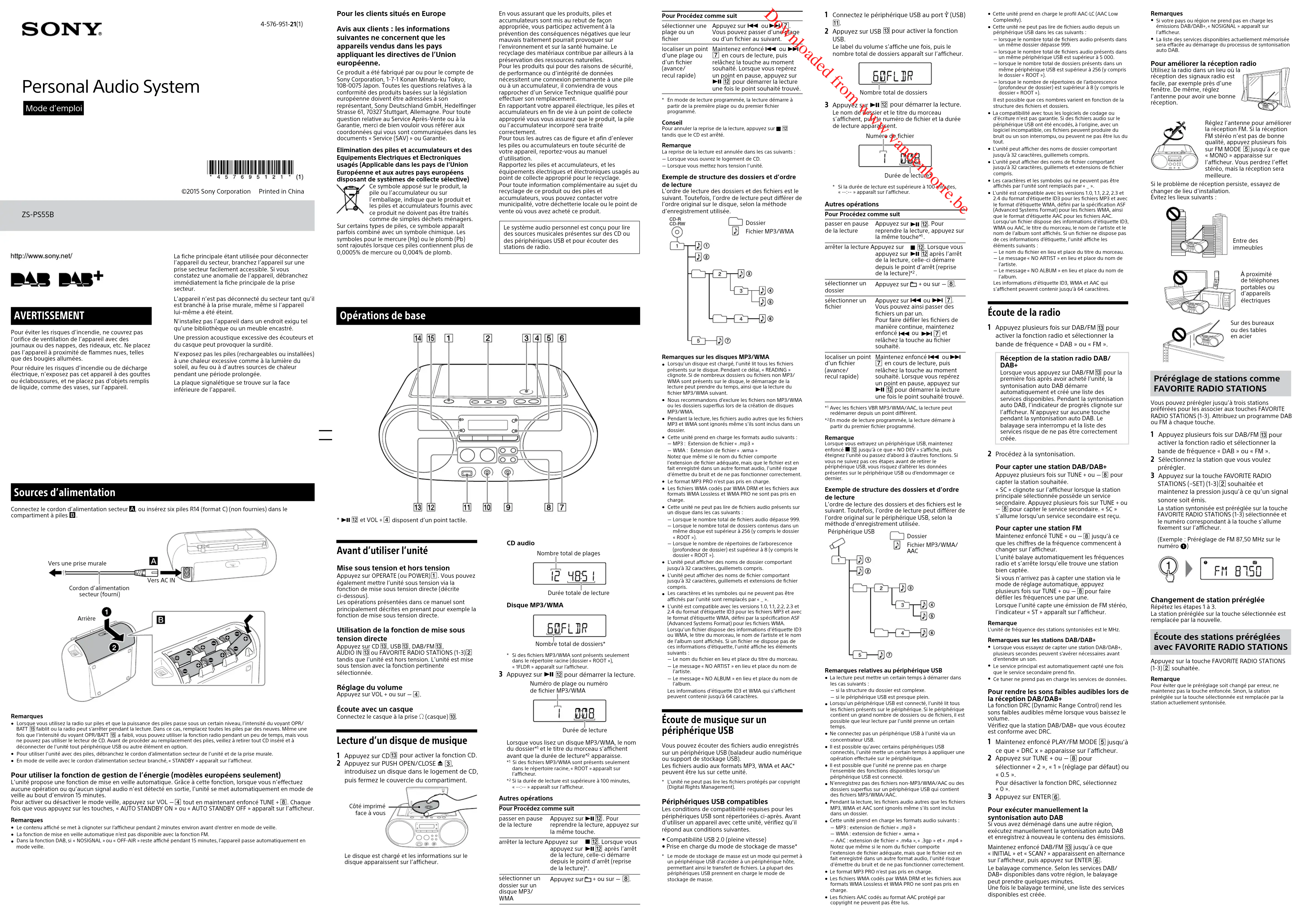 ZS-PS55B [FR] 4-576-951-21(1)4-576-951-21(1) Personal Audio System Mode d’emploi ©2015 Sony Corporation Printed in ChinaZS-PS55B* et VOL + disposent d’un point tactile.La fiche principale étant utilisée pour déconnecter l’appareil du secteur, branchez l’appareil sur une prise secteur facilement accessible. Si vous constatez une anomalie de l’appareil, débranchez immédiatement la fiche principale de la prise secteur.L’appareil n’est pas déconnecté du secteur tant qu’il est branché à la prise murale, même si l’appareil lui-même a été éteint.N’installez pas l’appareil dans un endroit exigu tel qu’une bibliothèque ou un meuble encastré.Une pression acoustique excessive des écouteurs et du casque peut provoquer la surdité.N’exposez pas les piles (rechargeables ou installées) à une chaleur excessive comme à la lumière du soleil, au feu ou à d’autres sources de chaleur pendant une période prolongée.La plaque signalétique se trouve sur la face inférieure de l’appareil. Opérations de base Avant d’utiliser l’unité Mise sous tension et hors tensionAppuyez sur OPERATE (ou POWER) . Vous pouvez également mettre l’unité sous tension via la fonction de mise sous tension directe (décrite ci-dessous).Les opérations présentées dans ce manuel sont principalement décrites en prenant pour exemple la fonction de mise sous tension directe.Utilisation de la fonction de mise sous tension directeAppuyez sur CD , USB , DAB/FM , AUDIO IN ou FAVORITE RADIO STATIONS (1-3)