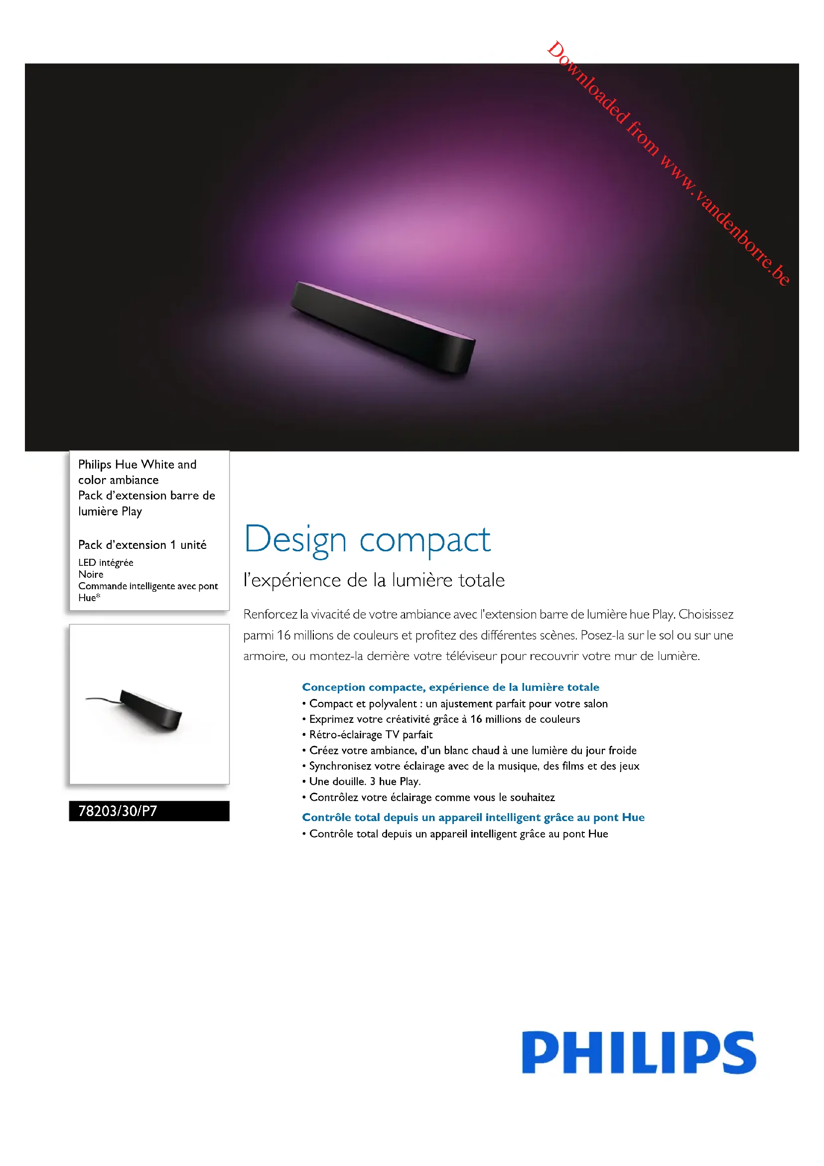 Philips Hue White and color ambiancePack d’extension barre de lumière PlayPack d’extension 1 unitéLED intégréeNoireCommande intelligente avec pont Hue* 78203/30/P7 Design compact l’expérience de la lumière totale Renforcez la vivacité de votre ambiance avec l’extension barre de lumière hue Play. Choisissez parmi 16 millions de couleurs et profitez des différentes scènes. Posez-la sur le sol ou sur une armoire, ou montez-la derrière votre téléviseur pour recouvrir votre mur de lumière. Conception compacte, expérience de la lumière totale• Compact et polyvalent : un ajustement parfait pour votre salon• Exprimez votre créativité grâce à 16 millions de couleurs• Rétro-éclairage TV parfait• Créez votre ambiance, d’un blanc chaud à une lumière du jour froide• Synchronisez votre éclairage avec de la musique, des films et des jeux• Une douille. 3 hue Play.• Contrôlez votre éclairage comme vous le souhaitezContrôle total depuis un appareil intelligent grâce au pont Hue• Contrôle total depuis un appareil intelligent grâce au pont Hue Downloaded from www.vandenborre.be7820330P7 Points forts Pack d’extension barre de lumière Play Pack d’extension 1 unité LED intégrée, Noire, Commande intelligente avec pont Hue* Compact et polyvalent Philips hue Play s’adapte à la conception de votre salon et s’harmonise parfaitement avec vos intérieurs. Vous pouvez le poser sur votre armoire pour créer une ambiance agréable, le monter sur l’arrière de votre téléviseur ou même le poser à plat sur le sol pour égayer vos murs du sol au plafond. Profitez de la liberté de le placer dans n’importe quel coin de la pièce et vous serez surpris par la façon dont Philips hue Play s’insère parfaitement dans chaque salon. Décoration lumineuse Jouez avec la lumière et faites votre choix parmi les 16 millions de couleurs pour changer