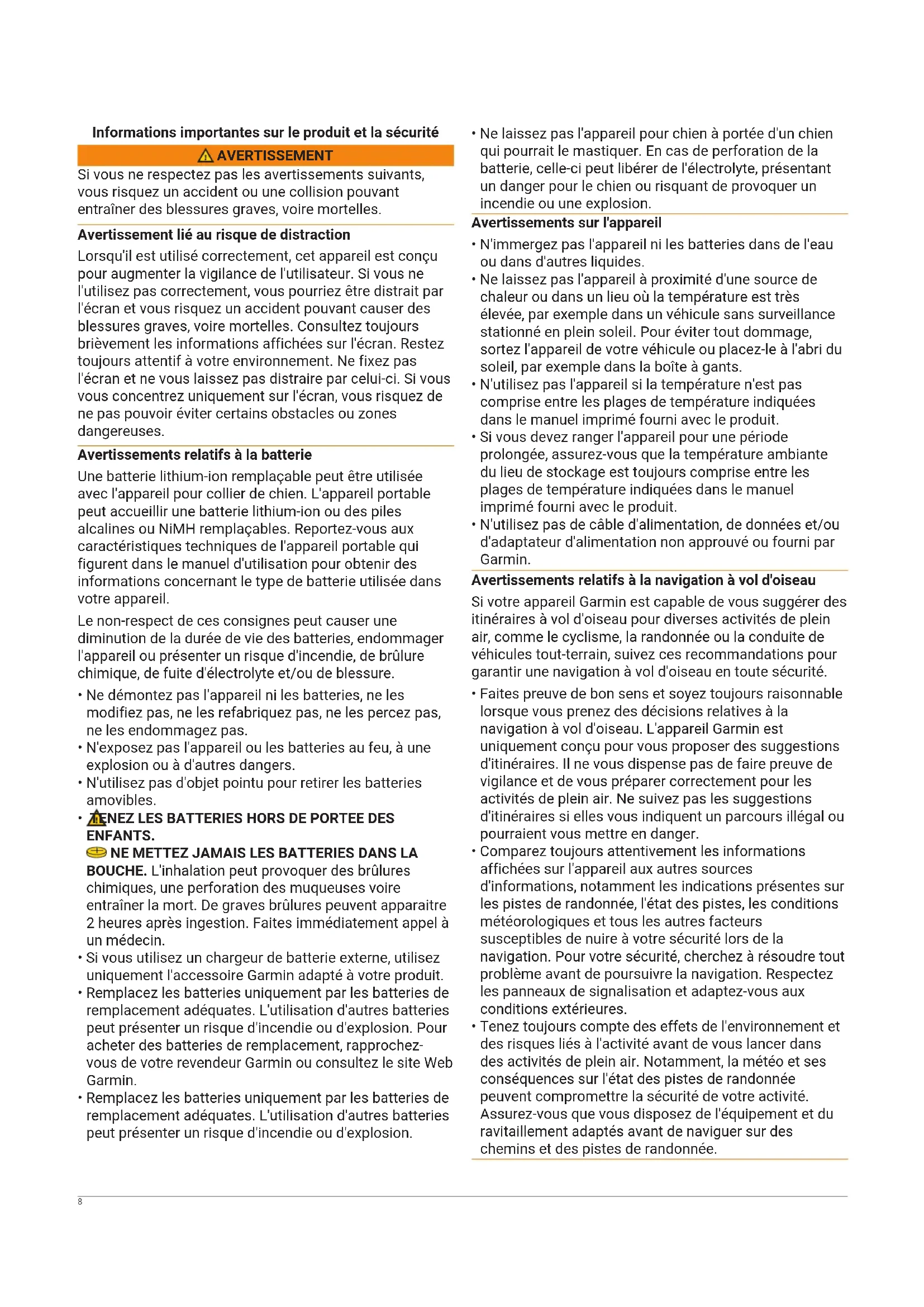 PEUVENT NE PAS VOUS CONCERNER. Si, pendant la durée de la garantie, vous faites une demande de services de garantie conformément à la présente Garantie limitée, Garmin peut, à sa discrétion : (i) réparer l'appareil à l'aide de pièces neuves ou déjà utilisées, si celles-ci remplissent les critères de qualité de Garmin, (ii) remplacer l'appareil par un appareil neuf ou par un appareil remis à neuf qui remplit les critères de qualité de Garmin ou (iii) rembourser l'appareil au prix où vous l'avez acheté. CE TYPE DE RECOURS SERA VOTRE RECOURS UNIQUE ET EXCLUSIF POUR TOUTE RUPTURE DE GARANTIE. Les appareils réparés ou remplacés bénéficient d'une garantie de 90 jours. Si l'unité envoyée est toujours couverte par la garantie d'origine, cette nouvelle garantie dure 90 jours ou jusqu'à la fin de la période de garantie d'origine qui est d'un an ; la période ayant la date de fin la plus éloignée prévaut. Avant de demander des services de garantie, merci de consulter les ressources d'aide en ligne disponibles sur support.garmin.com. Si votre appareil ne fonctionne toujours pas correctement après avoir appliqué les consignes indiquées en ligne, contactez un centre de service autorisé par Garmin dans le pays où vous avez acheté l'appareil ou suivez les instructions disponibles sur le site support.garmin.com pour obtenir des services de garantie. Si vous vous trouvez aux États-Unis, vous pouvez aussi appeler le 1-800-800-1020. Si vous demandez des services de garantie en dehors du pays où vous avez acheté l'appareil, Garmin ne peut pas garantir que les pièces et produits nécessaires à la réparation ou au remplacement de votre produit seront disponibles, car les offres, les normes, les lois et les réglementations diffèrent selon les pays. Dans ce cas, Garmin peut, à sa seule discrétion et conformément au droit applicable, réparer votre produit à l'aide de pièces comparables ou remplacer votre produit par un produit Garmin comparable, ou vous demander d'envoyer votre produit vers un centre de service autorisé par Garmin dans le pays où vous avez acheté le produit ou vers un centre de service autorisé par Garmin d'un autre pays où votre produit pourra être réparé ou remplacé, et, dans ce cas, vous devrez respecter le droit et les réglementations en matière d'importation et d'exportation et vous acquitter seul des droits de douane, de la TVA, des frais d'expédition ainsi que de tous autres taxes et frais. Dans certains cas, Garmin et ses revendeurs ne peuvent ni réparer votre produit dans un autre pays que celui où vous avez acheté le produit, ni envoyer un produit de remplacement neuf ou réparé dans ce pays, à cause des normes, lois et réglementations du pays en question. Achats dans le cadre d'enchères en ligne : les confirmations de vente aux enchères en ligne ne sont pas acceptées dans le cadre d'une vérification sous garantie. Pour bénéficier d'un service sous garantie, l'original ou une copie de la facture dressée par le premier revendeur doit être présenté. Garmin ne procédera à aucun remplacement de composant manquant sur tout produit acheté dans le cadre d'enchères en ligne. Achats internationaux : selon les pays, une garantie distincte peut être accordée par les distributeurs internationaux pour les appareils achetés hors des Etats- Unis. Le cas échéant, cette garantie est fournie par le distributeur du pays d'achat et ledit distributeur prend en charge les services locaux nécessaires pour votre appareil. Les garanties distributeur sont valides uniquement dans les zones de distribution visées. 11Informazioni importanti sulla sicurezza e sul prodotto AVVERTENZA Il mancato rispetto delle indicazioni fornite di seguito potrebbe causare incidenti e tamponamenti gravi o mortali. Avviso distrazione Questo dispositivo è concepito per aumentare la sicurezza se utilizzato correttamente. Se utilizzato in modo errato, l'utente può distrarsi visualizzando lo schermo e ciò può causare incidenti con lesioni personali o morte. Le informazioni sul dispositivo devono essere visualizzate in un colpo d'occhio. Mantenere sempre l'attenzione sull'ambiente circostante e non guardare fisso lo schermo onde evitare distrazioni. Visualizzare lo schermo potrebbe impedire di evitare ostacoli o pericoli. Avvertenze sulla batteria Con il collare per cani è possibile utilizzare una batteria agli ioni di litio sostituibile. Con il dispositivo portatile è possibile utilizzare una batteria agli ioni di litio o batterie alcaline o NiMH sostituibili. Fare riferimento alle specifiche del dispositivo portatile nel manuale per ulteriori informazioni sul tipo di batteria utilizzato per il modello specifico in uso. Il mancato rispetto delle seguenti linee guida potrebbe compromettere la durata delle batterie, danneggiare il dispositivo e causare incendi, combustioni chimiche, perdita di elettroliti e/o lesioni.
