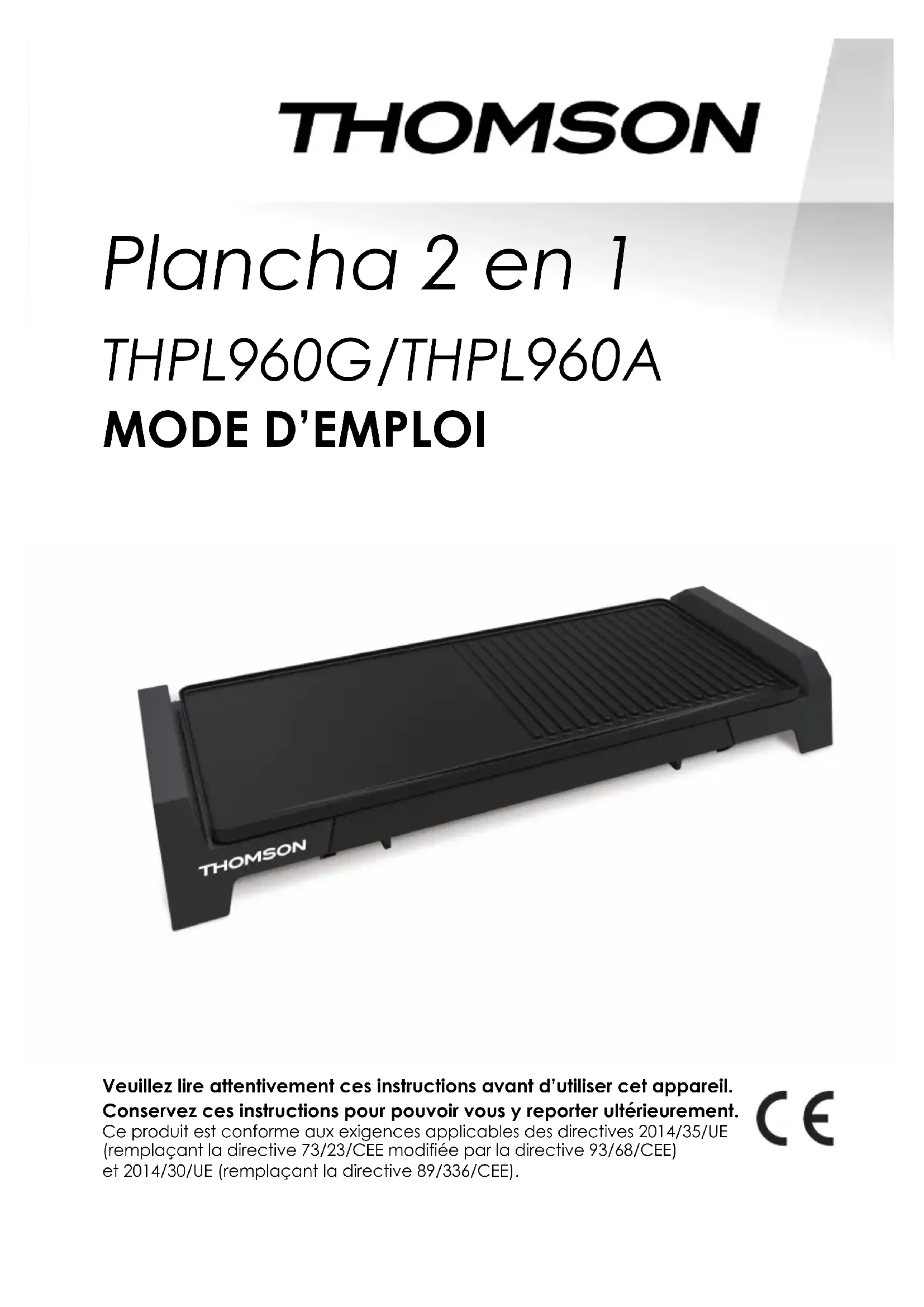 Remarque 1 : Le voyant du thermostat sur la sonde de régulation indique que l’appareil est en train de chauffer. Il restera allumé jusqu’à ce que la température réglée soit atteinte, puis s’allumera et s’éteindra tout au long de la cuisson. Il garantit que le gril maintient toujours la température sélectionnée. Le t emps de préchauffage dépendra du réglage de température sélectionné. Plus un réglage de température élevé est sélectionné, plus le temps de préchauffage est élevé. REMA RQUE 2 : Lors vous faites vos grillades aux réglages de température les plus élevés, le gril émet de la fumée. Sélectionner un réglage moindre réduit l’émission de fumée. Une ventilation adéquate est recommandée. Entretien et nettoyage Ne laissez pas d’ustensiles en plastique en contact avec la plaque chauffante pendant la cuisson. N’utilisez pas d’objets pointus ou ne coupez pas les aliments sur le gril. Lors du nettoyage du revêtement anti-adhérent, n’utilisez pas de tampons à récurer métalliques ou autrement abrasifs. Après le nettoyage, séchez soigneusement le gril avec un chiffon doux avantFR-13 de le ranger. Mettez toujours l’appareil hors tension et retirez la fiche de la prise de courant avant de le nettoyer. Retirez la sonde de régulation de la prise du gril. Lorsque la sonde de régulation est retirée, la plaque peut être nettoyée et être plongée dans l’eau pour être nettoyée. Ne passez pas la plaque au lave-vaisselle. Sonde de régulation Essuyez la sonde de régulation avec un chiffon humide. Ne la plongez pas dans l’eau ou tout autre liquide. Rangez-la soigneusement dans un endroit sûr. Ne la cognez pas et ne la laissez pas tomber, car cela pourrait l’endommager. Plaque chauffante et ramasse-gouttes L’élément de la plaque de cuisson est totalement étanche, il est donc possible de l’immerger complètement dans l’eau. Lavez la plaque chauffante et le ramasse-gouttes dans de l’eau chaude savonneuse, utilisez un détergent ménager doux et une éponge de nettoyage douce. Une brosse à bouteille peut être utilisée pour nettoyer entre les barres du gril de la plaque chauffante. L’appareil peut-être entièrement plongé dans l’eau lorsque la sonde de régulation est retirée. Rangement Séchez toujours le gril avant de le ranger. Assurez-vous que le ramasse- gouttes est correctement positionné. Rangez le gril sur une surface plane de votre table ou placard. Important : Avant d’insérer la sonde de régulation dans la prise correspondante, assurez-vous que l’intérieur de celle-ci est complètement sec. Pour ce faire, essuyez-en l’intérieur avec un chiffon sec ou videz l’excès d’eau en la secouant vigoureusement. Description technique - Tension 230V ~ - Fréquence : 50/60Hz - Puissance : 2200WFR-14 LES DÉFAUTS RÉSULTANT D’UNE PANNE DE L’APPAREIL ET DE DOMMAGES CAUSÉS PAR UNE ACTION OU DES RÉPARATIONS RÉALISÉES PAR UNE TIERCE PARTIE OU RÉSULTANT DE L’INSTALLATION DE PIÈCES NON ORIGINALES NE SONT PAS COUVERTS PAR LA RESPONSABILITÉ DU FOURNISSEUR. Si ce logo est apposé sur l’appareil, cela signifie qu’il doit être mis au rebut conformément à la directive 2012/19/UE relative aux déchets d’équipements électriques et électroniques (DEEE). Toute substance dangereuse contenue dans un équipement électrique ou électronique peut avoir des effets nuisibles sur l’environnement et la santé au cours de son r ecyclage. En conséquence, en fin de vie utile de l’appareil, celui -ci ne doit pas être jeté avec les déchets municipaux non triés. En tant que consommateur final, votre rôle est primordial pour assurer le réemploi, le recyclage ou toute autre création de v aleur pour cet appareil. Plusieurs dispositifs de collecte et de récupération mis en place par vos autorités locales (centres de recyclage) et les distributeurs sont à votre disposition. Il est de votre responsabilité d’avoir recours à ces dispositifs. La garantie ne couvre pas les pièces usées du produit ni les problèmes ou dommages résultant : (1) d’une détérioration du revêtement liée à une usure normale du produit ; (2) de défauts ou de détériorations dus au contact avec des liquides et à la corrosion causée par la rouille ou de présence d'insectes; (3) de tout incident, abus, mauvais usage, altération, démontage ou réparation non autorisée ; (4) d’un entretien inapproprié, d’une utilisation impropre du produit ou d’un raccordement à une source électrique dont la tension est incorrecte ; (5) de l’utilisation d’accessoires non fournis ou non approuvés par le fabricant. La garantie sera annulée si la plaque signalétique et/ou le numéro de série du produit sont enlevés. THOMSON est une marque de Technicolor SA utilisée sous licence par SCHNEIDER CONSUMER GROUP. Importé par SCHNEIDER CONSUMER GROUP 12, rue Jules Ferry, 93110 Rosny-sous-Bois, FRANCEPlancha 2 in 1