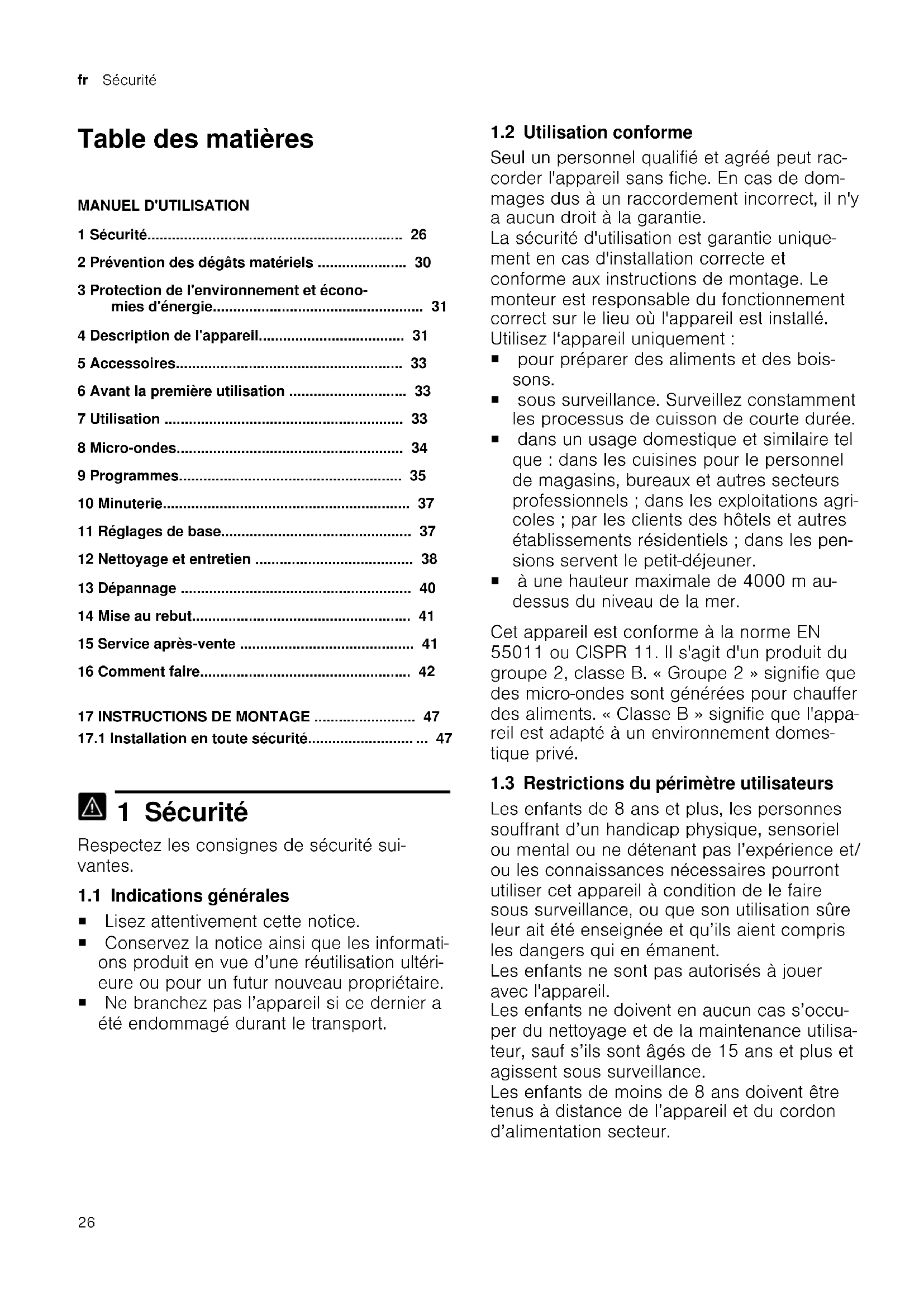 1 Sécurité Respectez les consignes de sécurité sui- vantes. 1.1 Indications générales ¡ Lisez attentivement cette notice. ¡ Conservez la notice ainsi que les informati- ons produit en vue d’une réutilisation ultéri- eure ou pour un futur nouveau propriétaire. ¡ Ne branchez pas l’appareil si ce dernier a été endommagé durant le transport. 1.2 Utilisation conforme Seul un personnel qualifié et agréé peut rac- corder l'appareil sans fiche. En cas de dom- mages dus à un raccordement incorrect, il n'y a aucun droit à la garantie. La sécurité d'utilisation est garantie unique- ment en cas d'installation correcte et conforme aux instructions de montage. Le monteur est responsable du fonctionnement correct sur le lieu où l'appareil est installé. Utilisez l‘appareil uniquement: ¡ pour préparer des aliments et des bois- sons. ¡ sous surveillance. Surveillez constamment les processus de cuisson de courte durée. ¡ dans un usage domestique et similaire tel que: dans les cuisines pour le personnel de magasins, bureaux et autres secteurs professionnels; dans les exploitations agri- coles; par les clients des hôtels et autres établissements résidentiels; dans les pen- sions servent le petit-déjeuner. ¡ à une hauteur maximale de 4000m au- dessus du niveau de la mer. Cet appareil est conforme à la norme EN 55011 ou CISPR 11. Il s'agit d'un produit du groupe 2, classe B. «Groupe 2» signifie que des micro-ondes sont générées pour chauffer des aliments. «Classe B» signifie que l'appa- reil est adapté à un environnement domes- tique privé. 1.3 Restrictions du périmètre utilisateurs Les enfants de 8 ans et plus, les personnes souffrant d’un handicap physique, sensoriel ou mental ou ne détenant pas l’expérience et/ ou les connaissances nécessaires pourront utiliser cet appareil à condition de le faire sous surveillance, ou que son utilisation sûre leur ait été enseignée et qu’ils aient compris les dangers qui en émanent. Les enfants ne sont pas autorisés à jouer avec l'appareil. Les enfants ne doivent en aucun cas s’occu- per du nettoyage et de la maintenance utilisa- teur, sauf s’ils sont âgés de 15ans et plus et agissent sous surveillance. Les enfants de moins de 8ans doivent être tenus à distance de l’appareil et du cordon d’alimentation secteur.Sécurité fr