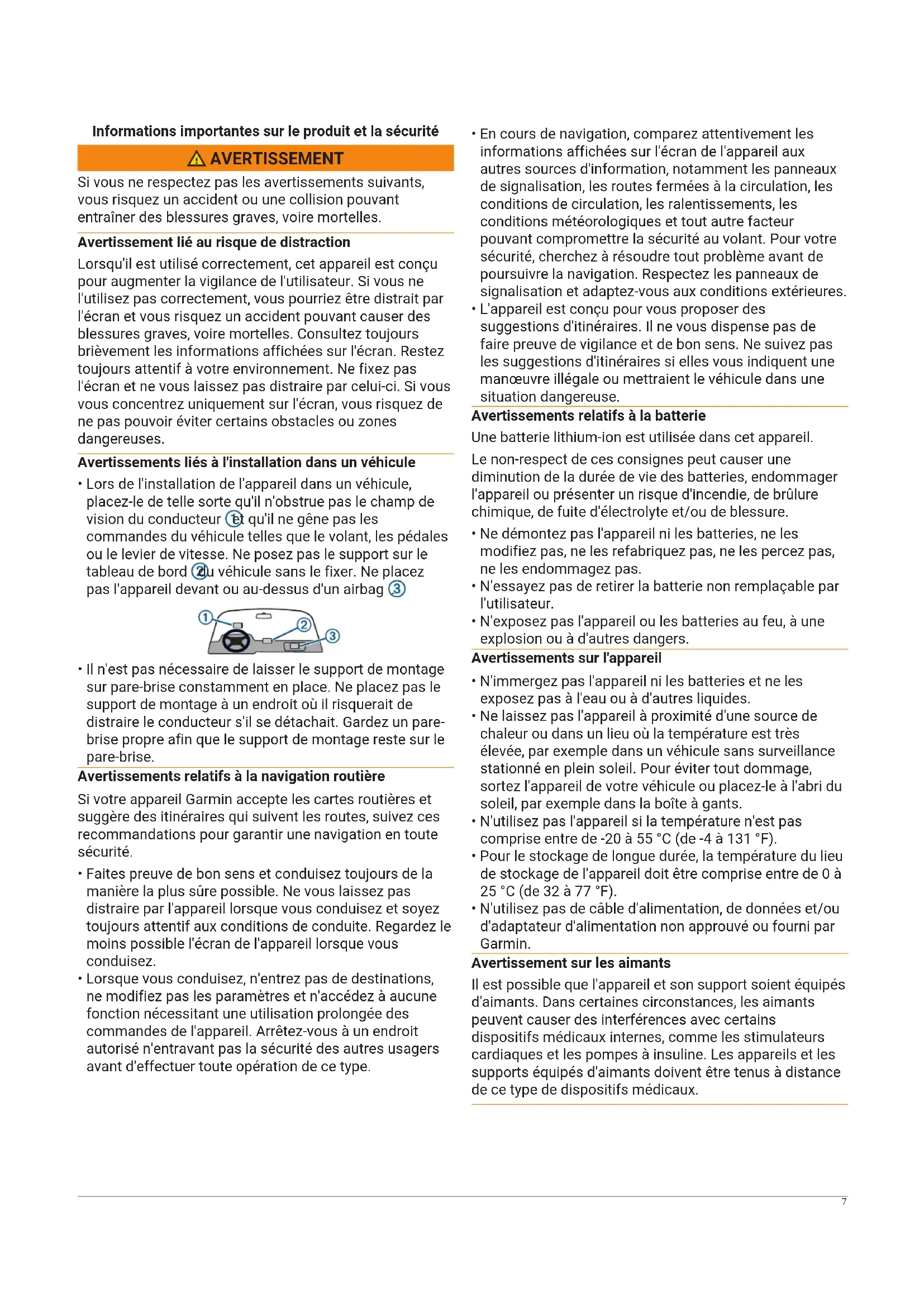 - N'utilisez pas de câble d'alimentation, de données et/ou d'adaptateur d'alimentation non approuvé ou fourni par Garmin. Avertissement sur les aimants Il est possible que l'appareil et son support soient équipés d'aimants. Dans certaines circonstances, les aimants peuvent causer des interférences avec certains dispositifs médicaux internes, comme les stimulateurs cardiaques et les pompes à insuline. Les appareils et les supports équipés d'aimants doivent être tenus à distance de ce type de dispositifs médicaux. 7AVIS Si vous ignorez les consignes fournies dans le présent document, vous risquez de vous blesser, d'endommager votre bien ou d'affecter négativement les fonctionnalités de l'appareil. Avis concernant la batterie