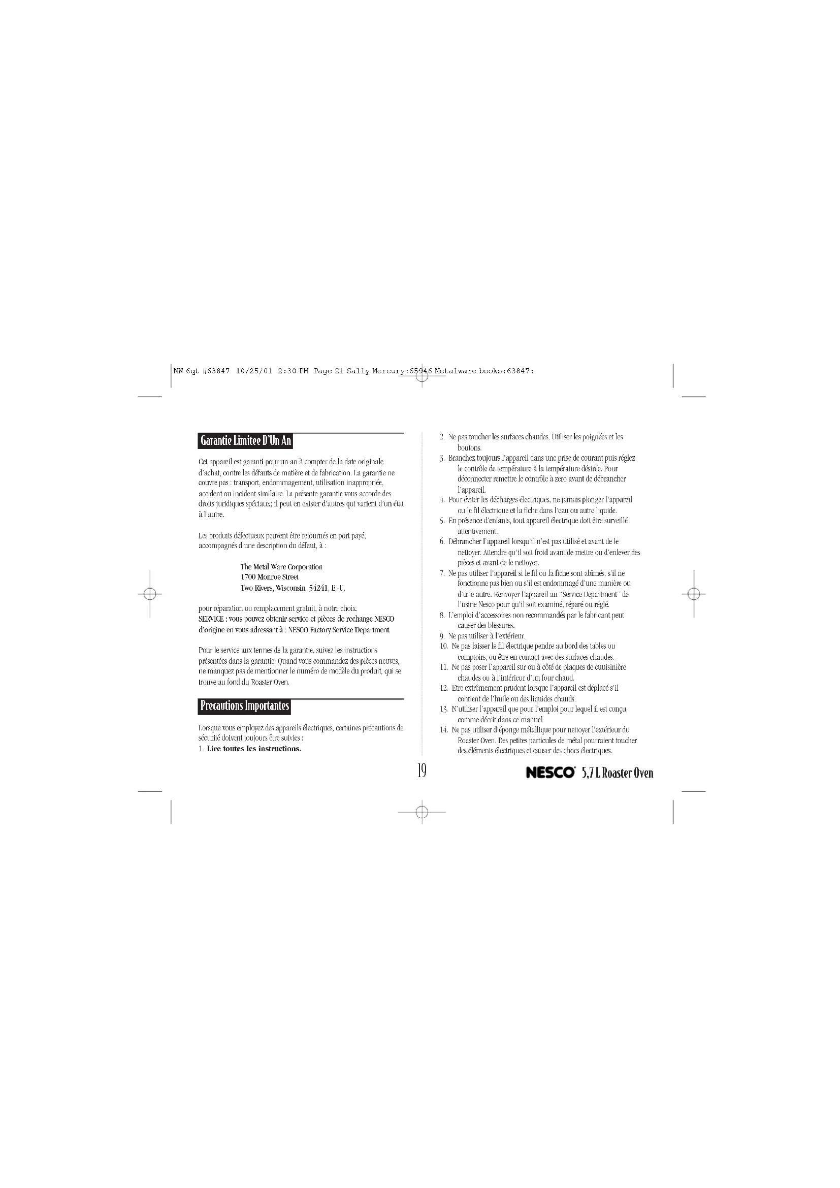 Roaster Oven. Des petites particules de métal pourraient toucher des éléments électriques et causer des chocs électriques. MW 6qt #63847 10/25/01 2:30 PM Page 21 Sally Mercury:65946 Metalware books:63847:20 Conservez Ces Instructions Cet appareil est strictement destiné à un emploi domestique. Il comporte un fil électrique très court pour éviter les accidents que pourrait causer un long fil. Des fils plus longs ou des rallonges peuvent être employés à condition que leurs spécifications soient égales ou supérieures aux spécifications de l’appareil. En outre, des soins spéciaux devront être mis en oeuvre pour éviter que des enfants puissent tirer sur le fil ou que l’on trébuche dans le fil. Guide D’utilisation Du Roaster Oven De 5,7 L Introduction du Roaster Oven NESCO
