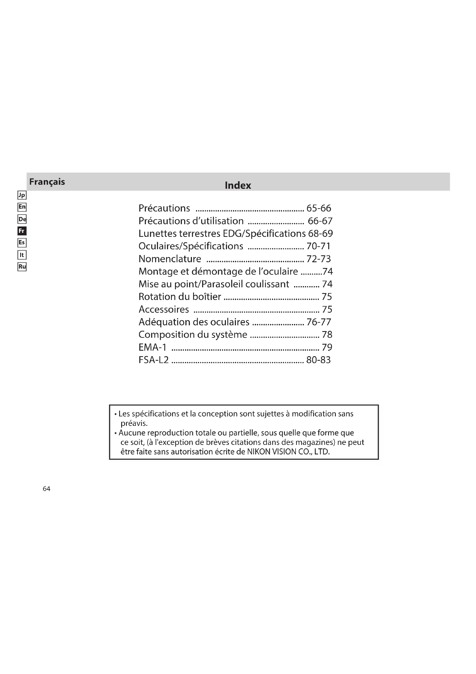 - Aucune reproduction totale ou partielle, sous quelle que forme que ce soit, (à l'exception de brèves citations dans des magazines) ne peut être faite sans autorisation écrite de NIKON VISION CO., LTD.65