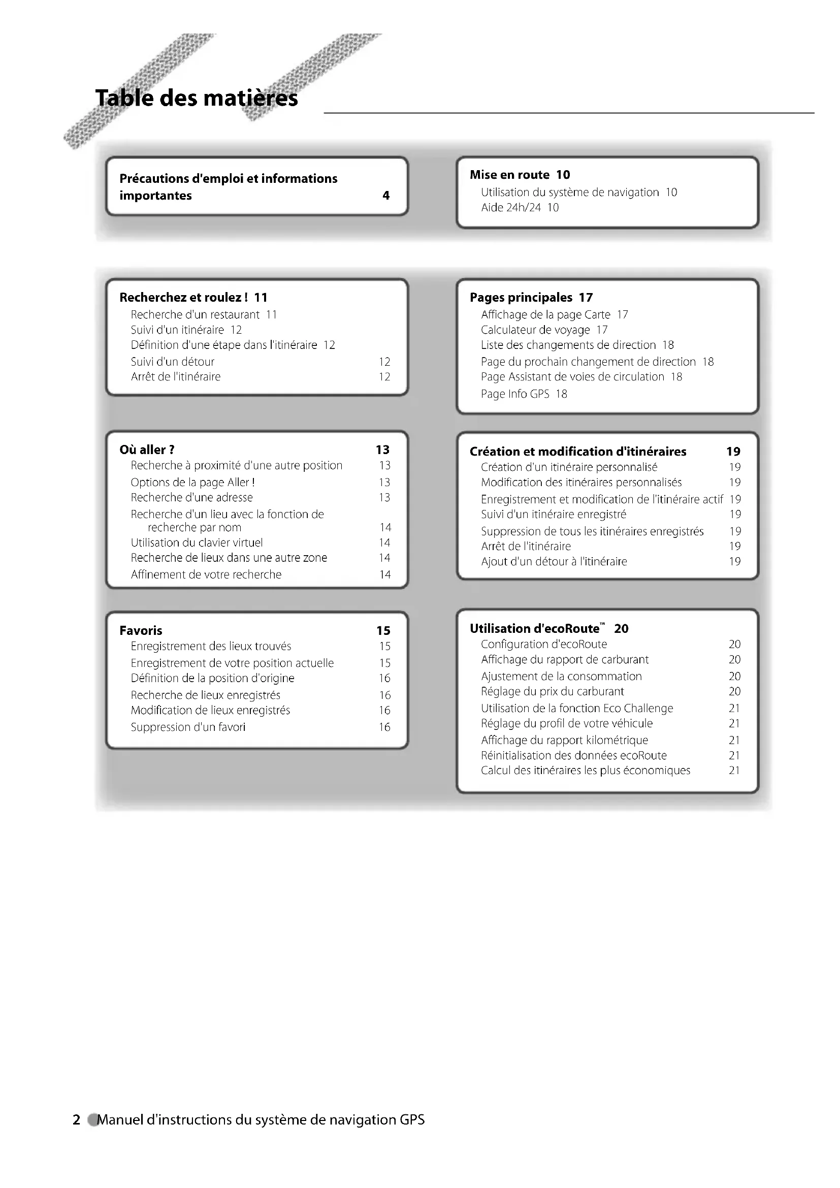 © B64-4619-00 190-01141-90_0A.indb 1190-01141-90_0A.indb 1 12/1/2009 2:21:39 PM12/1/2009 2:21:39 PM2 Manuel d'instructions du système de navigation GPS Mise en route 10 Utilisation du système de navigation 10 Aide 24h/24 10 Pages principales 17 Affichage de la page Carte 17 Calculateur de voyage 17 Liste des changements de direction 18 Page du prochain changement de direction 18 Page Assistant de voies de circulation 18 Page Info GPS 18 Précautions d'emploi et informations importantes 4 Recherchez et roulez ! 11 Recherche d'un restaurant 11 Suivi d'un itinéraire 12 Définition d'une étape dans l'itinéraire 12 Suivi d'un détour 12 Arrêt de l'itinéraire 12 Favoris 15 Enregistrement des lieux trouvés 15 Enregistrement de votre position actuelle 15 Définition de la position d'origine 16 Recherche de lieux enregistrés 16 Modification de lieux enregistrés 16 Suppression d'un favori 16 Création et modification d'itinéraires 19 Création d'un itinéraire personnalisé 19 Modification des itinéraires personnalisés 19 Enregistrement et modification de l'itinéraire actif 19 Suivi d'un itinéraire enregistré 19 Suppression de tous les itinéraires enregistrés 19 Arrêt de l'itinéraire 19 Ajout d'un détour à l'itinéraire 19 Où aller ? 13 Recherche à proximité d'une autre position 13 Options de la page Aller ! 13 Recherche d'une adresse 13 Recherche d'un lieu avec la fonction de recherche par nom 14 Utilisation du clavier virtuel 14 Recherche de lieux dans une autre zone 14 Affinement de votre recherche 14 Utilisation d'ecoRoute