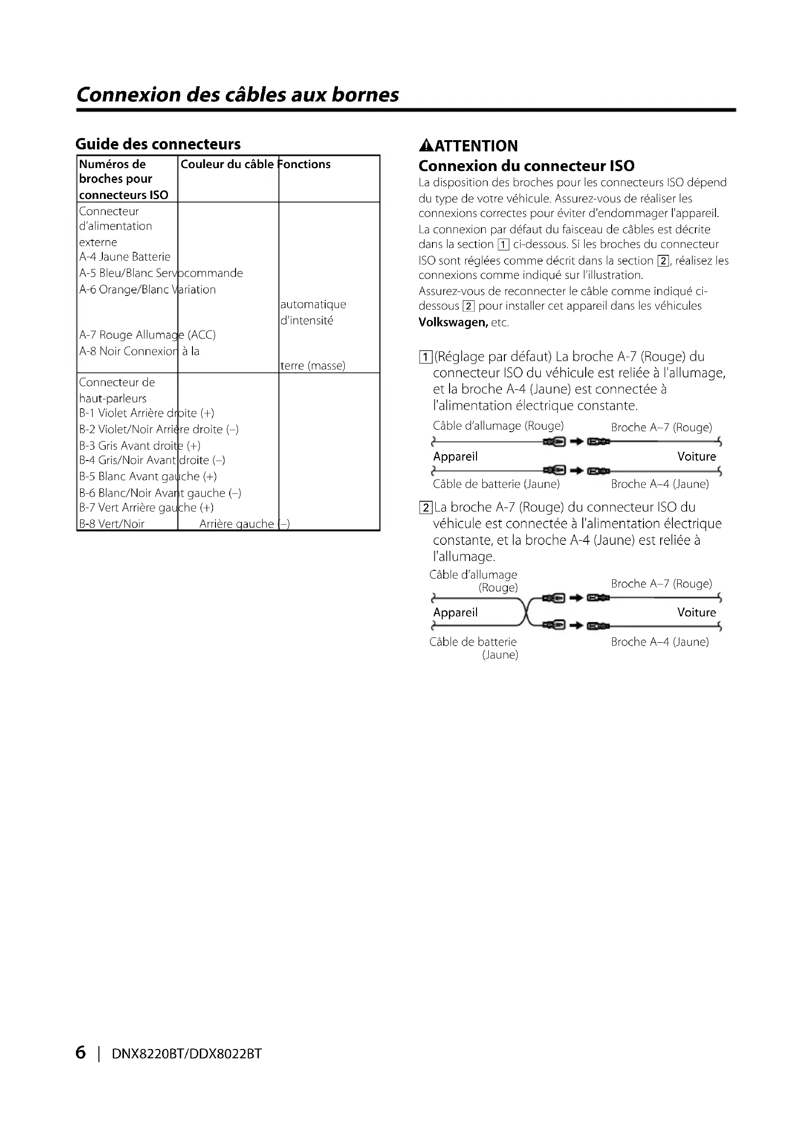 Connexion des câbles aux bornes Guide des connecteurs Numéros de broches pour connecteurs ISOCouleur du câble FonctionsConnecteur d’alimentation externeA-4 Jaune BatterieA-5 Bleu/Blanc ServocommandeA-6 Orange/Blanc Variation automatique d'intensitéA-7 Rouge Allumage (ACC)A-8 Noir Connexion à la terre (masse)Connecteur de haut-parleursB-1 Violet Arrière droite (+)B-2 Violet/Noir Arrière droite (–)B-3 Gris Avant droite (+)B-4 Gris/Noir Avant droite (–)B-5 Blanc Avant gauche (+)B-6 Blanc/Noir Avant gauche (–)B-7 Vert Arrière gauche (+)B-8 Vert/Noir Arrière gauche (–) 2ATTENTION Connexion du connecteur ISO La disposition des broches pour les connecteurs ISO dépend du type de votre véhicule. Assurez-vous de réaliser les connexions correctes pour éviter d'endommager l'appareil.La connexion par défaut du faisceau de câbles est décrite dans la section 1 ci-dessous. Si les broches du connecteur ISO sont réglées comme décrit dans la section 2, réalisez les connexions comme indiqué sur l’illustration.Assurez-vous de reconnecter le câble comme indiqué ci-dessous 2 pour installer cet appareil dans les véhicules Volkswagen, etc. 1 (Réglage par défaut) La broche A-7 (Rouge) du connecteur ISO du véhicule est reliée à l'allumage, et la broche A-4 (Jaune) est connectée à l'alimentation électrique constante. Appareil VoitureBroche A–7 (Rouge)Broche A–4 (Jaune)Câble d’allumage (Rouge)Câble de batterie (Jaune) 2 La broche A-7 (Rouge) du connecteur ISO du véhicule est connectée à l'alimentation électrique constante, et la broche A-4 (Jaune) est reliée à l'allumage. Appareil VoitureBroche A–7 (Rouge)Broche A–4 (Jaune)Câble d’allumage (Rouge)Câble de batterie (Jaune) B54-4651-0000.indb6B54-4651-0000.indb6 08.2.1911:39:09PM08.2.1911:39:09PMFrançais