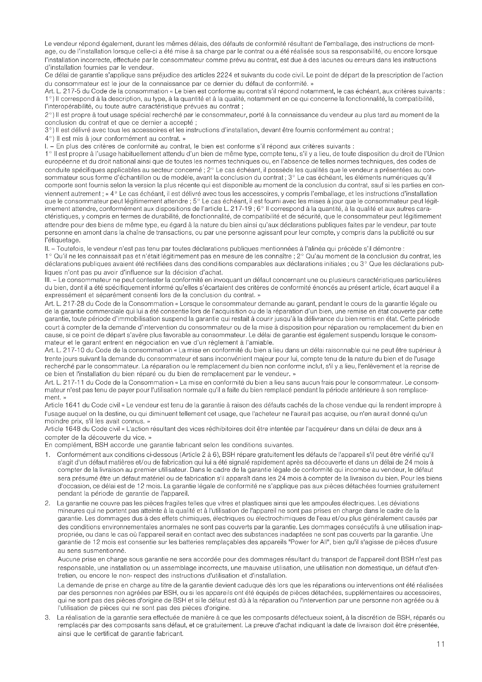 1° Il est propre à l’usage habituellement attendu d’un bien de même type, compte tenu, s’il y a lieu, de toute disposition du droit de l’Union européenne et du droit national ainsi que de toutes les normes techniques ou, en l’absence de telles normes techniques, des codes de conduite spécifiques applicables au secteur concerné ; 2° Le cas échéant, il possède les qualités que le vendeur a présentées au con- sommateur sous forme d’échantillon ou de modèle, avant la conclusion du contrat ; 3° Le cas échéant, les éléments numériques qu’il comporte sont fournis selon la version la plus récente qui est disponible au moment de la conclusion du contrat, sauf si les parties en con- viennent autrement ; « 4° Le cas échéant, il est délivré avec tous les accessoires, y compris l’emballage, et les instructions d’installation que le consommateur peut légitimement attendre ; 5° Le cas échéant, il est fourni avec les mises à jour que le consommateur peut légit- imement attendre, conformément aux dispositions de l’article L. 217-19 ; 6° Il correspond à la quantité, à la qualité et aux autres cara- ctéristiques, y compris en termes de durabilité, de fonctionnalité, de compatibilité et de sécurité, que le consommateur peut légitimement attendre pour des biens de même type, eu égard à la nature du bien ainsi qu’aux déclarations publiques faites par le vendeur, par toute personne en amont dans la chaîne de transactions, ou par une personne agissant pour leur compte, y compris dans la publicité ou sur l’étiquetage. II. – Toutefois, le vendeur n’est pas tenu par toutes déclarations publiques mentionnées à l’alinéa qui précède s’il démontre : 1° Qu’il ne les connaissait pas et n’était légitimement pas en mesure de les connaître ; 2° Qu’au moment de la conclusion du contrat, les déclarations publiques avaient été rectifiées dans des conditions comparables aux déclarations initiales ; ou 3° Que les déclarations pub- liques n’ont pas pu avoir d’influence sur la décision d’achat. III. – Le consommateur ne peut contester la conformité en invoquant un défaut concernant une ou plusieurs caractéristiques particulières du bien, dont il a été spécifiquement informé qu’elles s’écartaient des critères de conformité énoncés au présent article, écart auquel il a expressément et séparément consenti lors de la conclusion du contrat. » Art. L. 217-28 du Code de la Consommation « Lorsque le consommateur demande au garant, pendant le cours de la garantie légale ou de la garantie commerciale qui lui a été consentie lors de l’acquisition ou de la réparation d’un bien, une remise en état couverte par cette garantie, toute période d’immobilisation suspend la garantie qui restait à courir jusqu’à la délivrance du bien remis en état. Cette période court à compter de la demande d’intervention du consommateur ou de la mise à disposition pour réparation ou remplacement du bien en cause, si ce point de départ s’avère plus favorable au consommateur. Le délai de garantie est également suspendu lorsque le consom- mateur et le garant entrent en négociation en vue d’un règlement à l’amiable. Art. L. 217-10 du Code de la consommation « La mise en conformité du bien a lieu dans un délai raisonnable qui ne peut être supérieur à trente jours suivant la demande du consommateur et sans inconvénient majeur pour lui, compte tenu de la nature du bien et de l'usage recherché par le consommateur. La réparation ou le remplacement du bien non conforme inclut, s'il y a lieu, l'enlèvement et la reprise de ce bien et l'installation du bien réparé ou du bien de remplacement par le vendeur. » Art. L. 217-11 du Code de la Consommation « La mise en conformité du bien a lieu sans aucun frais pour le consommateur. Le consom- mateur n'est pas tenu de payer pour l'utilisation normale qu'il a faite du bien remplacé pendant la période antérieure à son remplace- ment.» Article 1641 du Code civil « Le vendeur est tenu de la garantie à raison des défauts cachés de la chose vendue qui la rendent impropre à l'usage auquel on la destine, ou qui diminuent tellement cet usage, que l'acheteur ne l'aurait pas acquise, ou n'en aurait donné qu'un moindre prix, s'il les avait connus. » Article 1648 du Code civil « L'action résultant des vices rédhibitoires doit être intentée par l'acquéreur dans un délai de deux ans à compter de la découverte du vice. » En complément, BSH accorde une garantie fabricant selon les conditions suivantes. 1. Conformément aux conditions ci-dessous (Article 2 à 6), BSH répare gratuitement les défauts de l'appareil s'il peut être vérifié qu'il s'agit d'un défaut matières et/ou de fabrication qui lui a été signalé rapidement après sa découverte et dans un délai de 24 mois à compter de la livraison au premier utilisateur. Dans le cadre de la garantie légale de conformité qui incombe au vendeur, le défaut sera présumé être un défaut matériel ou de fabrication s'il apparaît dans les 24 mois à compter de la livraison du bien. Pour les biens d'occasion, ce délai est de 12 mois. La garantie légale de conformité ne s’applique pas aux pièces détachées fournies gratuitement pendant la période de garantie de l'appareil. 2. La garantie ne couvre pas les pièces fragiles telles que vitres et plastiques ainsi que les ampoules électriques. Les déviations mineures qui ne portent pas atteinte à la qualité et à l'utilisation de l'appareil ne sont pas prises en charge dans le cadre de la garantie. Les dommages dus à des effets chimiques, électriques ou électrochimiques de l'eau et/ou plus généralement causés par des conditions environnementales anormales ne sont pas couverts par la garantie. Les dommages consécutifs à une utilisation inap- propriée, ou dans le cas où l'appareil serait en contact avec des substan