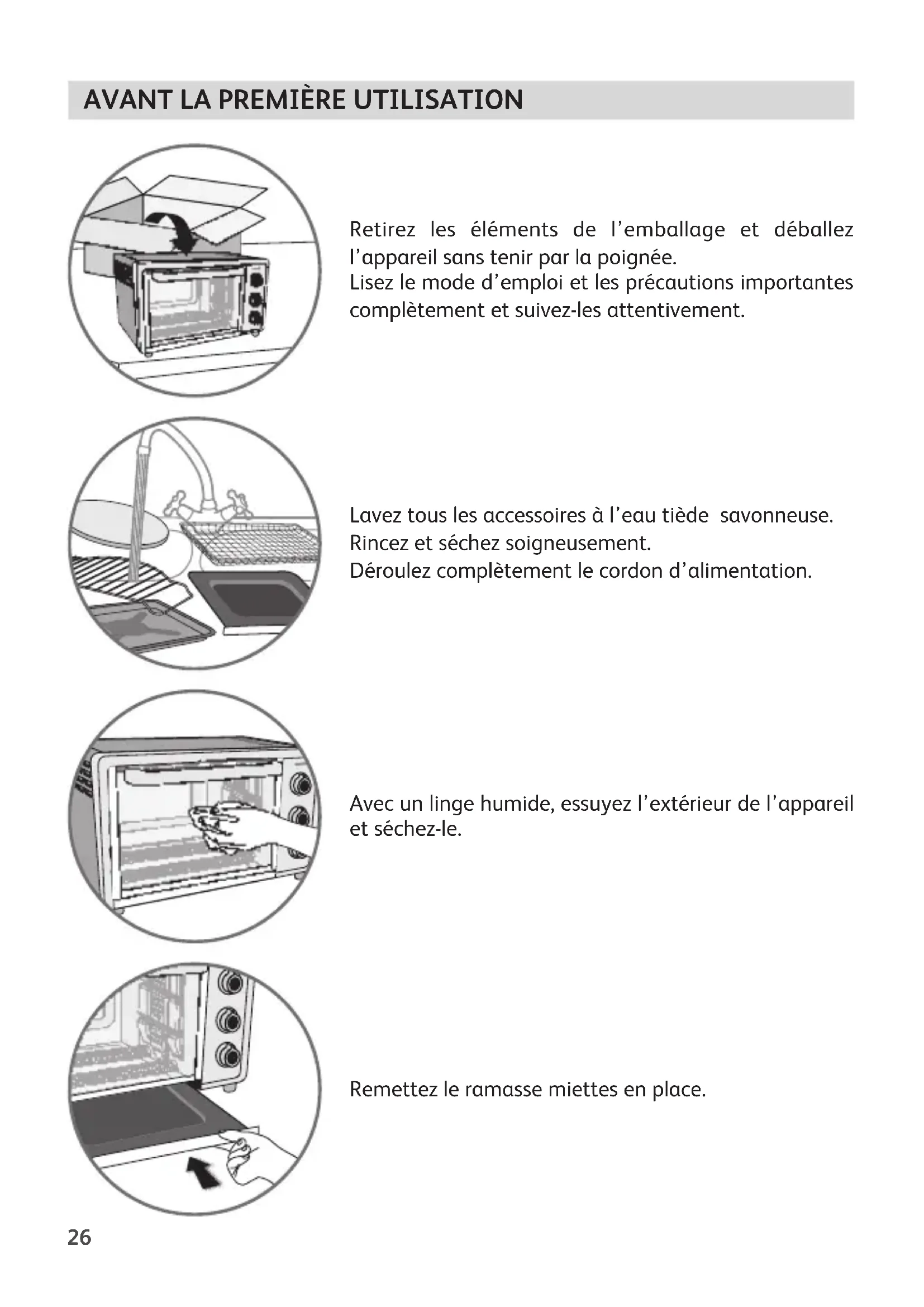 Retirez les éléments de l’emballage et déballez l’appareil sans tenir par la poignée. Lisez le mode d’emploi et les précautions importantes complètement et suivez-les attentivement. Lavez tous les accessoires à l’eau tiède savonneuse. Rincez et séchez soigneusement. Déroulez complètement le cordon d’alimentation. Avec un linge humide, essuyez l’extérieur de l’appareil et séchez-le. Remettez le ramasse miettes en place. NoticeFOUR_QUARTZTECH_NC00025433_Mise en page 1 29/03/12 07:48 Page26450°F 230°C