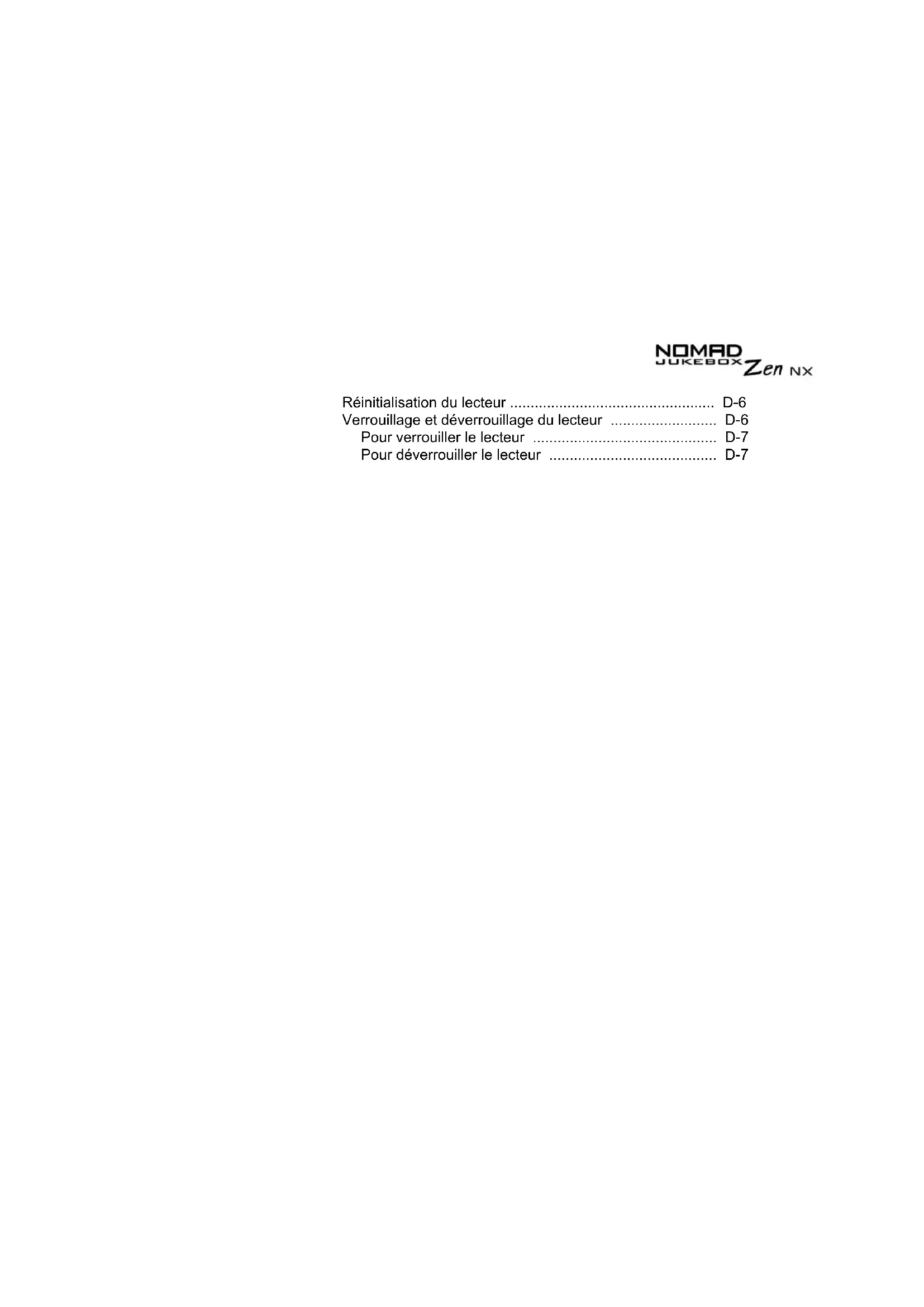 Réinitialisation du lecteur Si le lecteur ne répond plus, vous devez le réinitialiser. Cette opération ne devrait entraîner aucune perte de données ni de pistes audio, sauf si vous effectuez la réinitialisation pendant le transfert d'une piste audio. Vous pouvez vérifier ultérieurement la présence de la piste audio dans votre bibliothèque musicale. Reportez-vous à la section "Utilisation de la bibliothèque musicale" à la page 3 9. Pour réinitialiser le lecteur :Insérez l'extrémité d'un objet mince (par exemple, un trombone déplié) dans le bouton de réinitialisation. Verrouillage et déverrouillage du lecteur Lorsque le lecteur NOMAD Jukebox Zen NX est verrouillé, tous les boutons sont désactivés, à l'exception de la roulette de défilement. Cette fonction permet d'éviter l'activation accidentelle de boutons (par exemple, Stop). Si vous appuyez sur un bouton lorsque le lecteur est verrouillé, une fenêtre s'affiche pour vous permettre de le déverrouiller. Si vous n’effectuez pas de sélection après quelques secondes au moyen de la roulette de défilement, cette fenêtre disparaît.Préférences utilisateur D-7 Pour verrouiller le lecteur