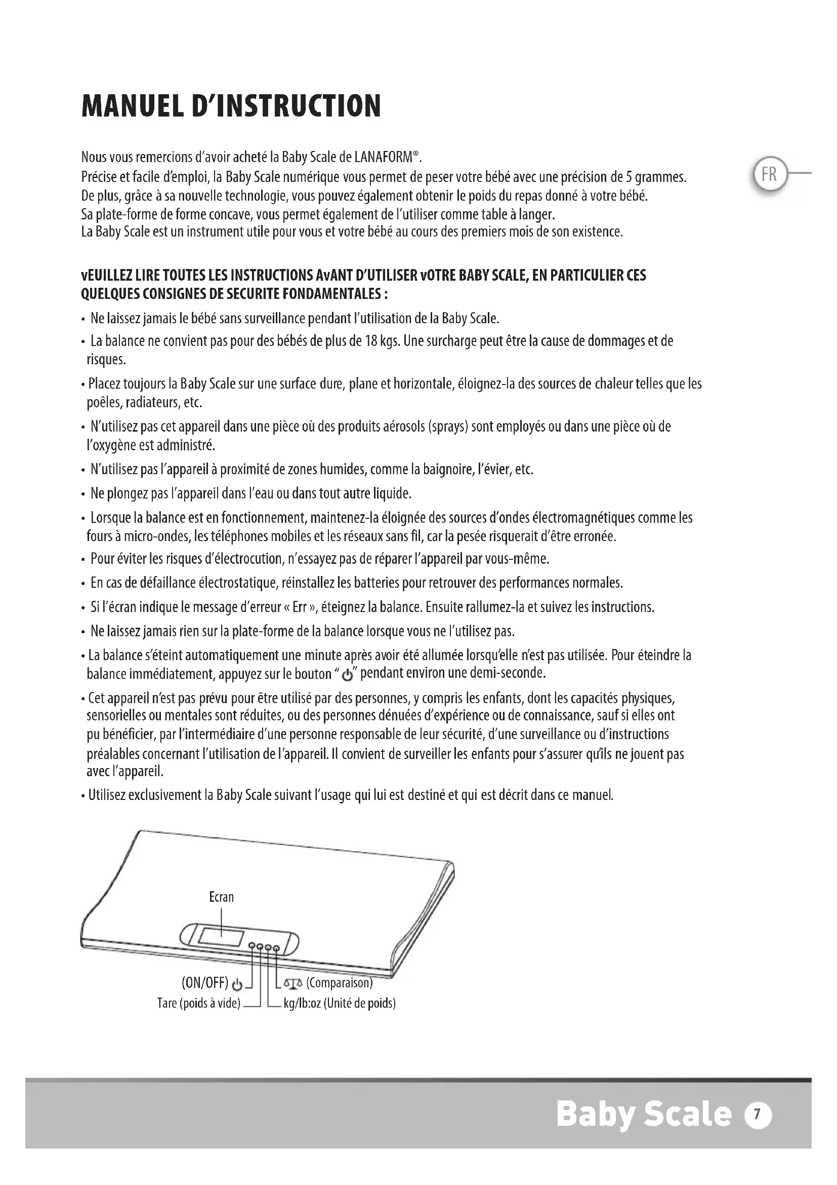 LANAFORM® garantit que ce produit est exempt de tout vice de matériau et de fabrication à compter de sa date d’achat et ce pour une période de deux ans, à l’exception des précisions ci-dessous. La garantie LANAFORM® ne couvre pas les dommages causés suite à une usure normale de ce produit. En outre, la garantie sur ce produit LANAFORM® ne couvre pas les dommages causés à la suite de toute utilisation abusive ou inappropriée ou encore de tout mauvais usage, accident, fixation de tout accessoire non autorisé, modification apportée au produit ou de toute autre condition, de quelle que nature que ce soit, échappant au contrôle de LANAFORM®. LANAFORM® ne sera pas tenue pour responsable de tout type de dommage accessoire, consécutif ou spécial. Toutes les garanties implicites d’aptitude du produit sont limitées à une période de deux années à compter de la date d’achat initiale pour autant qu’une copie de la preuve d’achat puisse être présentée. Dès réception, LANAFORM® réparera ou remplacera, suivant le cas, votre appareil et vous le renverra. La garantie n’est effectuée que par le biais du Centre Service de LANAFORM®. Toute activité d’entretien de ce produit confiée à toute personne autre que le Centre Service de LANAFORM® annule la présente garantie. 10DU InstructIEHanDlEIDInG Wij danken u voor het aanschaffen van de LANAFORM® Baby Scale. Met de nauwkeurige en gebruiksvriendelijke digitale Baby Scale kunt u uw baby binnen 5 gram nauwkeurig wegen. Bovendien kunt u dankzij haar nieuwe technologie ook het gewicht van de voeding achterhalen die u aan uw baby heeft gegeven. Dankzij haar platvorm met concave vorming kunt u het ook gebruiken als babytafel. De Baby Scale is een handig apparaat voor u en uw baby gedurende de eerste maanden van zijn/haar bestaan. LEES AUB ALLE INSTRUCTIES DOOR vOOR HET GEBRUIK vAN UW BABY SCALE, vOORNAMELIJK DEZE ENKELE FUNDAMENTELE vEILIGHEIDSINSTRUCTIES :