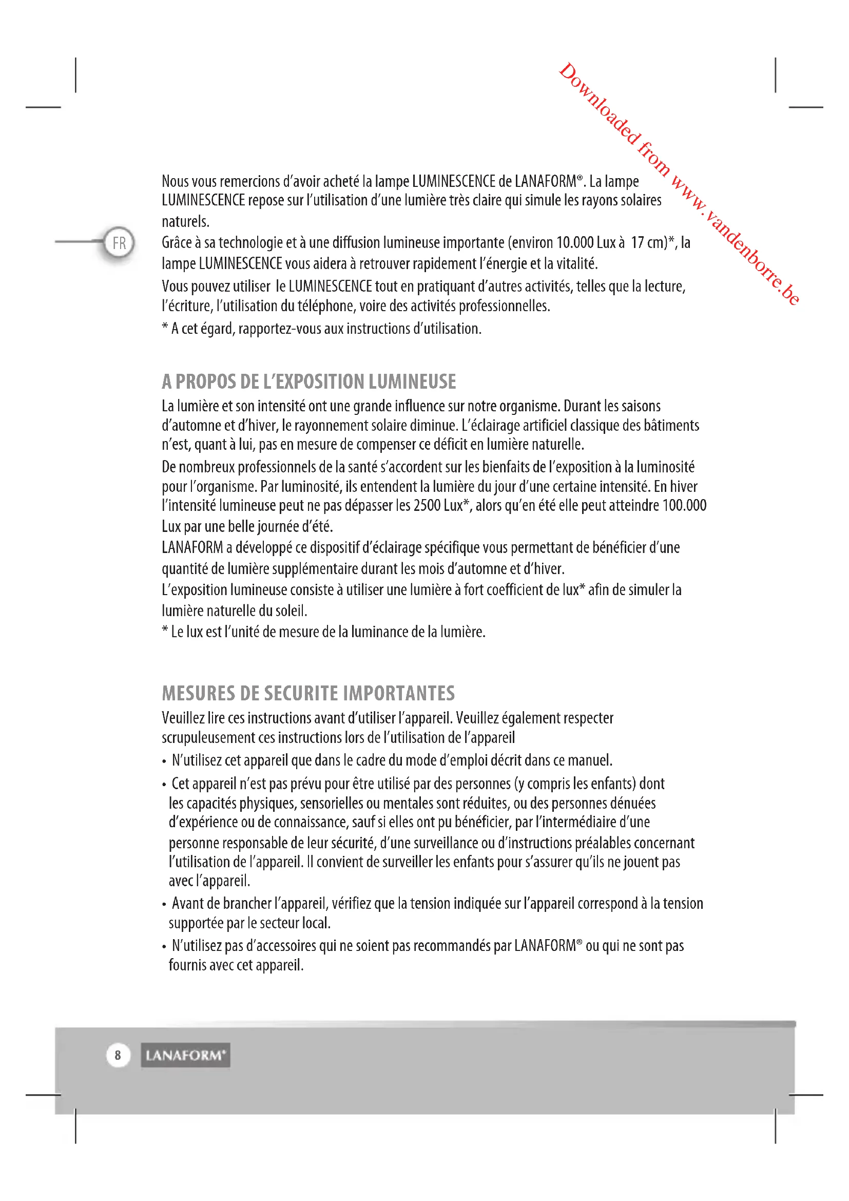 Downloaded from www.vandenborre.beNous vous remercions d’avoir acheté la lampe LUMINESCENCE de LANAFORM®. La lampe LUMINESCENCE repose sur l’utilisation d’une lumière très claire qui simule les rayons solaires naturels. Grâce à sa technologie et à une diffusion lumineuse importante (environ 10.000 Lux à 17 cm)*, la lampe LUMINESCENCE vous aidera à retrouver rapidement l’énergie et la vitalité. Vous pouvez utiliser le LUMINESCENCE tout en pratiquant d’autres activités, telles que la lecture, l’écriture, l’utilisation du téléphone, voire des activités professionnelles.