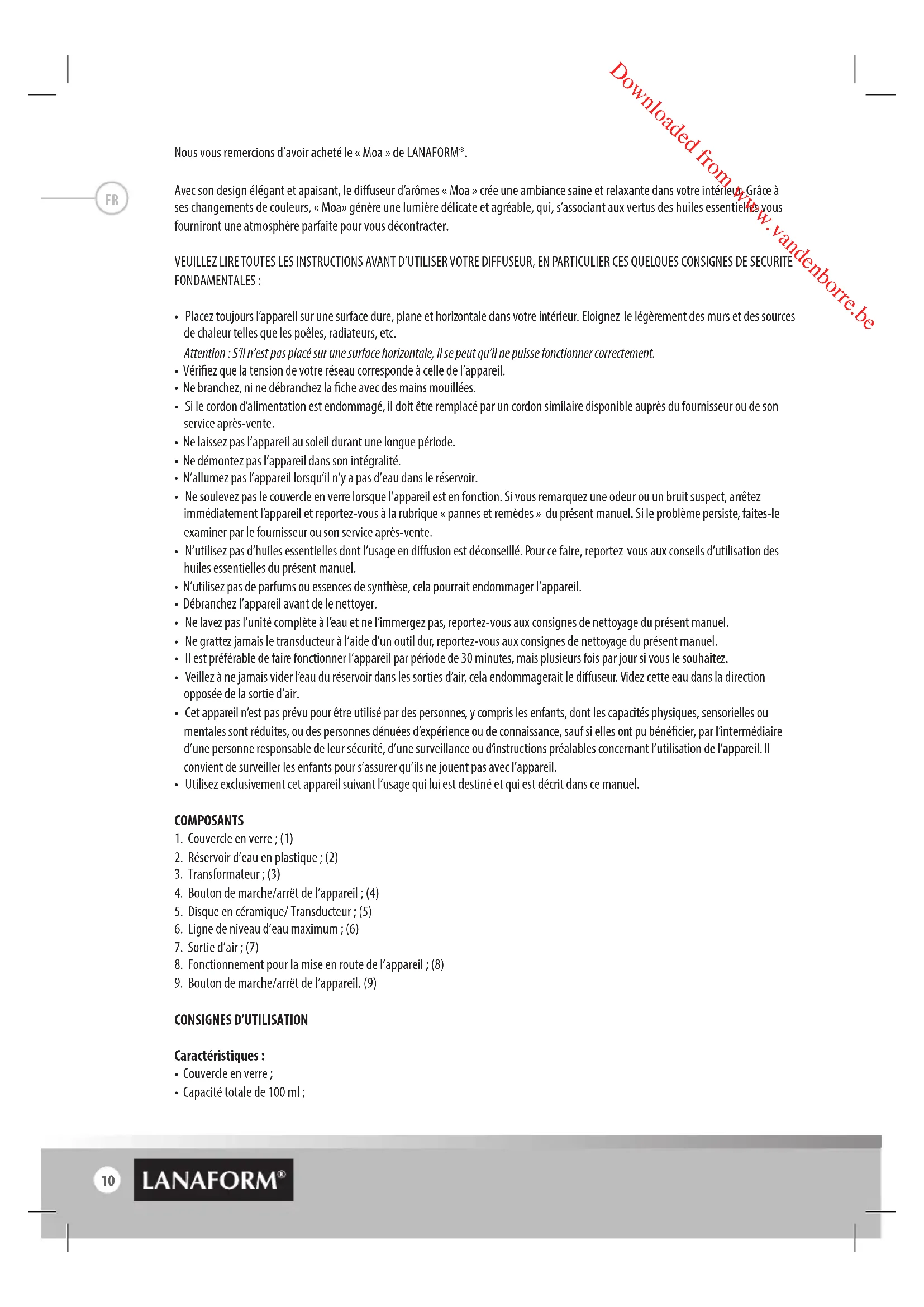 Downloaded from www.vandenborre.be10 Nous vous remercions d’avoir acheté le « Moa » de LANAFORM®. Avec son design élégant et apaisant, le diuseur d’arômes « Moa » crée une ambiance saine et relaxante dans votre intérieur. Grâce à ses changements de couleurs, « Moa» génère une lumière délicate et agréable, qui, s’associant aux vertus des huiles essentielles vous fourniront une atmosphère parfaite pour vous décontracter. VEUILLEZ LIRE TOUTES LES INSTRUCTIONS AVANT D’UTILISER VOTRE DIFFUSEUR, EN PARTICULIER CES QUELQUES CONSIGNES DE SECURITE FONDAMENTALES :