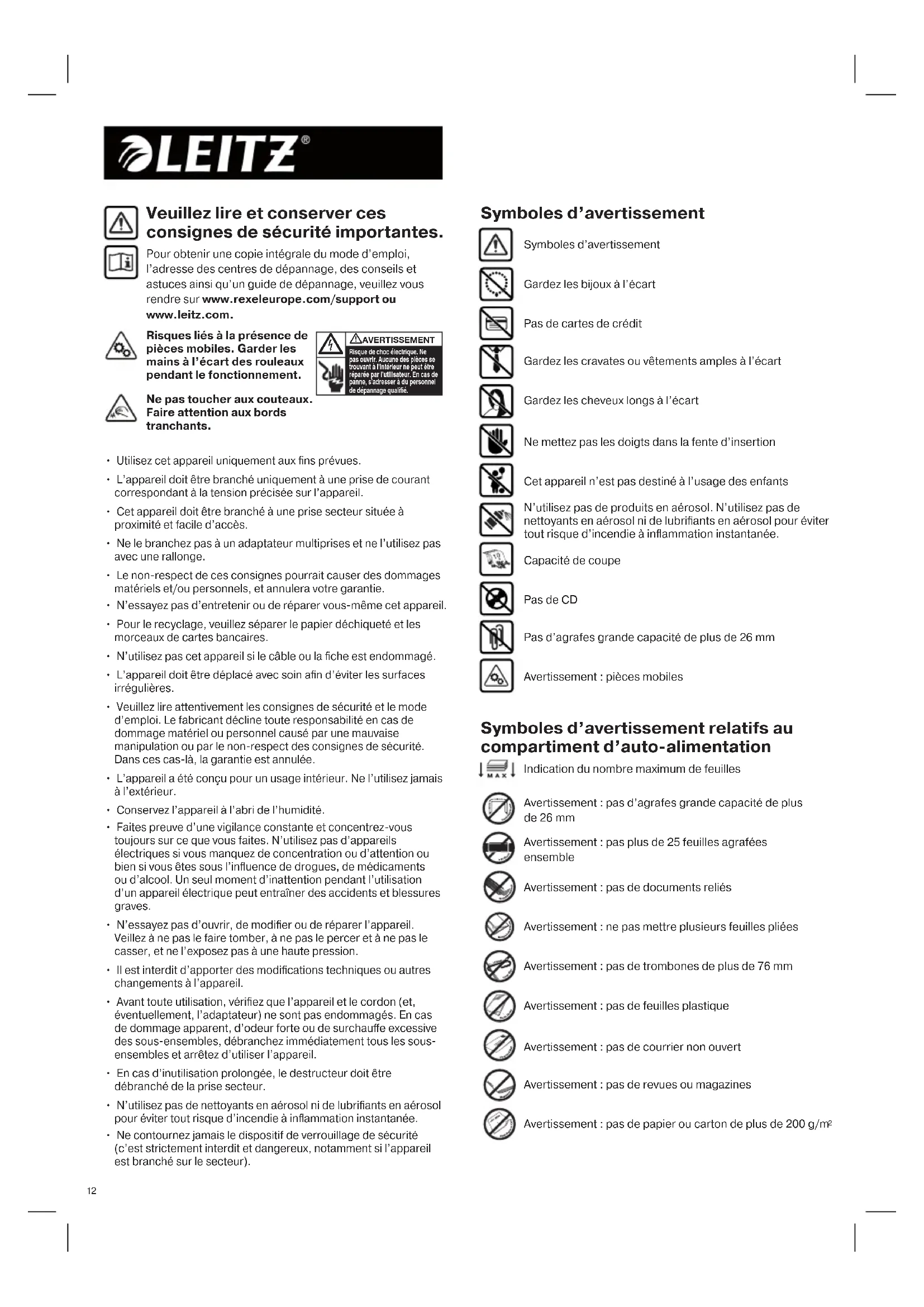 - Ne contournez jamais le dispositif de verrouillage de sécurité (c’est strictement interdit et dangereux, notamment si l’appareil est branché sur le secteur). Veuillez lire et conserver ces consignes de sécurité importantes. Pour obtenir une copie intégrale du mode d’emploi, l’adresse des centres de dépannage, des conseils et astuces ainsi qu’un guide de dépannage, veuillez vous rendre sur www.rexeleurope.com/support ou www.leitz.com. Gardez les bijoux à l’écart Symboles d’avertissement Symboles d’avertissement Ne pas toucher aux couteaux. Faire attention aux bords tranchants. Risques liés à la présence de pièces mobiles. Garder les mains à l’écart des rouleaux pendant le fonctionnement.