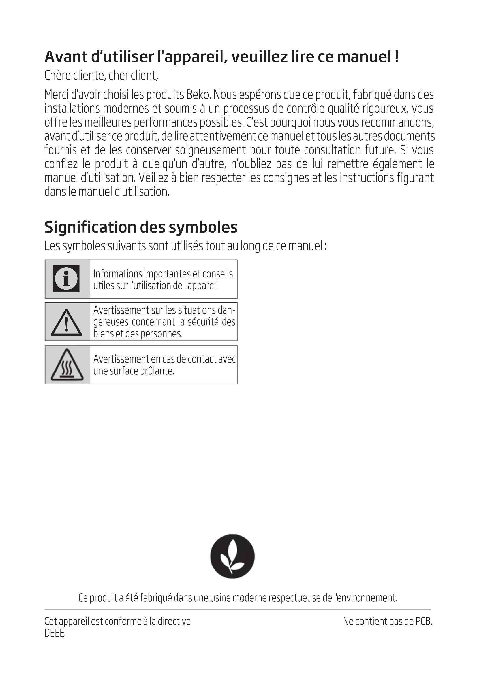 oven is dirty. Refer to “Cleaning and Maintenance" section to clean dirty parts.Avant d'utiliser l'appareil, veuillez lire ce manuel ! Chère cliente, cher client, Merci d’avoir choisi les produits Beko. Nous espérons que ce produit, fabriqué dans des installations modernes et soumis à un processus de contrôle qualité rigoureux, vous offre les meilleures performances possibles. C’est pourquoi nous vous recommandons, avant d’utiliser ce produit, de lire attentivement ce manuel et tous les autres documents fournis et de les conserver soigneusement pour toute consultation future. Si vous confiez le produit à quelqu’un d’autre, n’oubliez pas de lui remettre également le manuel d’utilisation. Veillez à bien respecter les consignes et les instructions figurant dans le manuel d’utilisation. Signification des symboles Les symboles suivants sont utilisés tout au long de ce manuel :