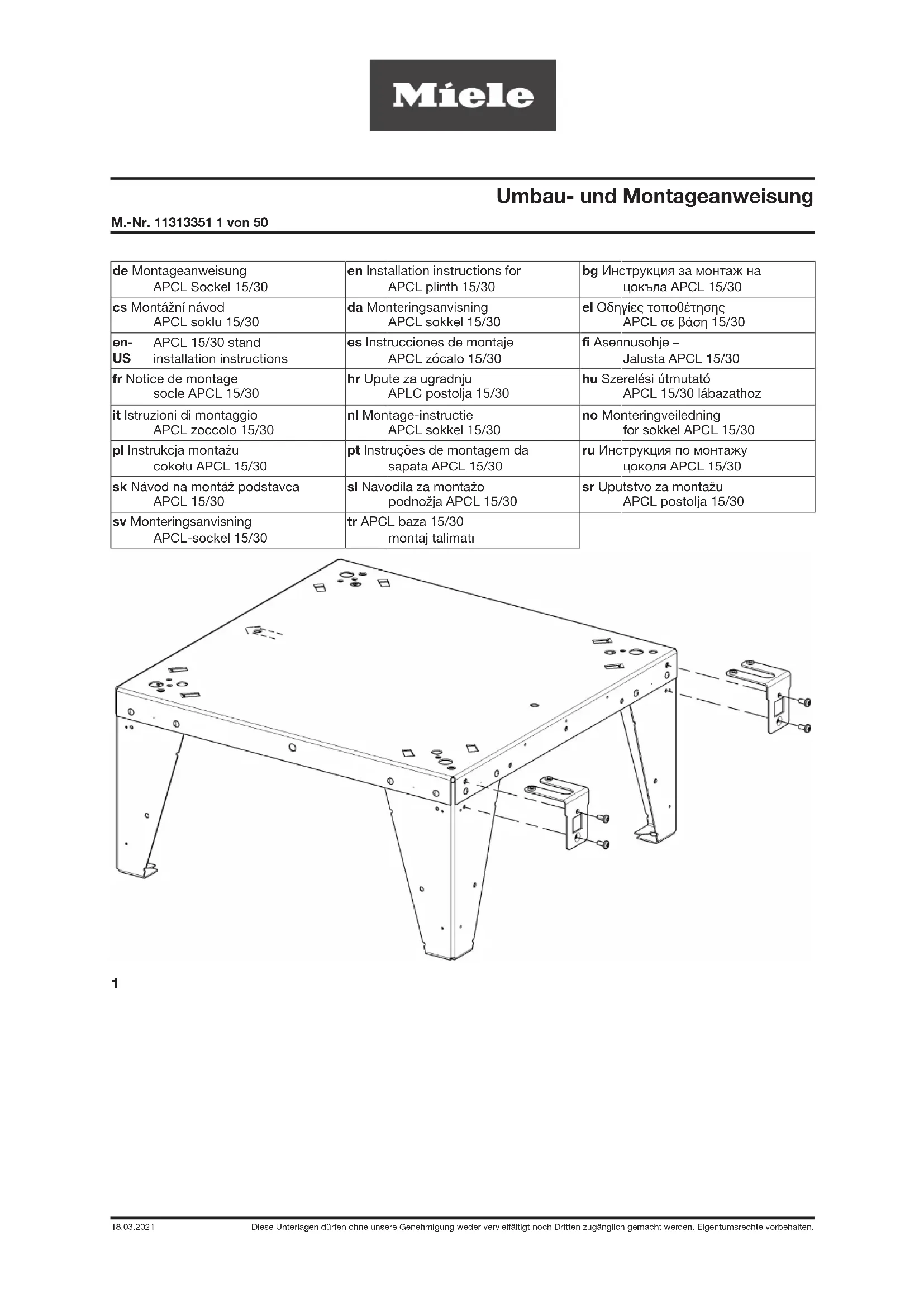 Notice de montage socle APCL 15/30 Motif: Le socle permet d'atteindre une hauteur de travail plus ergonomique pour un lave-linge ou un sèche-linge. Pièces fournies Nombre N° Mat. Dénomination 1 Socle 2 Patte de fixation 4 Rondelle B6,4 2 Vis à six pans M6x30 4 Écrou à six pans M6 4 Cheville S12 4 Rondelle 8,4 4 Vis à bois à six pans creux 8x65 8 Rondelle 15x44x3 8 Support 2 Plaque de serrage 4 Vis à tête bombée CEM 6x12 2 Vis à six pans M6x20 1 Paroi avant (uniquement socle fermé) 2 Paroi latérale (uniquement socle fermé) 12 Vis à tête bombée M4x25 (uniquement socle fermé) Danger en cas de travaux de maintenance non conformes AVERTISSEMENT Danger en cas de travaux de maintenance non conformes. Des travaux de maintenance non conformes peuvent causer des dommages matériels élevés ainsi que de graves blessures avec conséquences mortelles. A Les travaux de maintenance doivent être exécutés uniquement par un électricien qualifié possédant la formation, les connaissances et l'expérience professionnelles adéquates. A Les consignes de sécurité en vigueur doivent être respectées. A Lire la documentation technique du Service (TSD) avant d'agir. Mesures à prendre avant la réalisation de travaux de maintenance sur l’appareil - Effectuer un contrôle de sécurité électrique. - Débrancher tous les câbles raccordant l'appareil à l'installation comme indiqué dans le mode d'emploi. Mesures à respecter après la réalisation des travaux de maintenance sur l'appareil - Effectuer un contrôle de sécurité électrique. - Contrôler le fonctionnement de l'appareil.Umbau- und Montageanweisung M.-Nr. 11313351 24 von 50 Diese Unterlagen dürfen ohne unsere Genehmigung weder vervielfältigt noch Dritten zugänglich gemacht werden. Eigentumsrechte vorbehalten. 18.03.2021 Risque de coupure lors des travaux d'entretien AVERTISSEMENT Les composants peuvent présenter des arêtes vives liées à la fabrication. Risque de coupure lors des travaux d'entretien A Pour se protéger des risques de coupure, porter des gants de protection. Risque de blessures dus à un effort physique excessif AVERTISSEMENT Risque de blessures dus à un effort physique excessif Blessure au niveau de la colonne vertébrale. A Prendre en compte le poids des appareils et ne pas surestimer sa force. Voir le mode d'emploi de l'appareil pour le poids de l'appareil. Préparation du socle A Visser les plaques de fixation au dos du socle à l'aide de 2vis 6x12, voir fig. 1. La flèche en relief sur le dessus du socle montre vers l'avant, voir fig. 1. A Aligner le socle sur le sol. A Marquer les trous de perçage. A Au niveau des marquages, percer des trous d'un diamètre de 12mm à environ 65mm de profondeur. A Enficher les chevilles (5) dans les trous de perçage, voir fig. 2. A Mettre le socle à niveau avec les supports joints, voir fig. 2. A Fixer le socle au sol avec les vis à bois à tête hexagonale (1), les rondelles 8,4 (2) et les rondelles 15x44x3 (3), voir Fig. 2. Installer le lave-linge sur le socle A Fixer les pattes de fixation sur le socle en utilisant les trous correspondants (1), voir fig. 3. A Pour ce faire, fixer chacune des pattes de fixation au socle à l'aide d'une vis à six pans M6x30 (1), de 2rondelles galvanisées B6,4 (2) et d'un écrou à six pans M6 (3). Ne pas encore serrer les écrous, voir fig. 4. A Retirer les pieds du lave-linge d'au moins 5mm. A Placer le lave-linge sur le socle et pousser à l'aide des pieds arrières dans les plaques de fixation. A Ajuster le lave-linge définitivement sur le socle. A Fixer le lave-linge à l'aide des pattes de fixation sur les pieds avant, voir fig. 4. A Bloquer chaque écrou avec un contre-écrou M6 (4), voir Fig. 4. A Visser et serrer 1 vis chacune (1) M6x20 dans les plaques de fixation, voir fig. 5. Monter le sèche-linge sur le socle A Dévisser les pieds du sèche-linge d'au moins 5mm. A Placer le sèche-linge sur le socle et pousser à l'aide des pieds arrières dans les plaques de fixation. A Ajuster le sèche-linge définitivement sur le socle. A Visser et serrer 1 vis chacune (1) M6x20 dans les plaques de fixation, voir fig. 6. Monter les parois du socle A Visser les deux parois latérales avec 4vis respectivement M4x25, voir fig. 7.Umbau- und Montageanweisung M.-Nr. 11313351 25 von 50 Diese Unterlagen dürfen ohne unsere Genehmigung weder vervielfältigt noch Dritten zugänglich gemacht werden. Eigentumsrechte vorbehalten. 18.03.2021 A Visser la paroi avant avec 4 vis M4x25, voir fig. 7.