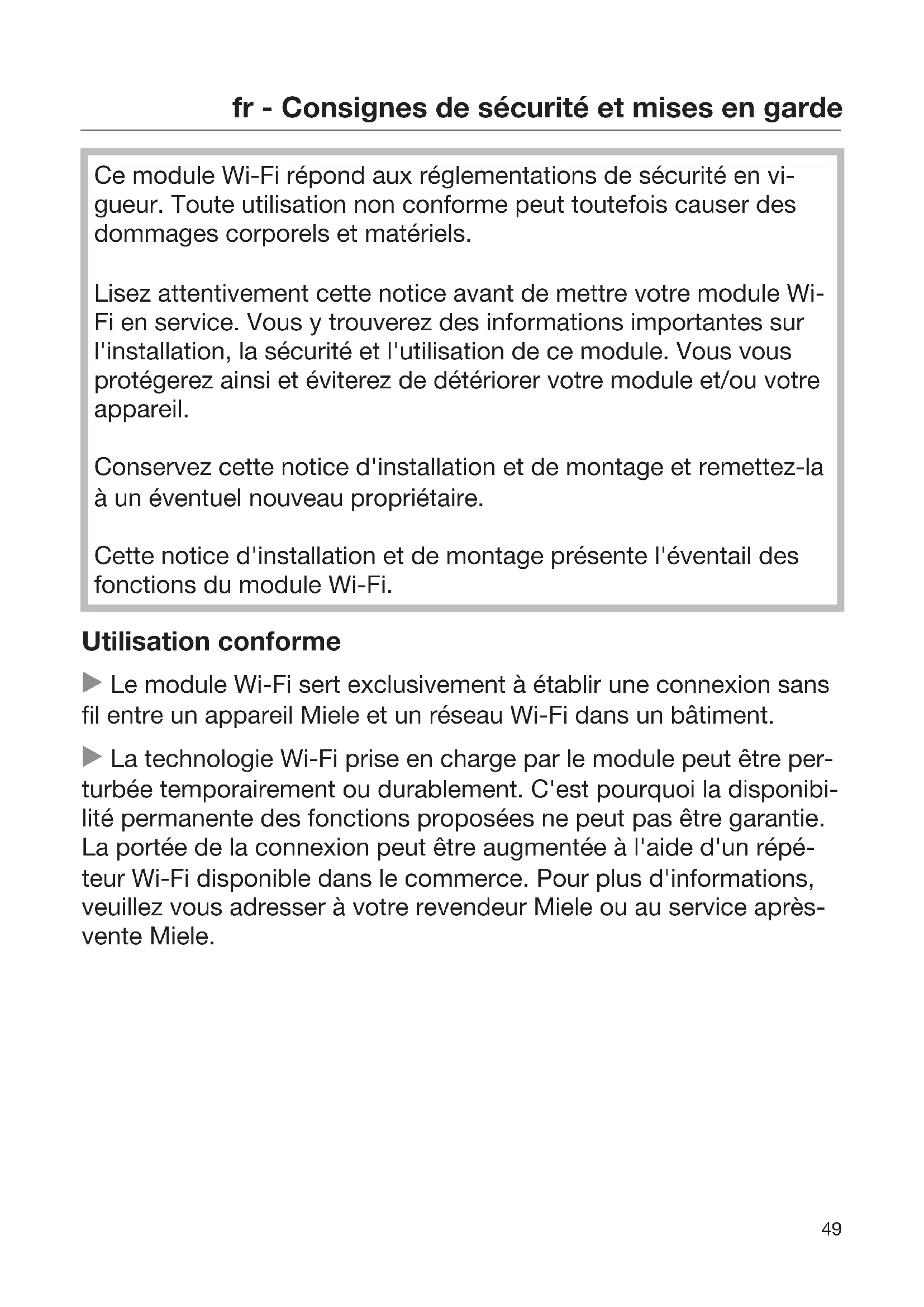 Ce module Wi-Fi répond aux réglementations de sécurité en vi- gueur. Toute utilisation non conforme peut toutefois causer des dommages corporels et matériels. Lisez attentivement cette notice avant de mettre votre module Wi- Fi en service. Vous y trouverez des informations importantes sur l'installation, la sécurité et l'utilisation de ce module. Vous vous protégerez ainsi et éviterez de détériorer votre module et/ou votre appareil. Conservez cette notice d'installation et de montage et remettez-la à un éventuel nouveau propriétaire. Cette notice d'installation et de montage présente l'éventail des fonctions du module Wi-Fi. Utilisation conforme Le module Wi-Fi sert exclusivement à établir une connexion sans fil entre un appareil Miele et un réseau Wi-Fi dans un bâtiment. La technologie Wi-Fi prise en charge par le module peut être per- turbée temporairement ou durablement. C'est pourquoi la disponibi- lité permanente des fonctions proposées ne peut pas être garantie. La portée de la connexion peut être augmentée à l'aide d'un répé- teur Wi-Fi disponible dans le commerce. Pour plus d'informations, veuillez vous adresser à votre revendeur Miele ou au service après- vente Miele.fr - Consignes de sécurité et mises en garde