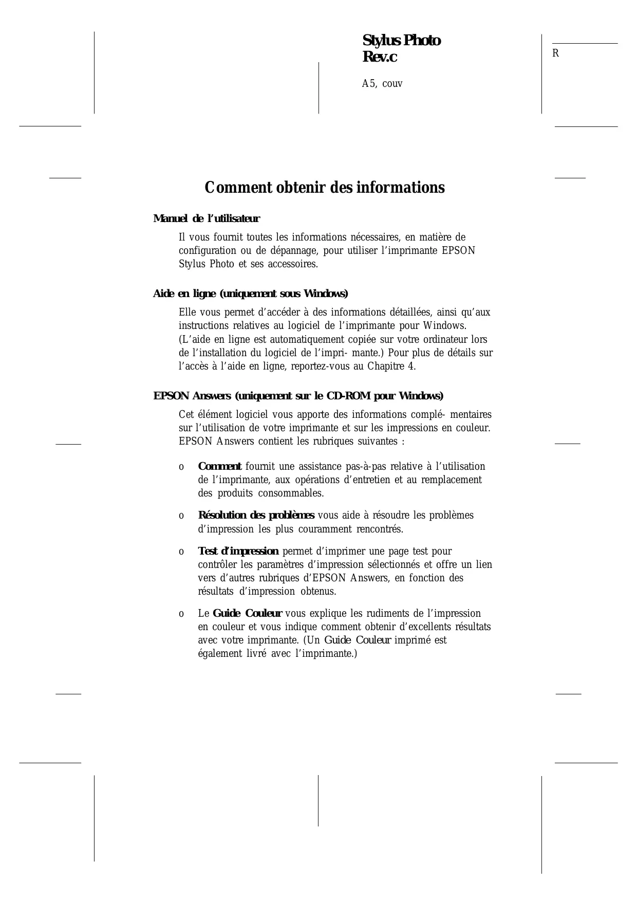 Stylus Photo Rev.c A5, couv Comment obtenir des informations Manuel de l’utilisateur Il vous fournit toutes les informations nécessaires, en matière de configuration ou de dépannage, pour utiliser l’imprimante EPSON Stylus Photo et ses accessoires. Aide en ligne (uniquement sous Windows) Elle vous permet d’accéder à des informations détaillées, ainsi qu’aux instructions relatives au logiciel de l’imprimante pour Windows. (L’aide en ligne est automatiquement copiée sur votre ordinateur lors de l’installation du logiciel de l’impri- mante.) Pour plus de détails sur l’accès à l’aide en ligne, reportez-vous au Chapitre 4. EPSON Answers (uniquement sur le CD-ROM pour Windows) Cet élément logiciel vous apporte des informations complé- mentaires sur l’utilisation de votre imprimante et sur les impressions en couleur. EPSON Answers contient les rubriques suivantes :
