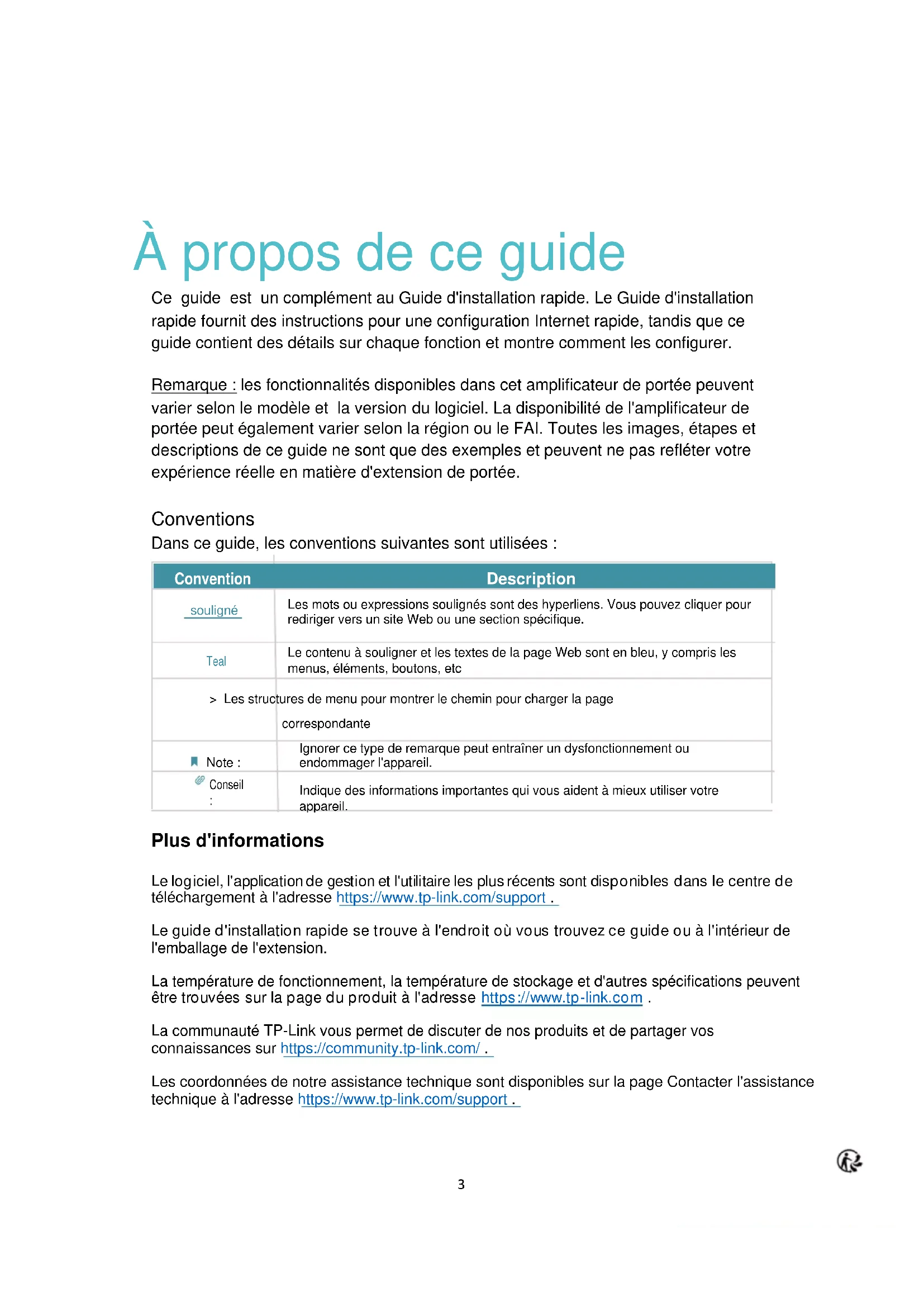 7. 7. Vérifier le journal système .......................................................................................... 46 FAQ ................................................................................................................................... 483 À propos de ce guide Ce guide est un complément au Guide d'installation rapide. Le Guide d'installation rapide fournit des instructions pour une configuration Internet rapide, tandis que ce guide contient des détails sur chaque fonction et montre comment les configurer. Remarque : les fonctionnalités disponibles dans cet amplificateur de portée peuvent varier selon le modèle et la version du logiciel. La disponibilité de l'amplificateur de portée peut également varier selon la région ou le FAI. Toutes les images, étapes et descriptions de ce guide ne sont que des exemples et peuvent ne pas refléter votre expérience réelle en matière d'extension de portée.