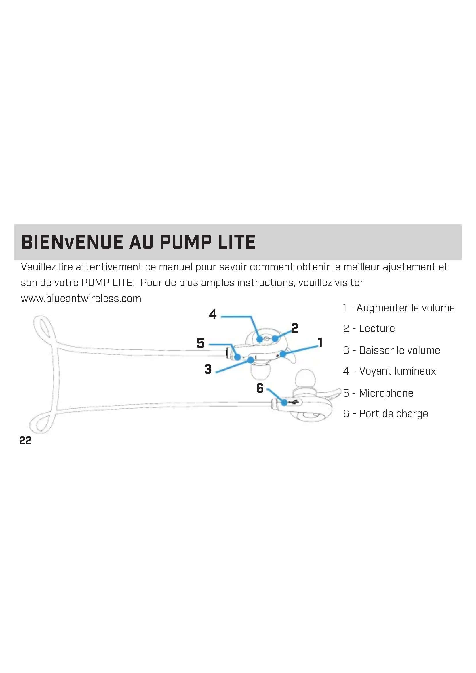 Veuillez lire attentivement ce manuel pour savoir comment obtenir le meilleur ajustement et son de votre PUMP LITE. Pour de plus amples instructions, veuillez visiter www.blueantwireless.com BIENvENUE AU PUMP LITE