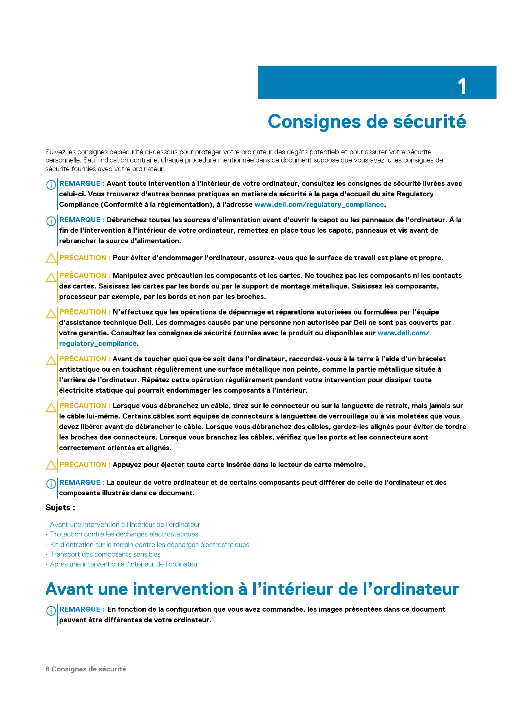 - 6 Obtenir de l’aide et contacter Dell Table des matières 5Consignes de sécurité Suivez les consignes de sécurité ci-dessous pour protéger votre ordinateur des dégâts potentiels et pour assurer votre sécurité personnelle. Sauf indication contraire, chaque procédure mentionnée dans ce document suppose que vous avez lu les consignes de sécurité fournies avec votre ordinateur. REMARQUE : Avant toute intervention à l'intérieur de votre ordinateur, consultez les consignes de sécurité livrées avec celui-ci. Vous trouverez d'autres bonnes pratiques en matière de sécurité à la page d'accueil du site Regulatory Compliance (Conformité à la réglementation), à l'adresse www.dell.com/regulatory_compliance. REMARQUE : Débranchez toutes les sources d'alimentation avant d'ouvrir le capot ou les panneaux de l'ordinateur. À la fin de l'intervention à l'intérieur de votre ordinateur, remettez en place tous les capots, panneaux et vis avant de rebrancher la source d'alimentation. PRÉCAUTION : Pour éviter d'endommager l'ordinateur, assurez-vous que la surface de travail est plane et propre. PRÉCAUTION : Manipulez avec précaution les composants et les cartes. Ne touchez pas les composants ni les contacts des cartes. Saisissez les cartes par les bords ou par le support de montage métallique. Saisissez les composants, processeur par exemple, par les bords et non par les broches. PRÉCAUTION : N’effectuez que les opérations de dépannage et réparations autorisées ou formulées par l’équipe d’assistance technique Dell. Les dommages causés par une personne non autorisée par Dell ne sont pas couverts par votre garantie. Consultez les consignes de sécurité fournies avec le produit ou disponibles sur www.dell.com/ regulatory_compliance. PRÉCAUTION : Avant de toucher quoi que ce soit dans l’ordinateur, raccordez-vous à la terre à l’aide d’un bracelet antistatique ou en touchant régulièrement une surface métallique non peinte, comme la partie métallique située à l’arrière de l’ordinateur. Répétez cette opération régulièrement pendant votre intervention pour dissiper toute électricité statique qui pourrait endommager les composants à l’intérieur. PRÉCAUTION : Lorsque vous débranchez un câble, tirez sur le connecteur ou sur la languette de retrait, mais jamais sur le câble lui-même. Certains câbles sont équipés de connecteurs à languettes de verrouillage ou à vis moletées que vous devez libérer avant de débrancher le câble. Lorsque vous débranchez des câbles, gardez-les alignés pour éviter de tordre les broches des connecteurs. Lorsque vous branchez les câbles, vérifiez que les ports et les connecteurs sont correctement orientés et alignés. PRÉCAUTION : Appuyez pour éjecter toute carte insérée dans le lecteur de carte mémoire. REMARQUE : La couleur de votre ordinateur et de certains composants peut différer de celle de l'ordinateur et des composants illustrés dans ce document. Sujets : p. 92