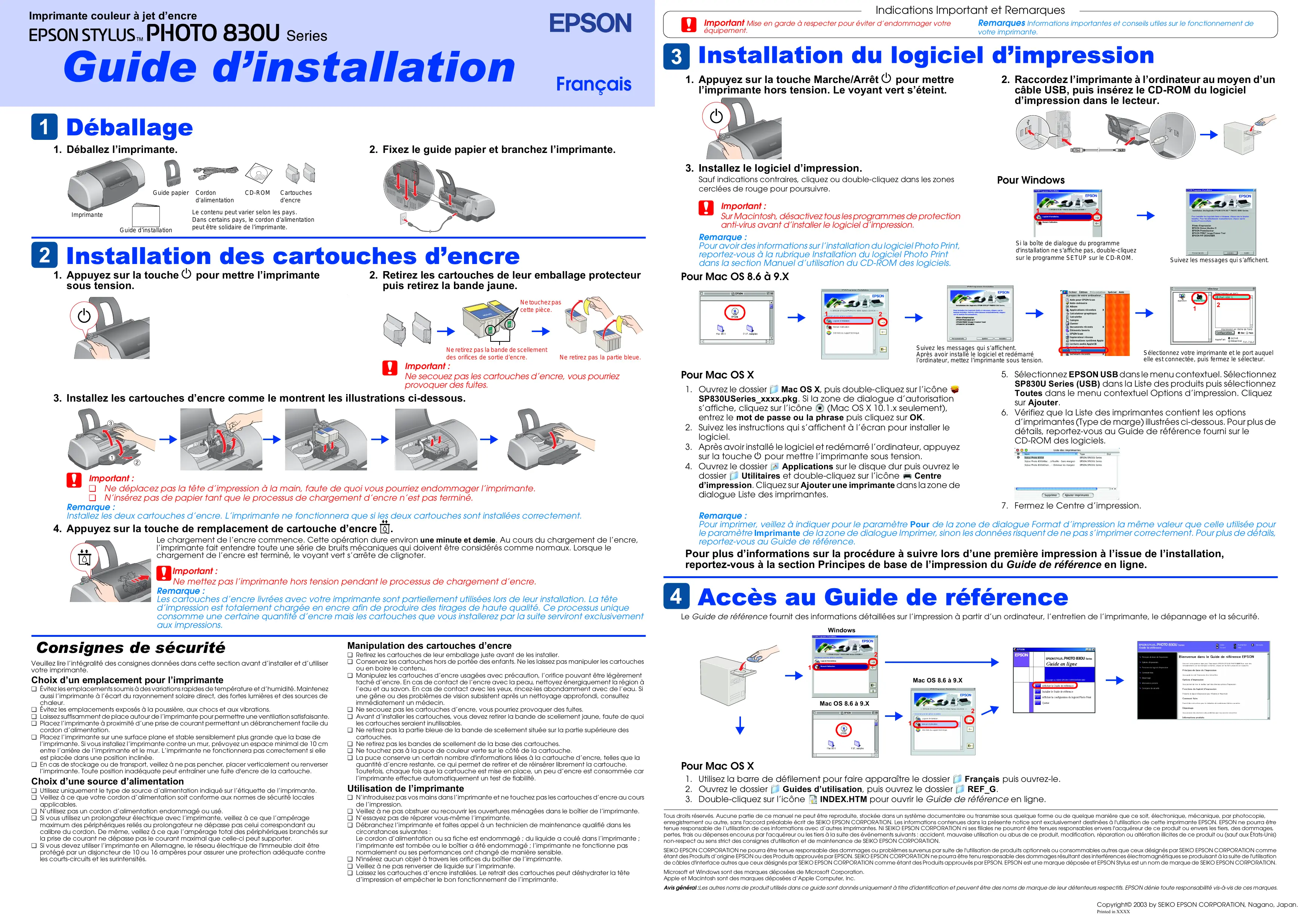 INDEX.HTM pour ouvrir le Guide de référence en ligne. Tous droits réservés. Aucune partie de ce manuel ne peut être reproduite, stockée dans un système documentaire ou transmise sous quelque forme ou de quelque manière que ce soit, électronique, mécanique, par photocopie, enregistrement ou autre, sans l'accord préalable écrit de SEIKO EPSON CORPORATION. Les informations contenues dans la présente notice sont exclusivement destinées à l'utilisation de cette imprimante EPSON. EPSON ne pourra être tenue responsable de l’utilisation de ces informations avec d’autres imprimantes. Ni SEIKO EPSON CORPORATION ni ses filiales ne pourront être tenues responsables envers l'acquéreur de ce produit ou envers les tiers, des dommages, pertes, frais ou dépenses encourus par l'acquéreur ou les tiers à la suite des événements suivants : accident, mauvaise utilisation ou abus de ce produit, modification, réparation ou altération illicites de ce produit ou (sauf aux États-Unis) non-respect au sens strict des consignes d'utilisation et de maintenance de SEIKO EPSON CORPORATION. SEIKO EPSON CORPORATION ne pourra être tenue responsable des dommages ou problèmes survenus par suite de l'utilisation de produits optionnels ou consommables autres que ceux désignés par SEIKO EPSON CORPORATION comme étant des Produits d’origine EPSON ou des Produits approuvés par EPSON. SEIKO EPSON CORPORATION ne pourra être tenu responsable des dommages résultant des interférences électromagnétiques se produisant à la suite de l'utilisation de câbles d'interface autres que ceux désignés par SEIKO EPSON CORPORATION comme étant des Produits approuvés par EPSON. EPSON est une marque déposée et EPSON Stylus est un nom de marque de SEIKO EPSON CORPORATION. Microsoft et Windows sont des marques déposées de Microsoft Corporation. Apple et Macintosh sont des marques déposées d’Apple Computer, Inc. Avis général :Les autres noms de produit utilisés dans ce guide sont donnés uniquement à titre d'identification et peuvent être des noms de marque de leur détenteurs respectifs. EPSON dénie toute responsabilité vis-à-vis de ces marques. Copyright© 2003 by SEIKO EPSON CORPORATION, Nagano, Japan. Printed in XXXX