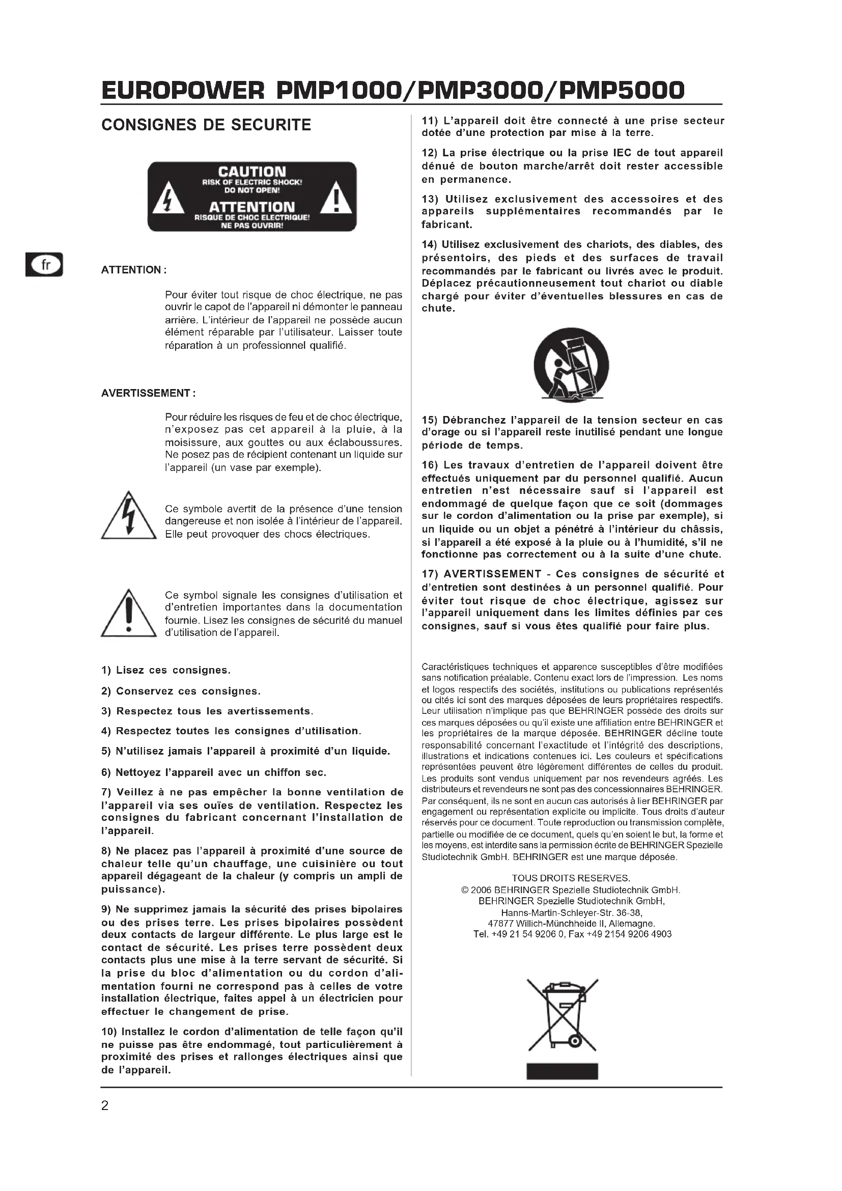 d’entretien sont destinées à un personnel qualifié. Pour éviter tout risque de choc électrique, agissez sur l’appareil uniquement dans les limites définies par ces consignes, sauf si vous êtes qualifié pour faire plus. Caractéristiques techniques et apparence susceptibles d’être modifiées sans notification préalable. Contenu exact lors de l’impression. Les noms et logos respectifs des sociétés, institutions ou publications représentés ou cités ici sont des marques déposées de leurs propriétaires respectifs. Leur utilisation n’implique pas que BEHRINGER possède des droits sur ces marques déposées ou qu’il existe une affiliation entre BEHRINGER et les propriétaires de la marque déposée. BEHRINGER décline toute responsabilité concernant l’exactitude et l’intégrité des descriptions, illustrations et indications contenues ici. Les couleurs et spécifications représentées peuvent être légèrement différentes de celles du produit. Les produits sont vendus uniquement par nos revendeurs agréés. Les distributeurs et revendeurs ne sont pas des concessionnaires BEHRINGER. Par conséquent, ils ne sont en aucun cas autorisés à lier BEHRINGER par engagement ou représentation explicite ou implicite. Tous droits d’auteur réservés pour ce document. Toute reproduction ou transmission complète, partielle ou modifiée de ce document, quels qu’en soient le but, la forme et les moyens, est interdite sans la permission écrite de BEHRINGER Spezielle Studiotechnik GmbH. BEHRINGER est une marque déposée. TOUS DROITS RESERVES. © 2006 BEHRINGER Spezielle Studiotechnik GmbH. BEHRINGER Spezielle Studiotechnik GmbH, Hanns-Martin-Schleyer-Str. 36-38, 47877 Willich-Münchheide II, Allemagne. Tel. +49 21 54 9206 0, Fax +49 2154 9206 49033
