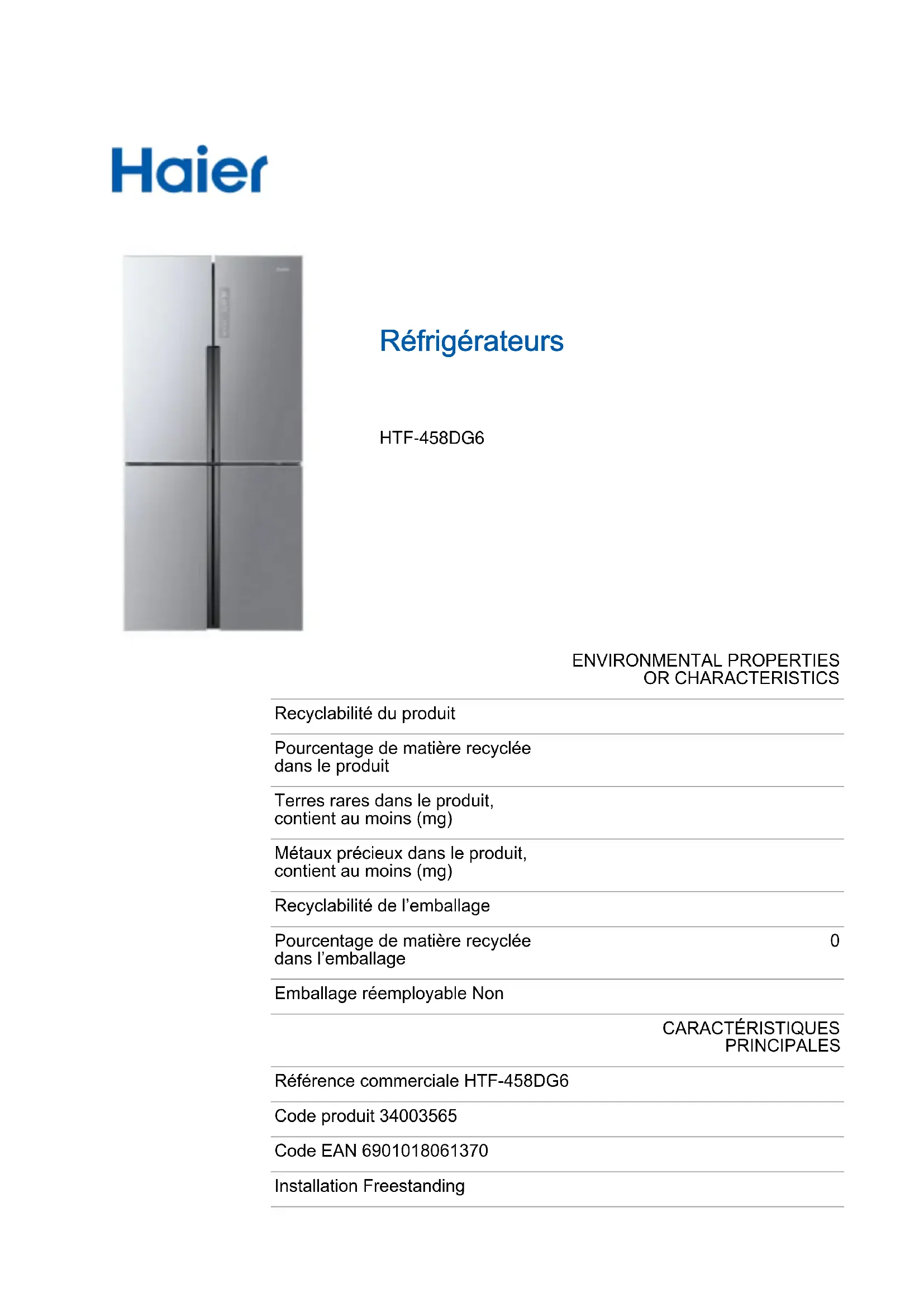 Réfrigérateurs HTF-458DG6 ENVIRONMENTAL PROPERTIES OR CHARACTERISTICS Recyclabilité du produit Pourcentage de matière recyclée dans le produit Terres rares dans le produit, contient au moins (mg) Métaux précieux dans le produit, contient au moins (mg) Recyclabilité de l’emballage Pourcentage de matière recyclée dans l’emballage