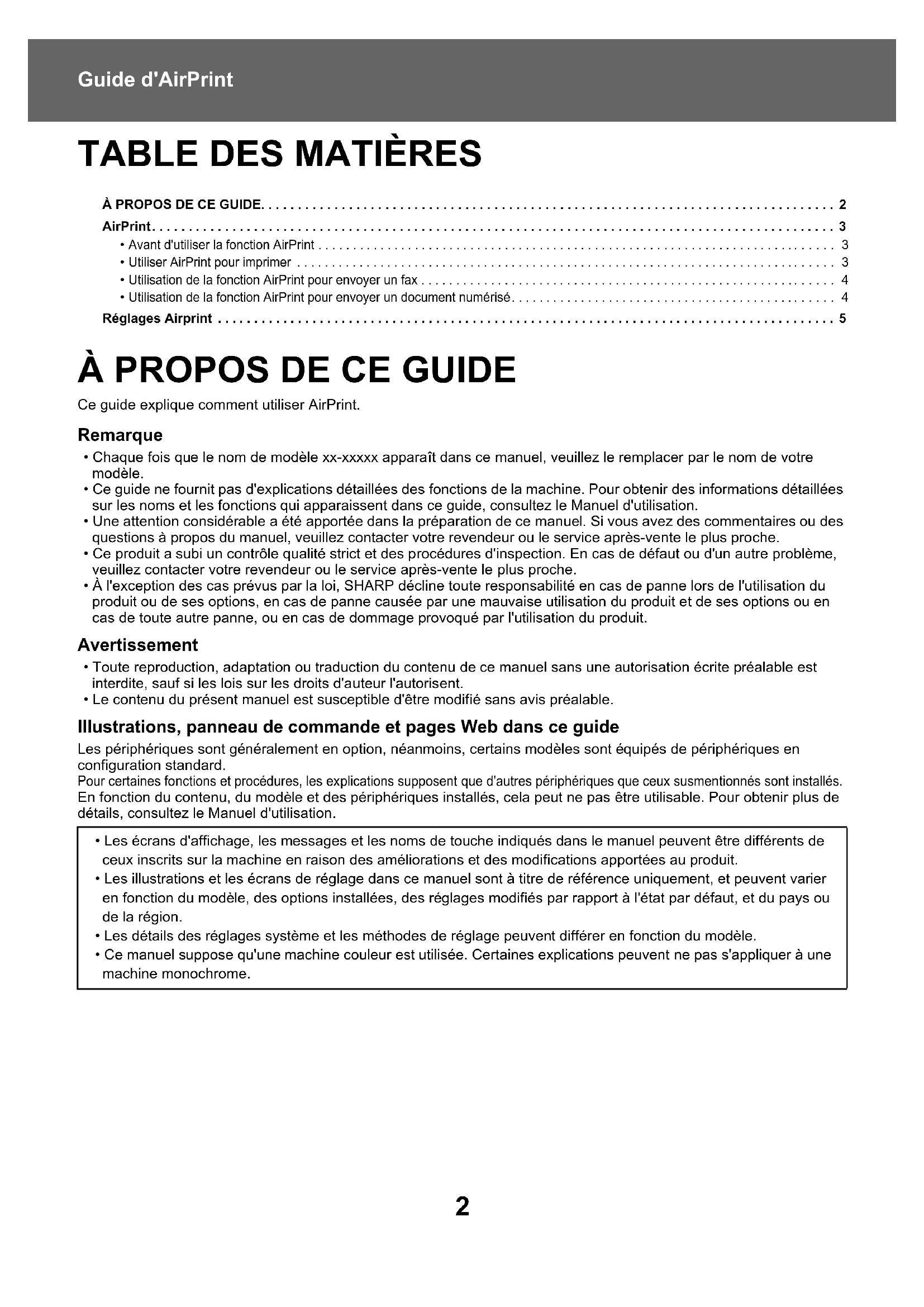 - Le contenu du présent manuel est susceptible d'être modifié sans avis préalable. Illustrations, panneau de commande et pages Web dans ce guide Les périphériques sont généralement en option, néanmoins, certains modèles sont équipés de périphériques en configuration standard. Pour certaines fonctions et procédures, les explications supposent que d'autres périphériques que ceux susmentionnés sont installés. En fonction du contenu, du modèle et des périphériques installés, cela peut ne pas être utilisable. Pour obtenir plus de détails, consultez le Manuel d'utilisation. À PROPOS DE CE GUIDE. . . . . . . . . . . . . . . . . . . . . . . . . . . . . . . . . . . . . . . . . . . . . . . . . . . . . . . . . . . . . . . . . . . . . . . . . . . . . . . 2 AirPrint. . . . . . . . . . . . . . . . . . . . . . . . . . . . . . . . . . . . . . . . . . . . . . . . . . . . . . . . . . . . . . . . . . . . . . . . . . . . . . . . . . . . . . . . . . . . . . 3