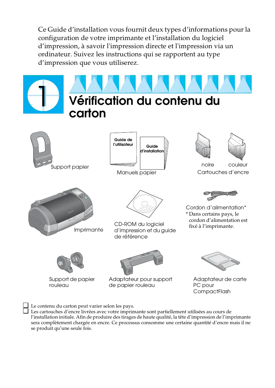 - Dans certains pays, le cordon d’alimentation est fixé à l’imprimante. Adaptateur de carte PC pour CompactFlash Le contenu du carton peut varier selon les pays. Les cartouches d’encre livrées avec votre imprimante sont partiellement utilisées au cours de l’installation initiale. Afin de produire des tirages de haute qualité, la tête d’impression de l’imprimante sera complètement chargée en encre. Ce processus consomme une certaine quantité d’encre mais il ne se produit qu’une seule fois. Déballage de l’imprimante Retirez toutes les bandes adhésives et matériaux de protection. Conservez les matériaux de protection afin de pouvoir les réutiliser, le moment venu, pour transporter l'imprimante.