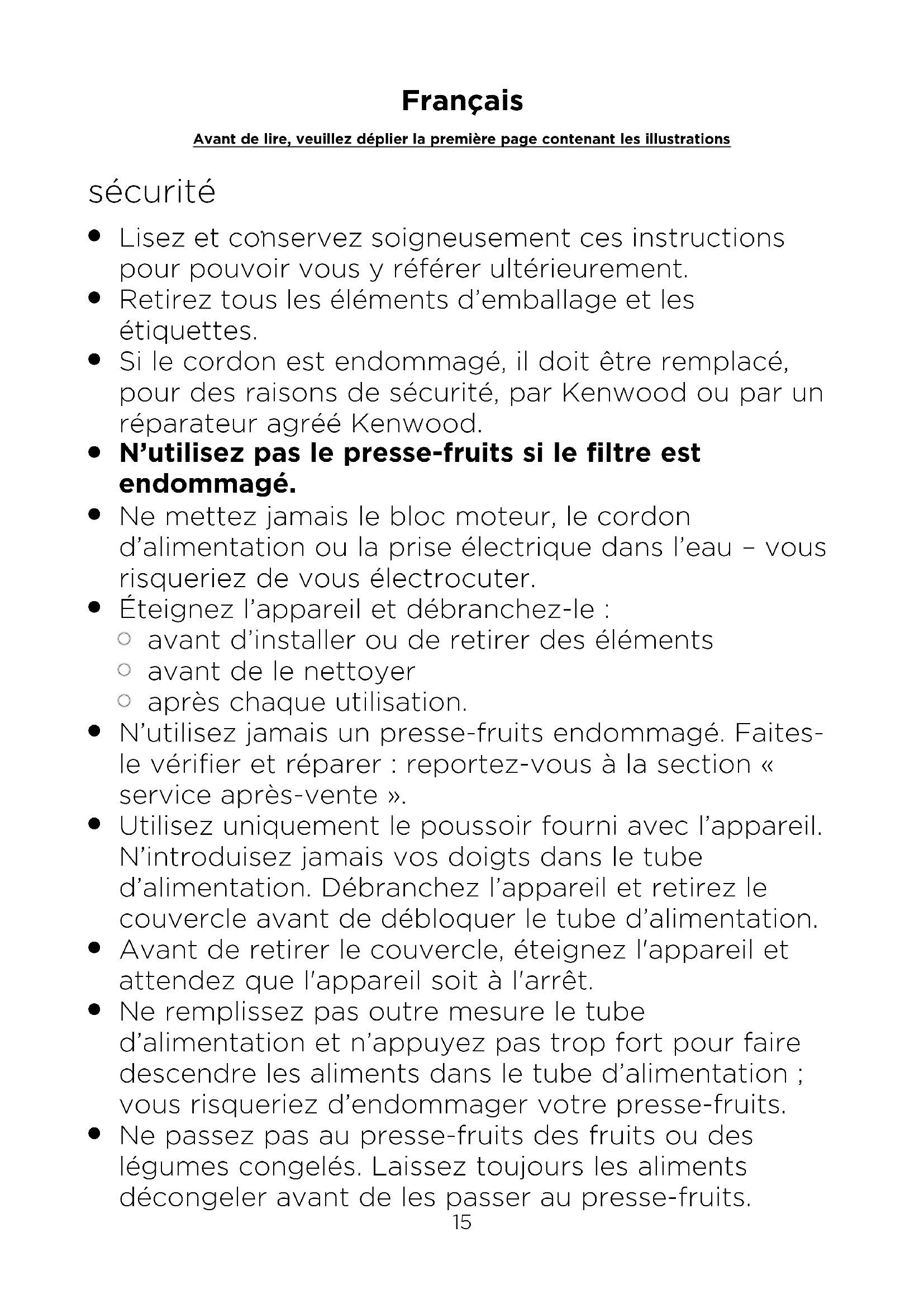 Ne passez pas au presse-fruits des fruits ou des légumes congelés. Laissez toujours les aliments décongeler avant de les passer au presse-fruits. Français Avant de lire, veuillez déplier la première page contenant les illustrations15 16